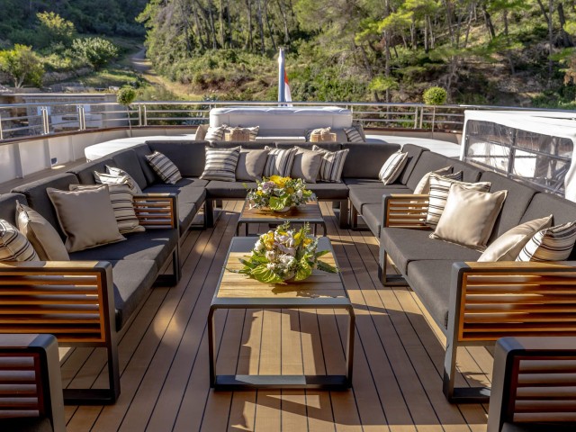 Erleben Sie die feinsten Annehmlichkeiten an Bord von M/Y Freedom. Das Sonnendeck ist Ihre persönliche Oase, komplett mit einem erfrischenden Swimmingpool, einem großen Whirlpool und einer privaten Bar. Dieser vielseitige Raum kann sich von einem ruhigen Wellness-Refugium mit Fitnessstudio und Yoga-Bereich in einen lebendigen sozialen Treffpunkt verwandeln, der sich perfekt für Unterhaltung und Cocktails unter dem Sternenhimmel eignet.