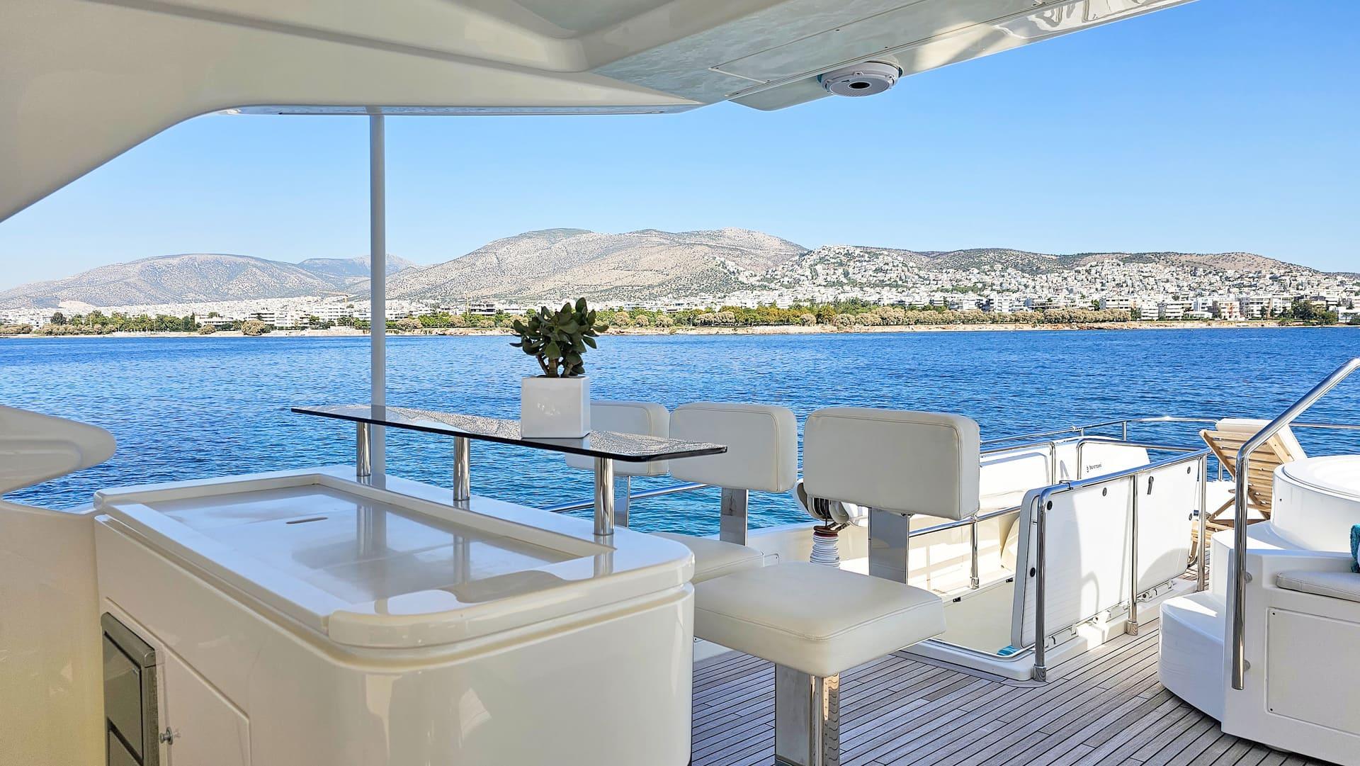 Für Sonnenliebhaber bietet Infinitas außergewöhnliche Außenbereiche. Der Jacuzzi auf dem Deck lädt zum Entspannen ein, während die Gäste die atemberaubende griechische Landschaft genießen. Großzügige Sonnenliegen, Essbereiche im Freien und gemütliche Lounge-Zonen auf dem Flybridge- und Achterdeck schaffen die perfekte Umgebung zum Entspannen und geselligen Beisammensein.