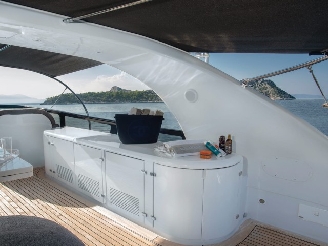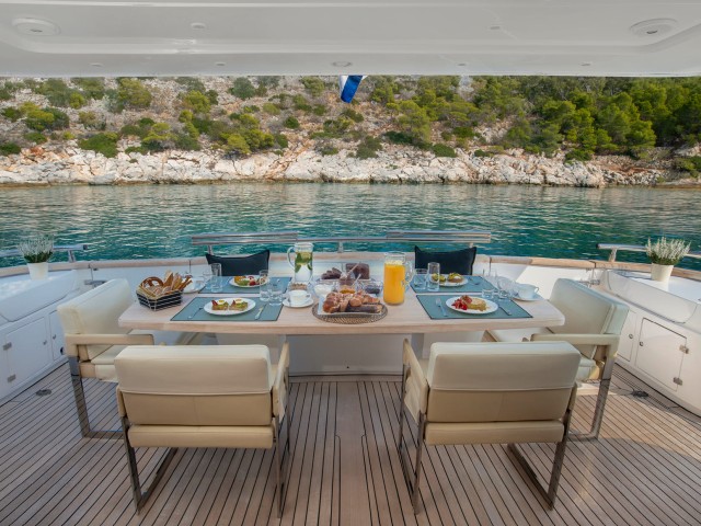 Die Außenbereiche von Irene’s sind für den Genuss im Freien konzipiert und bieten zahlreiche Möglichkeiten zum Entspannen, Essen und Sonnenbaden. Ob auf dem geräumigen Achterdeck, bei einem Abendessen unter dem Sternenhimmel oder beim Sonnenbaden auf dem Vordeck – ihre Außenbereiche schaffen den perfekten Rahmen für unvergessliche Erinnerungen.