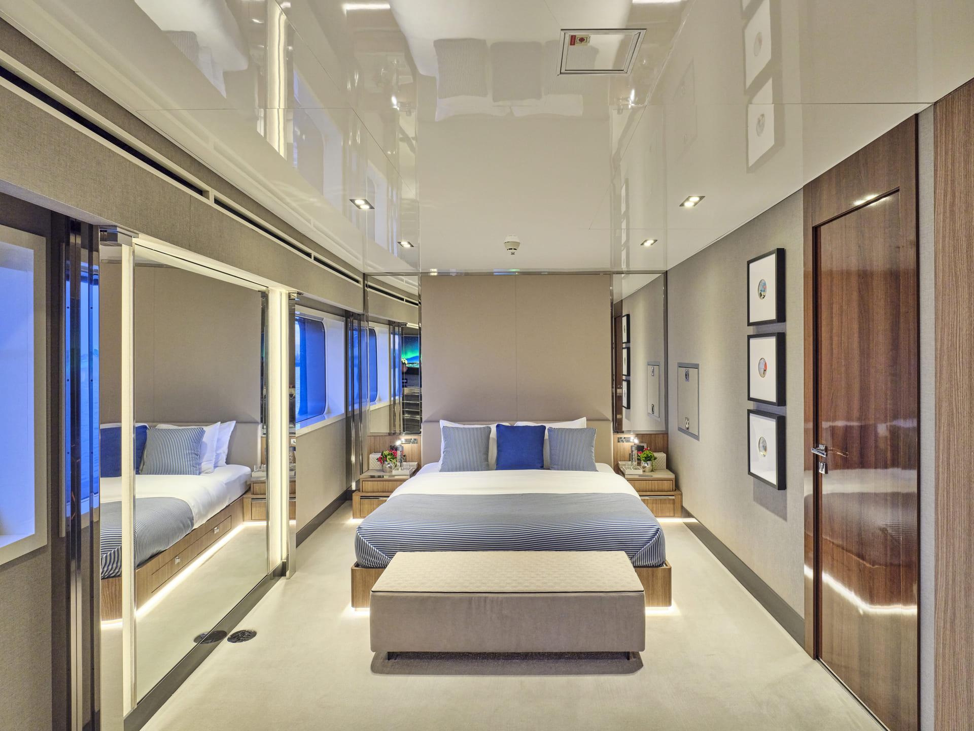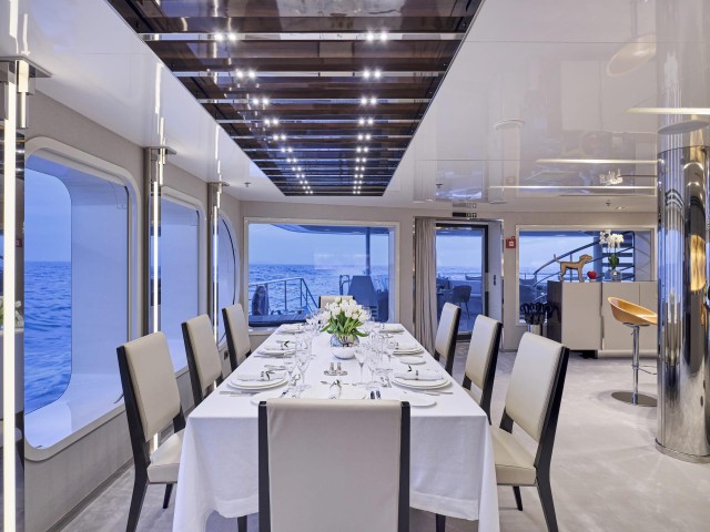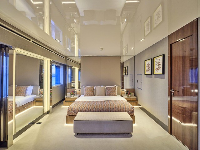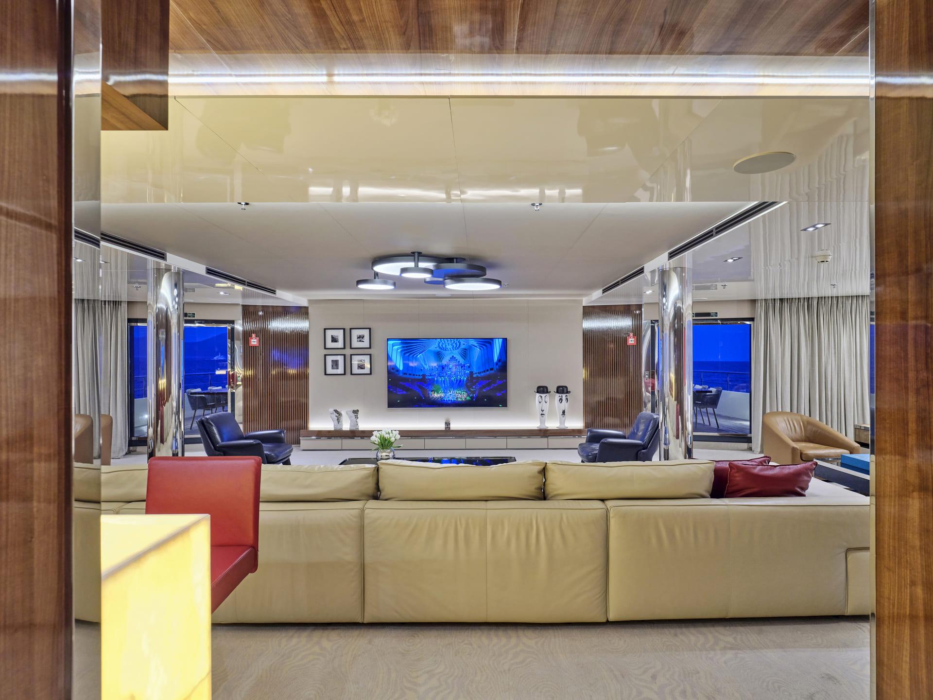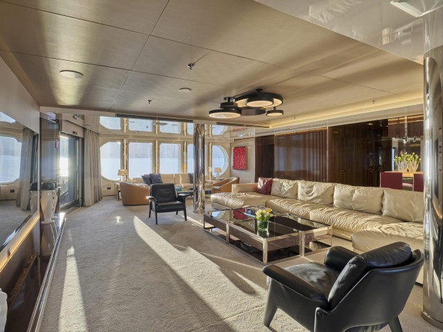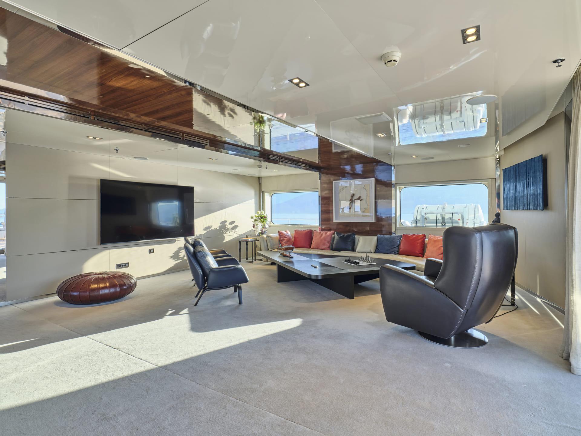 Große Fenster durchfluten die Innenräume mit Tageslicht, während das neue Interieur mit hochwertigen Möbeln, modernem Design und luxuriösen Materialien begeistert. Der Salon, der Essbereich, der private Lounge-Bereich des Eigners sowie das Kino – nun mit brandneuem Leder ausgestattet – laden zum Verweilen ein. In allen Kabinen finden sich Smart TVs, Crestron-Steuerung, neue iPads, und frische Premium-Bettwäsche. Zudem wurden vier zusätzliche Fernseher und das innovative YachtEye-Informationssystem integriert, um Gästen ein interaktives Erlebnis an Bord zu bieten.