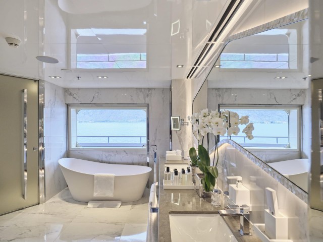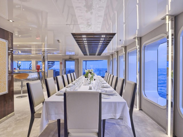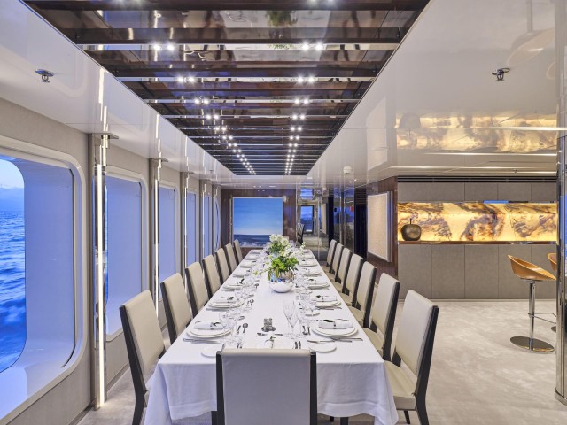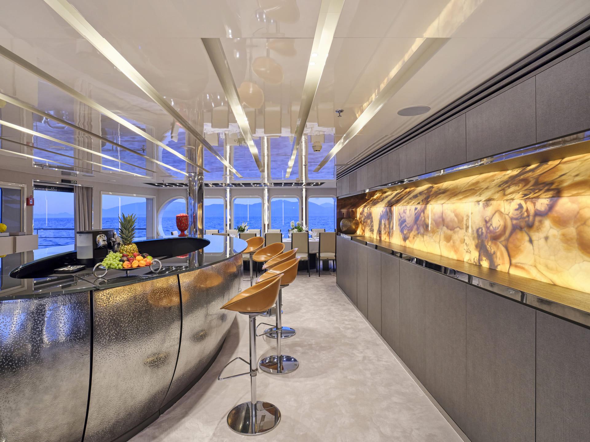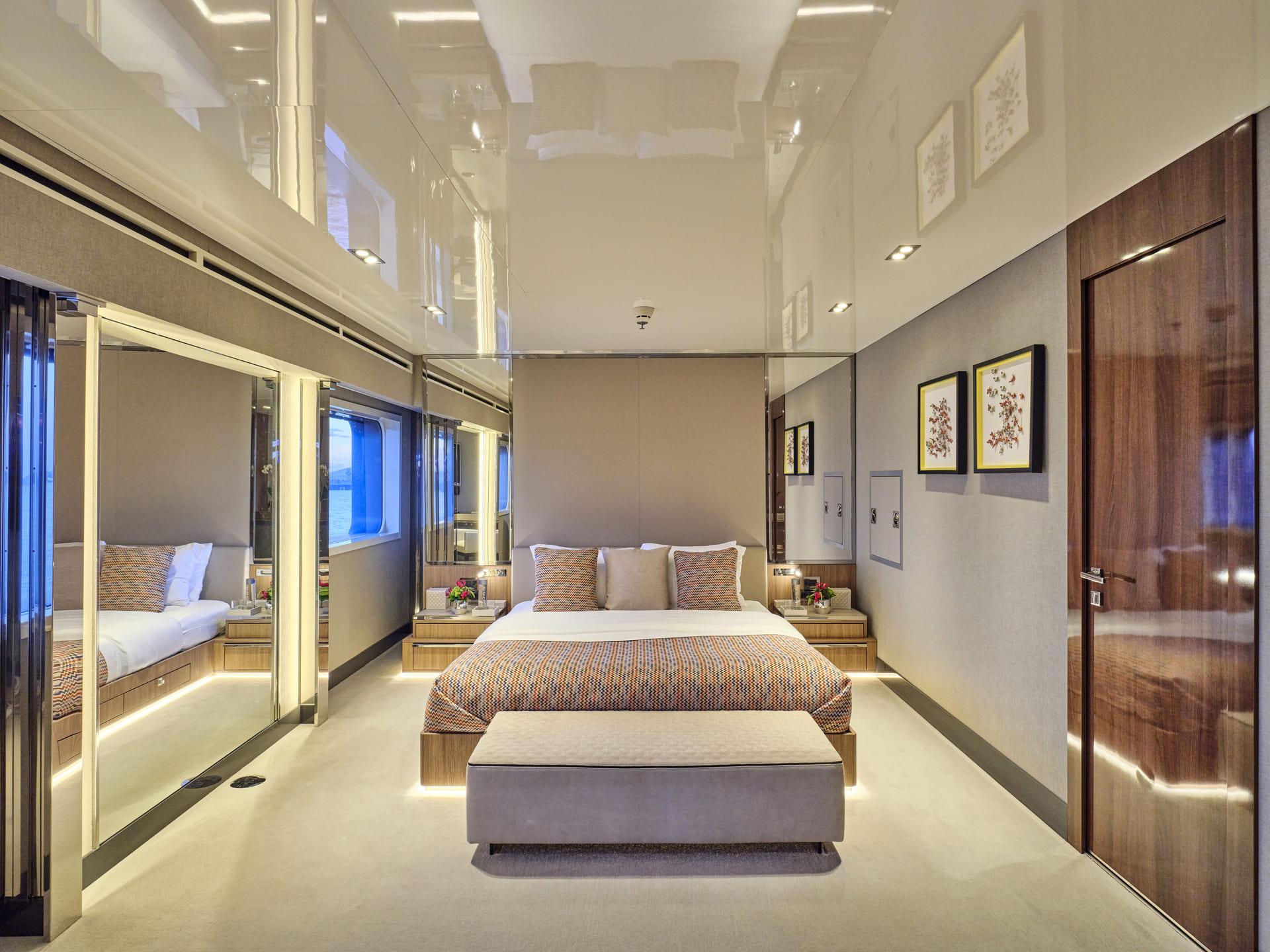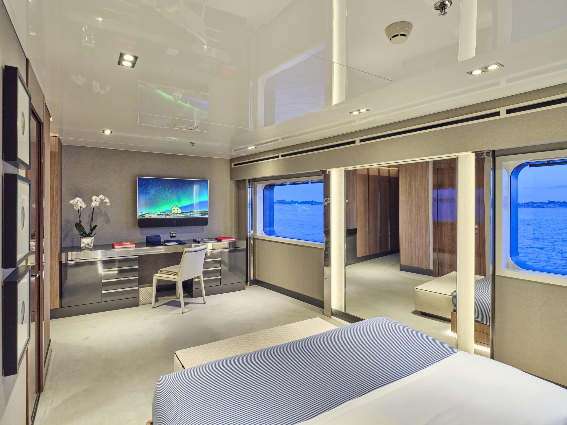 Große Fenster durchfluten die Innenräume mit Tageslicht, während das neue Interieur mit hochwertigen Möbeln, modernem Design und luxuriösen Materialien begeistert. Der Salon, der Essbereich, der private Lounge-Bereich des Eigners sowie das Kino – nun mit brandneuem Leder ausgestattet – laden zum Verweilen ein. In allen Kabinen finden sich Smart TVs, Crestron-Steuerung, neue iPads, und frische Premium-Bettwäsche. Zudem wurden vier zusätzliche Fernseher und das innovative YachtEye-Informationssystem integriert, um Gästen ein interaktives Erlebnis an Bord zu bieten.