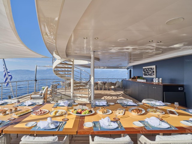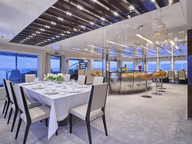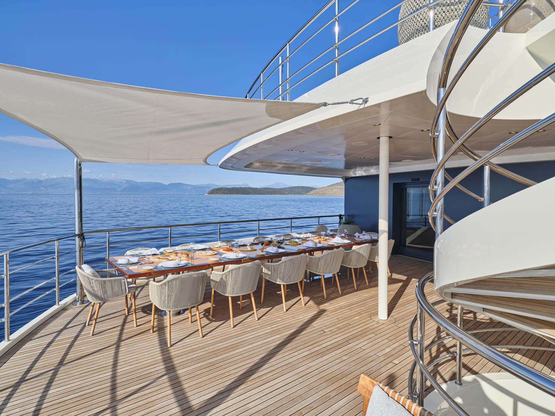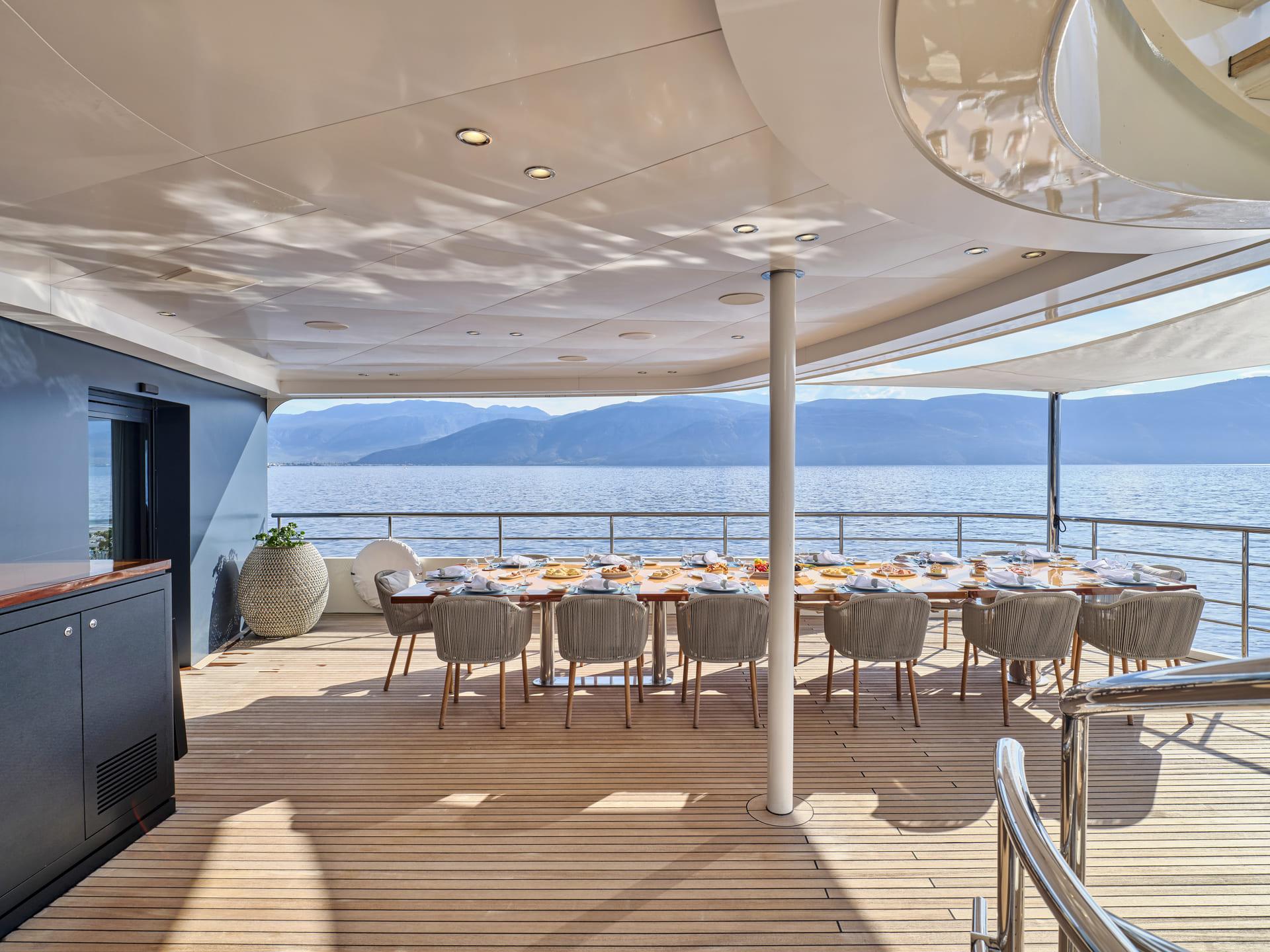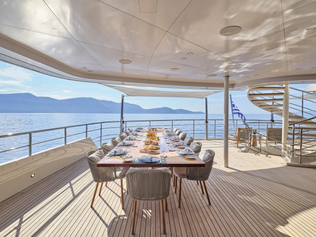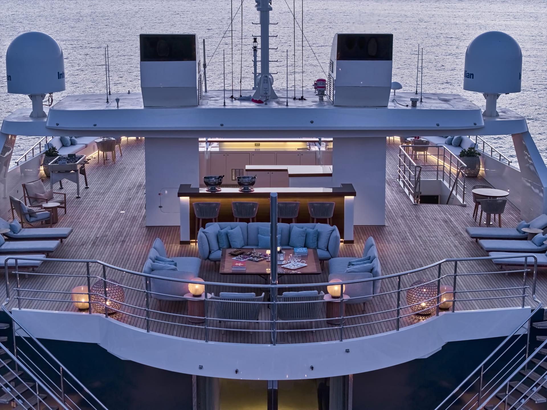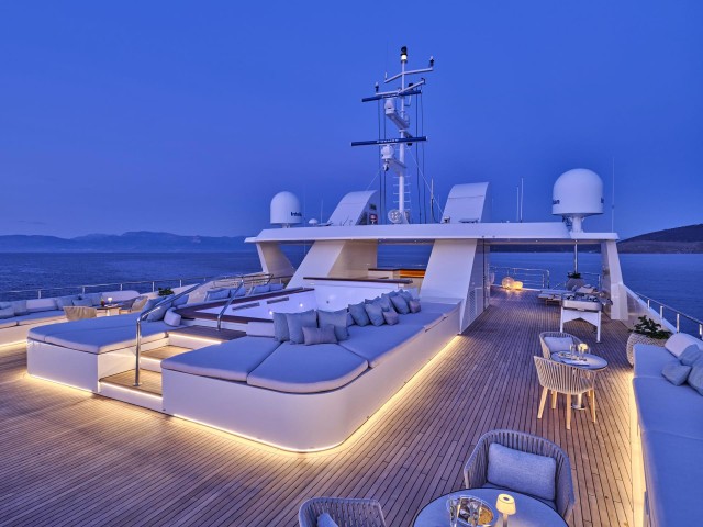 Das 300 m² große Sonnendeck wurde vollständig neugestaltet und bietet nun eine neue Sonnenschirmanlage, moderne Lounge-Möbel und eine großzügige Fläche für Yoga, Fitness oder Feiern unter freiem Himmel. Das Jacuzzi, die neu geschaffene Beach-Club-Zone und zwei großzügige Tender machen das Outdoor-Erlebnis perfekt. Als RYA-zertifiziertes Wassersportzentrum bietet Marquise eine erweiterte Auswahl an Wasserspielzeugen für aktive Chartergäste.