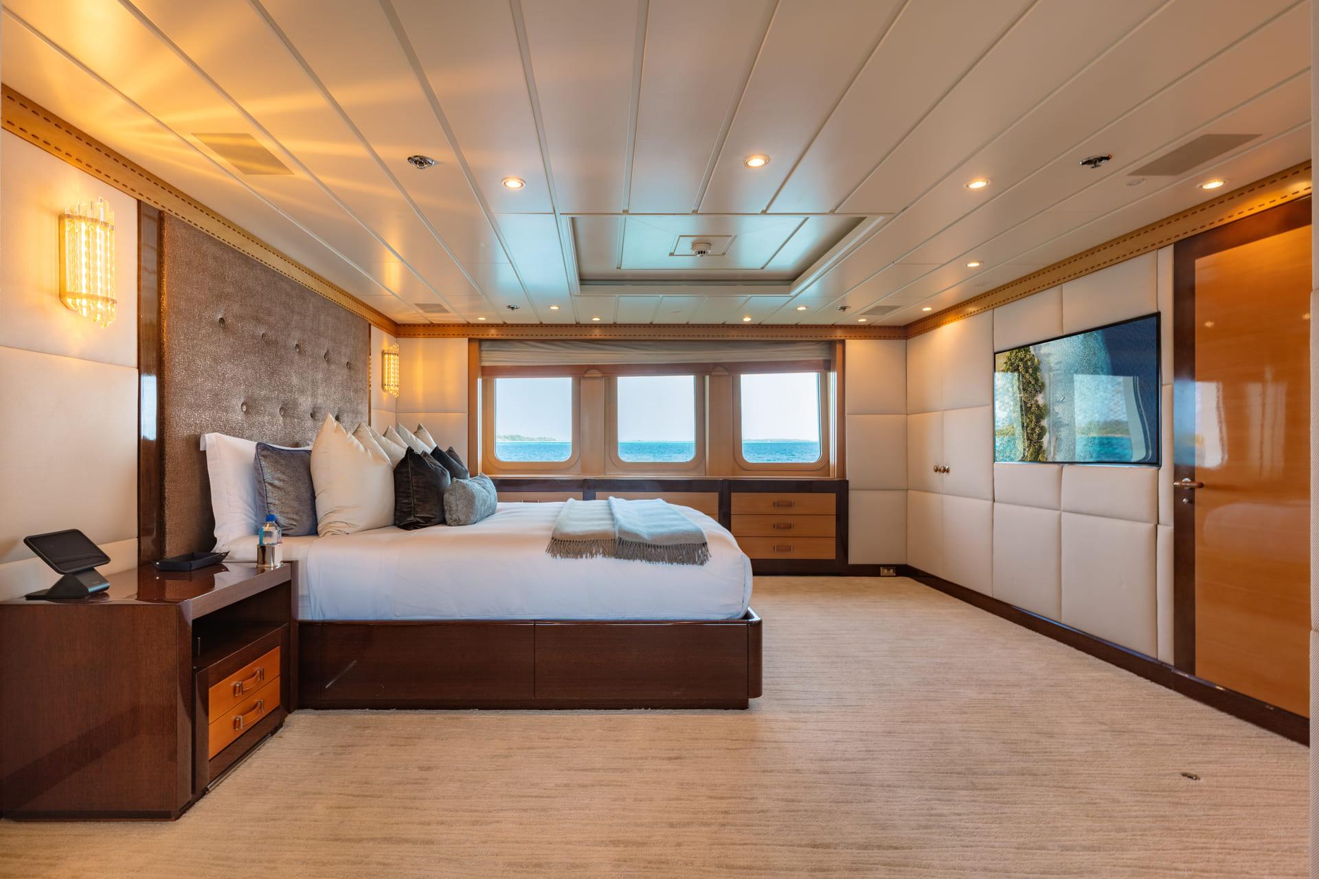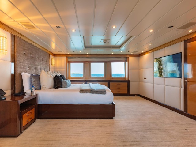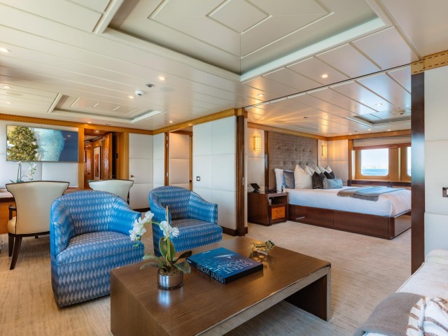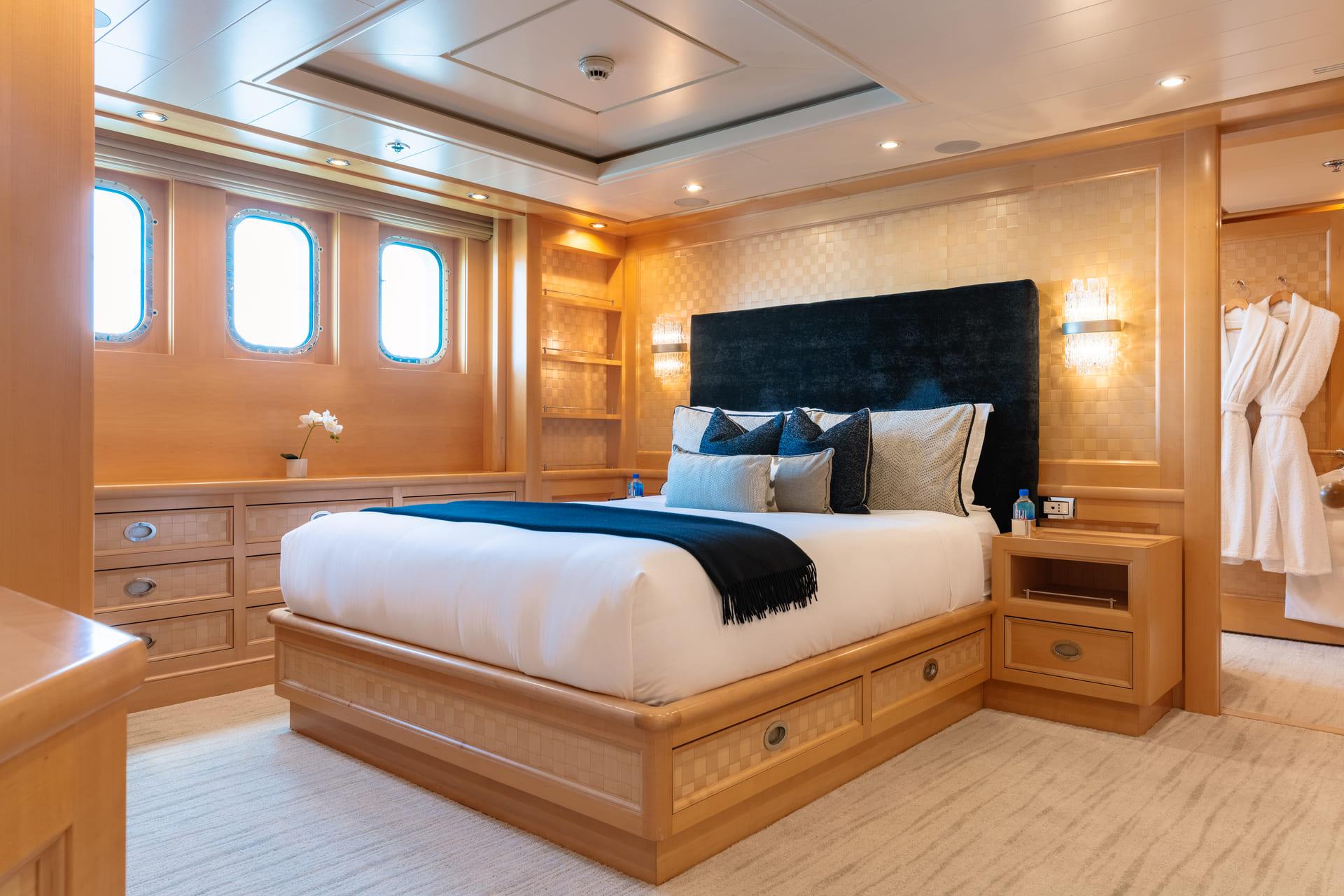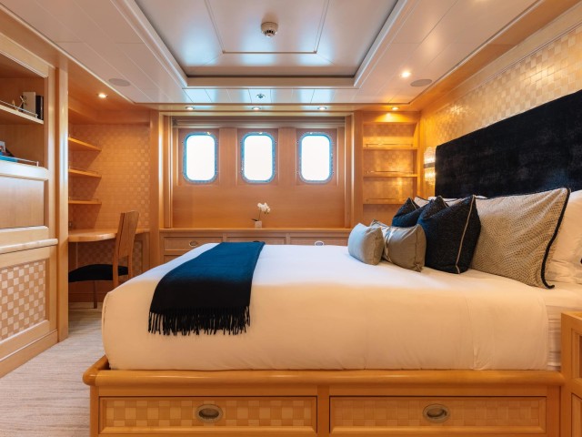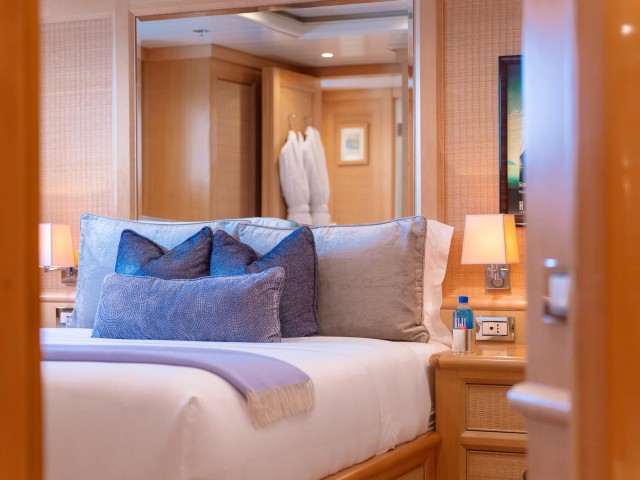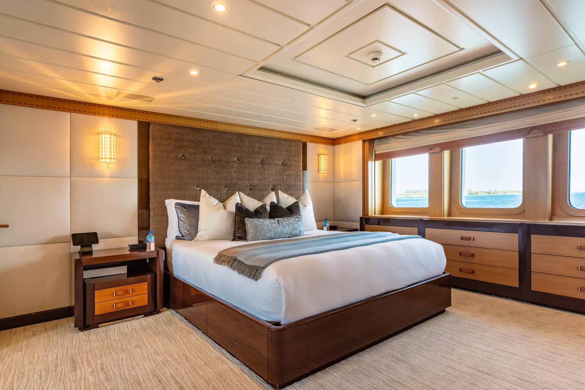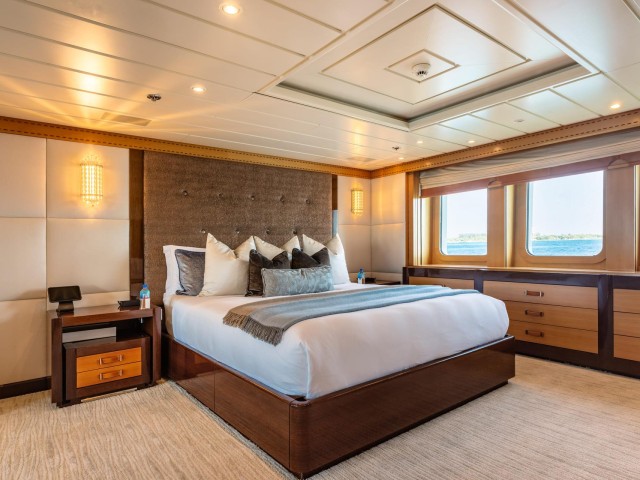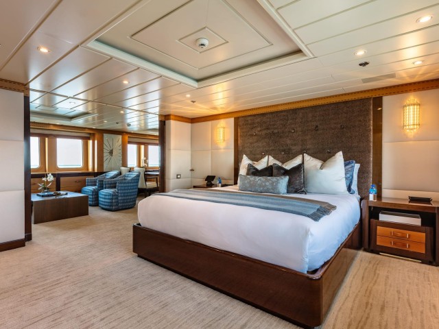 Die Unterkünfte an Bord sind großzügig, elegant und so gestaltet, dass jede Person maximale Privatsphäre genießt. Die vollbreite Master Suite erstreckt sich über rund 100 Quadratmeter und bietet eine eigene Lounge, ein Büro sowie ein luxuriöses Badezimmer mit separaten Bereichen für ihn und sie. Zwei VIP-Kabinen mit Queen-Betten verfügen über private Ankleidezimmer und große Jacuzzi-Badewannen, während die beiden weiteren Queen-Kabinen – jeweils mit zusätzlichem Pullman-Bett – ideal für Familien geeignet sind. Moderne Unterhaltungssysteme, iPad-Steuerungen, hochwertige Pflegeprodukte von Molton Brown und schnelles Starlink-Internet sorgen überall für höchsten Komfort.