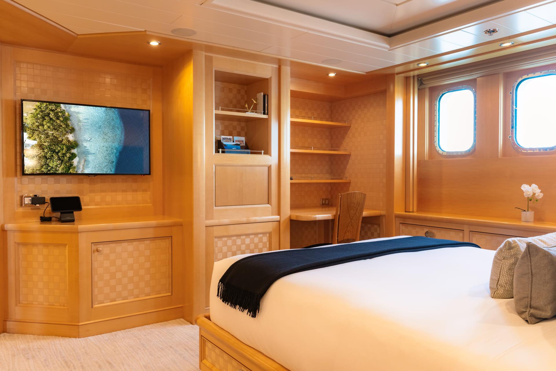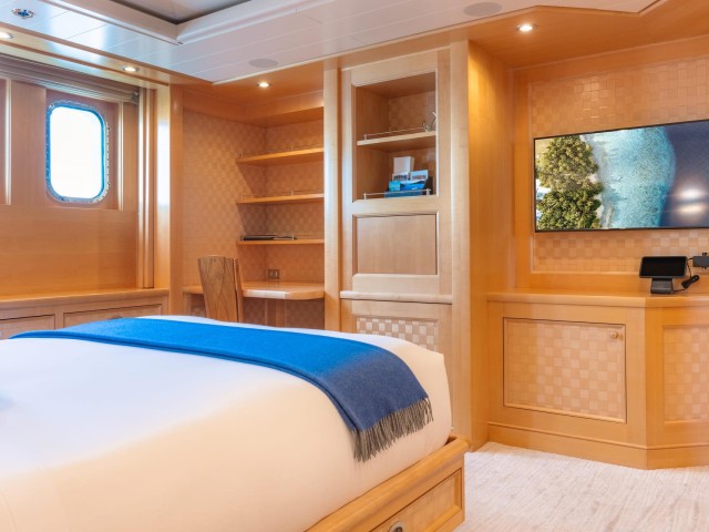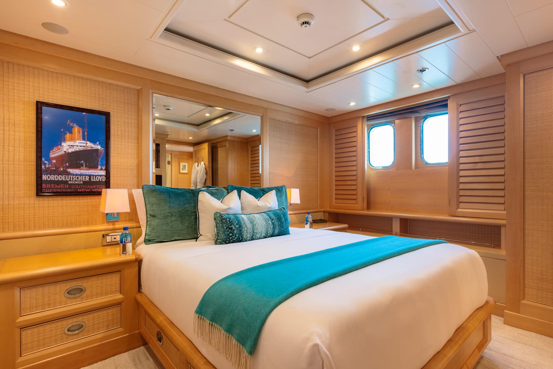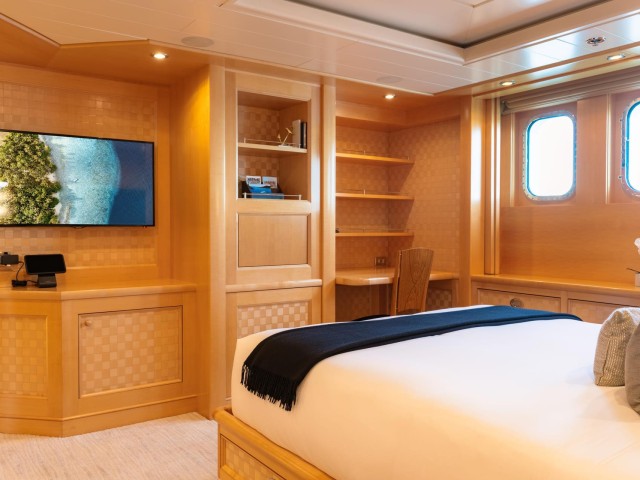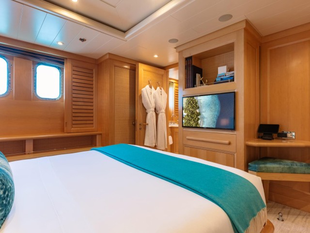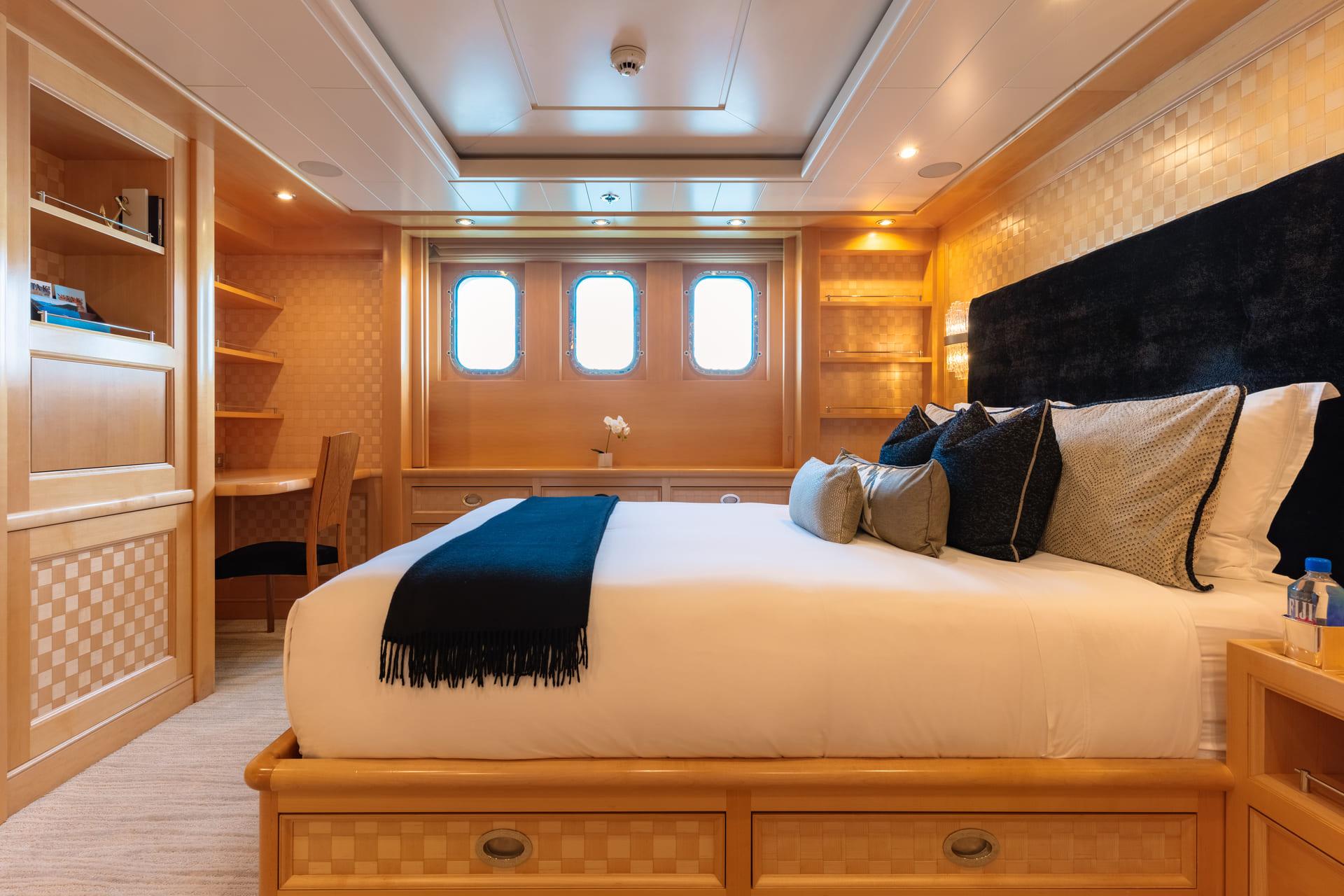 Die Unterkünfte an Bord sind großzügig, elegant und so gestaltet, dass jede Person maximale Privatsphäre genießt. Die vollbreite Master Suite erstreckt sich über rund 100 Quadratmeter und bietet eine eigene Lounge, ein Büro sowie ein luxuriöses Badezimmer mit separaten Bereichen für ihn und sie. Zwei VIP-Kabinen mit Queen-Betten verfügen über private Ankleidezimmer und große Jacuzzi-Badewannen, während die beiden weiteren Queen-Kabinen – jeweils mit zusätzlichem Pullman-Bett – ideal für Familien geeignet sind. Moderne Unterhaltungssysteme, iPad-Steuerungen, hochwertige Pflegeprodukte von Molton Brown und schnelles Starlink-Internet sorgen überall für höchsten Komfort.