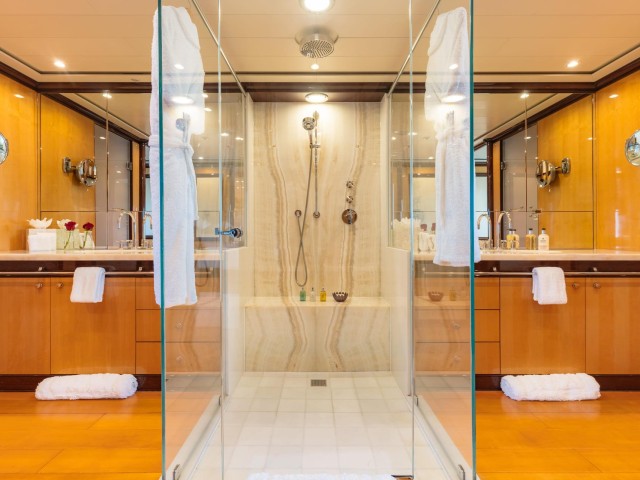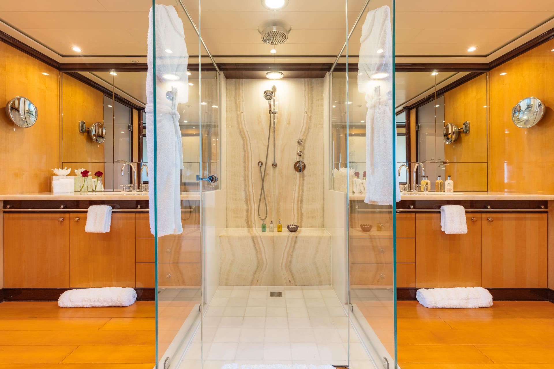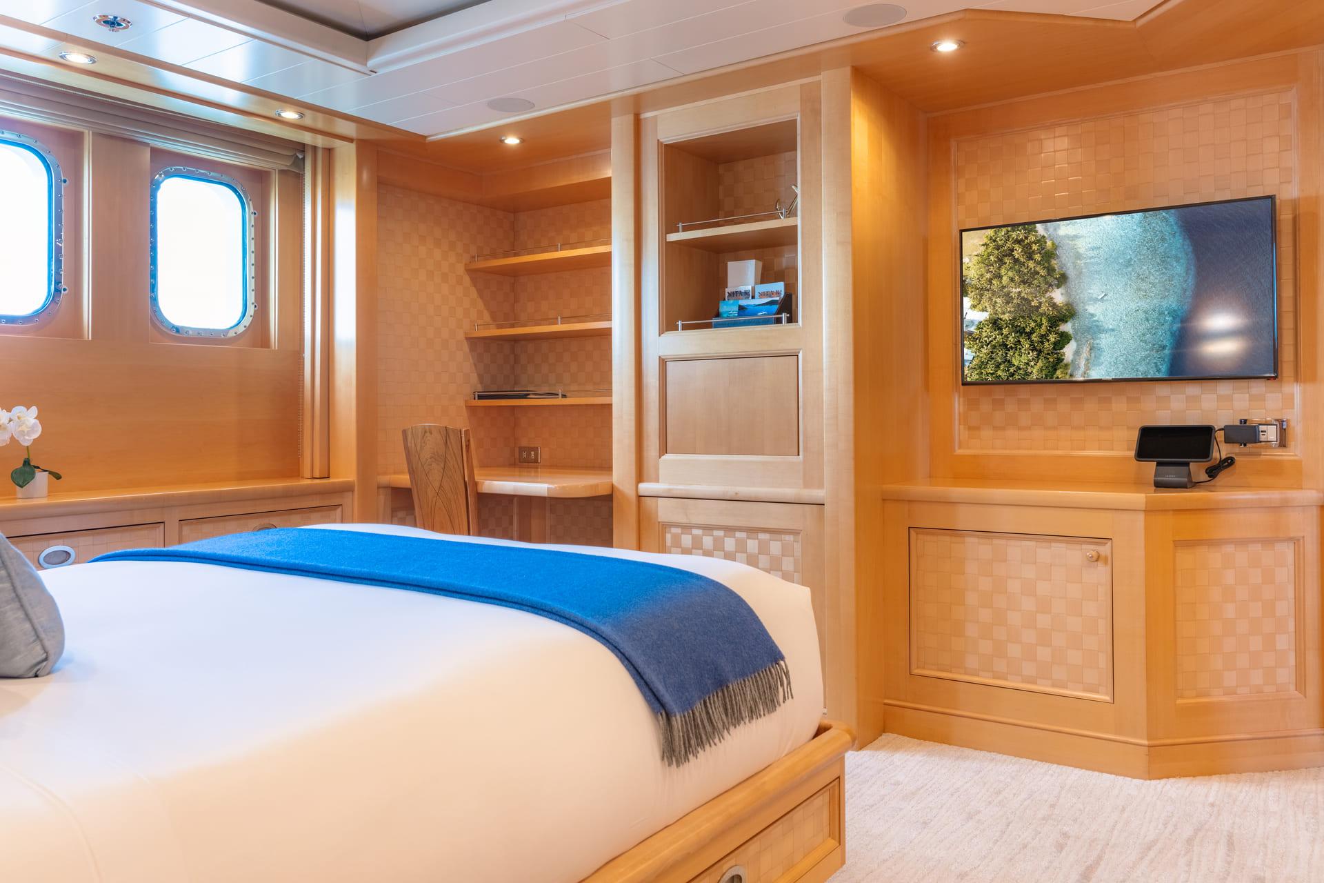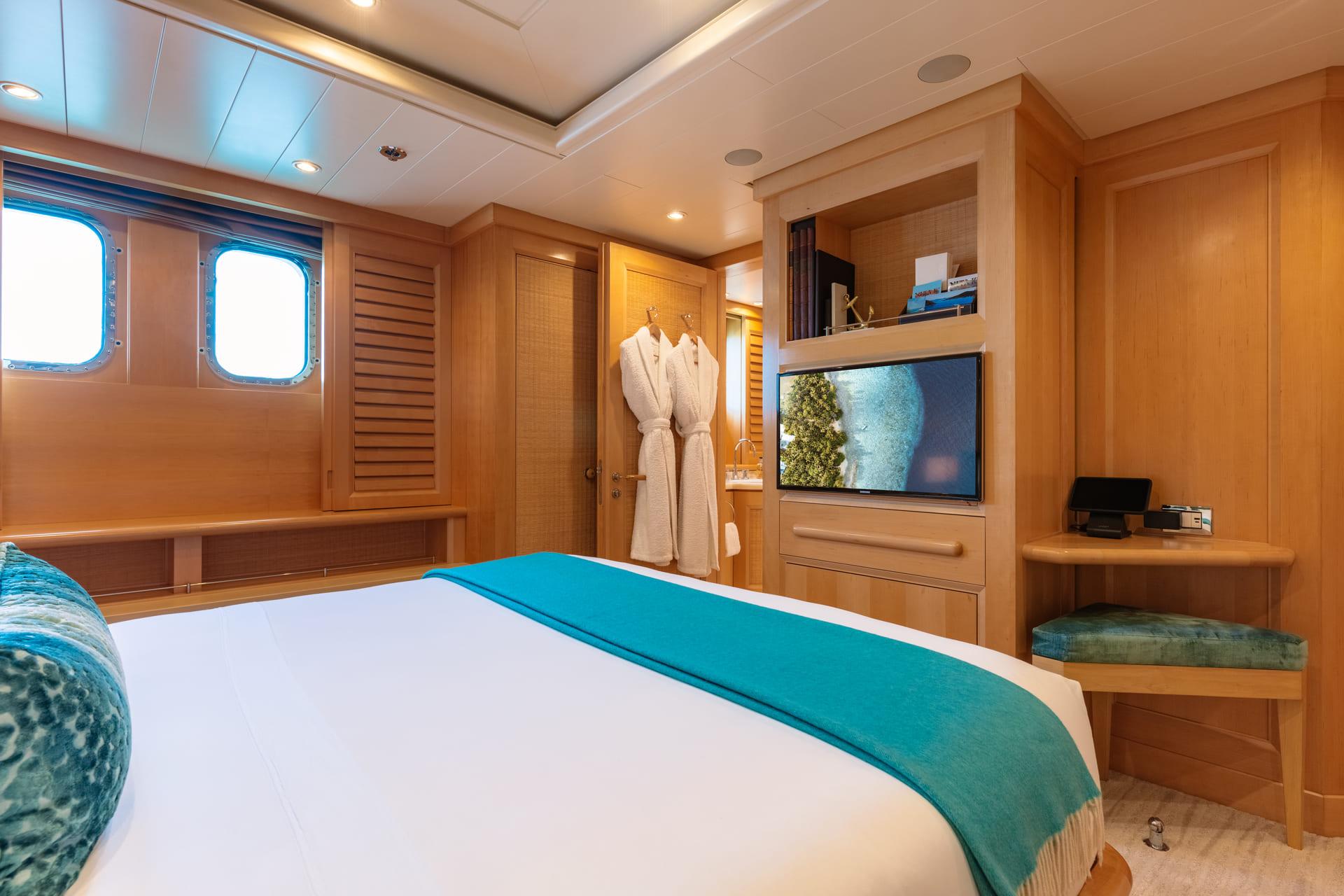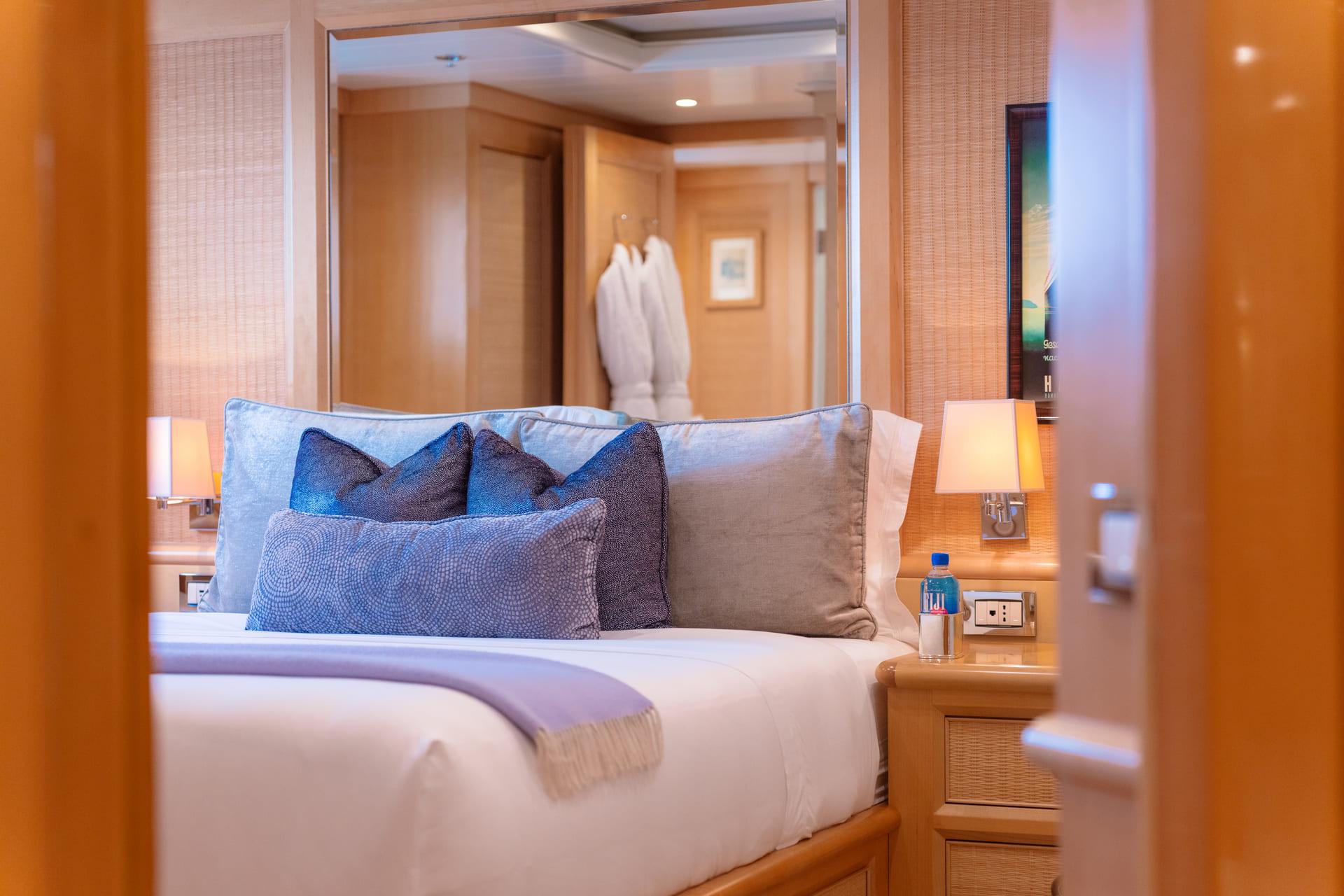 Die Unterkünfte an Bord sind großzügig, elegant und so gestaltet, dass jede Person maximale Privatsphäre genießt. Die vollbreite Master Suite erstreckt sich über rund 100 Quadratmeter und bietet eine eigene Lounge, ein Büro sowie ein luxuriöses Badezimmer mit separaten Bereichen für ihn und sie. Zwei VIP-Kabinen mit Queen-Betten verfügen über private Ankleidezimmer und große Jacuzzi-Badewannen, während die beiden weiteren Queen-Kabinen – jeweils mit zusätzlichem Pullman-Bett – ideal für Familien geeignet sind. Moderne Unterhaltungssysteme, iPad-Steuerungen, hochwertige Pflegeprodukte von Molton Brown und schnelles Starlink-Internet sorgen überall für höchsten Komfort.