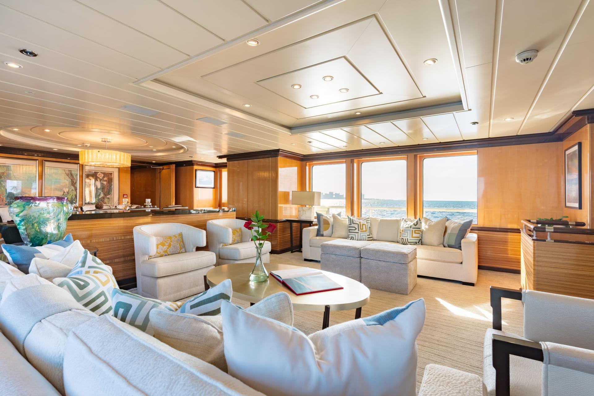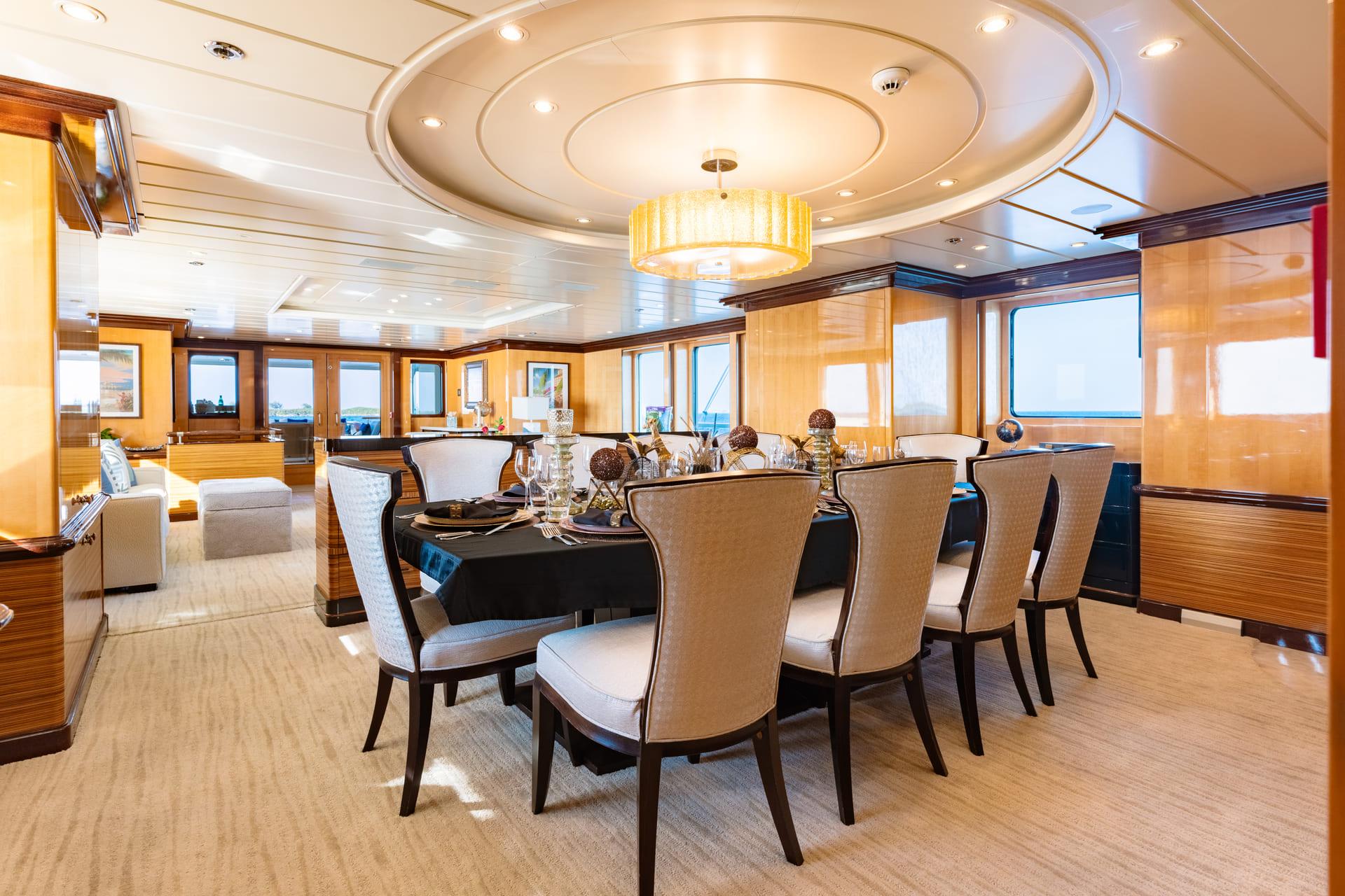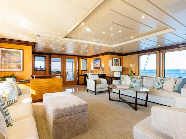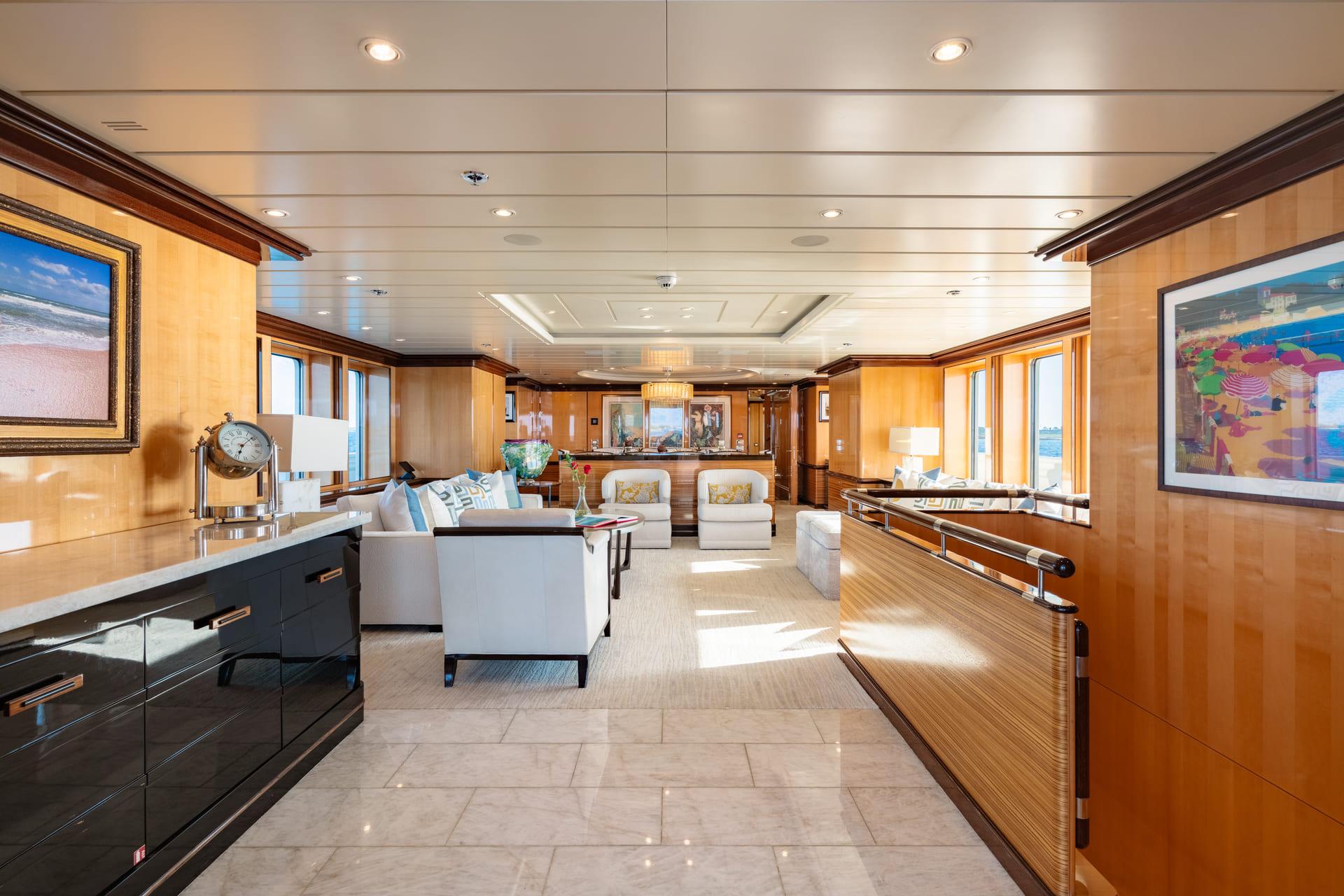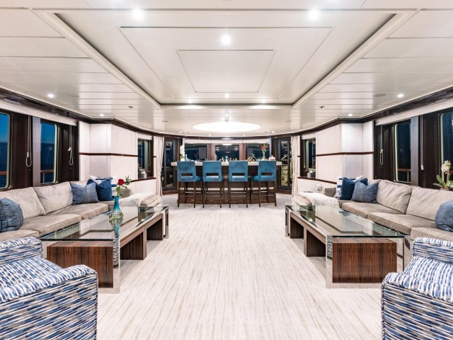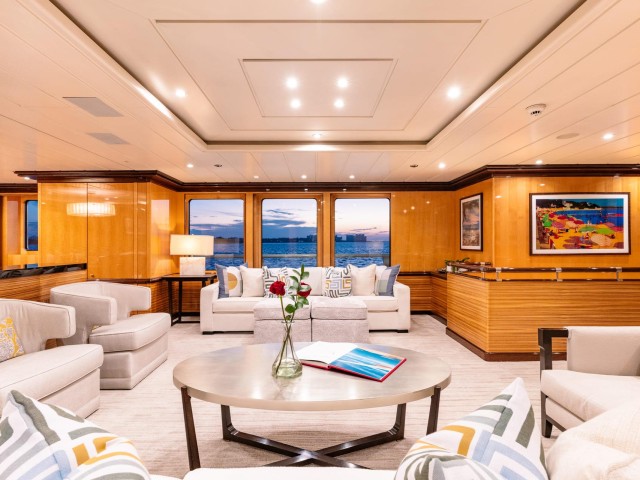 Schon im Hauptsalon spürt man die besondere Ausstrahlung dieser Yacht: Großzügige Sofas, klassische Akzente und viel Tageslicht schaffen einen idealen Ort zum Entspannen. Der angrenzende formelle Essbereich lädt zu festlichen Abendessen ein, während die Skylounge einen legeren Rückzugsort mit Panoramafenstern, einer stilvollen Bar und einem beeindruckenden 86-Zoll-Bildschirm bietet – perfekt für gemütliche Filmabende oder entspannte Nachmittage. Auf den weitläufigen Außendecks verteilen sich mehrere großzügige Bereiche zum Essen, Sonnen, Feiern oder einfach zum Genießen der Aussicht.