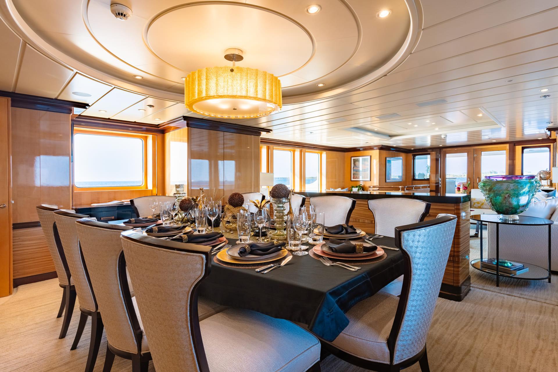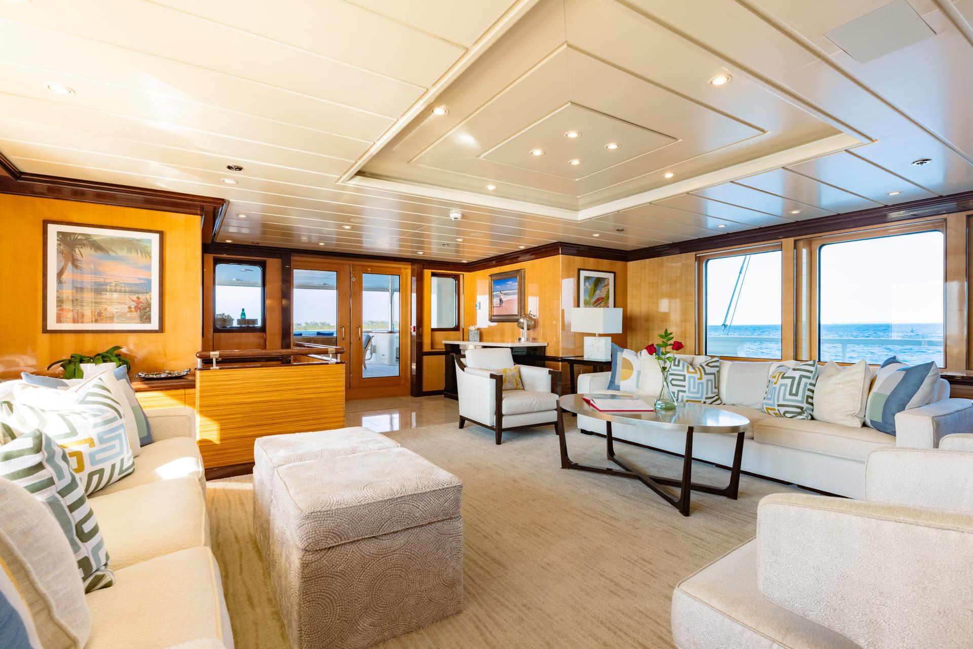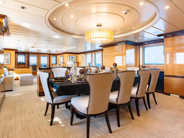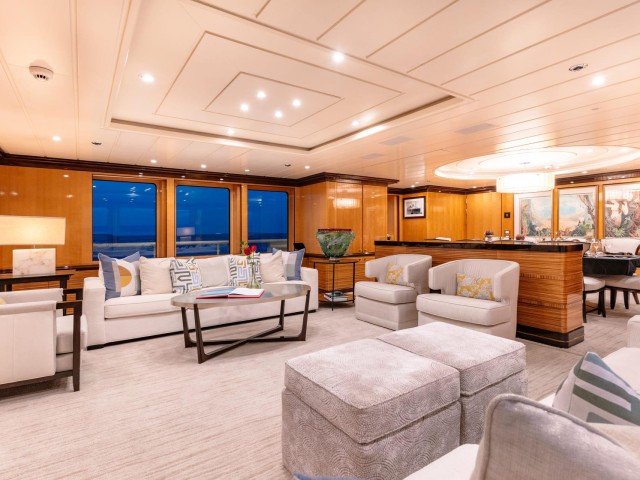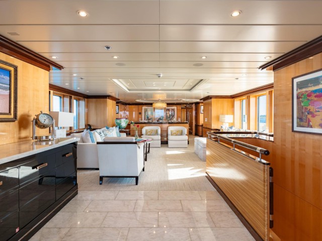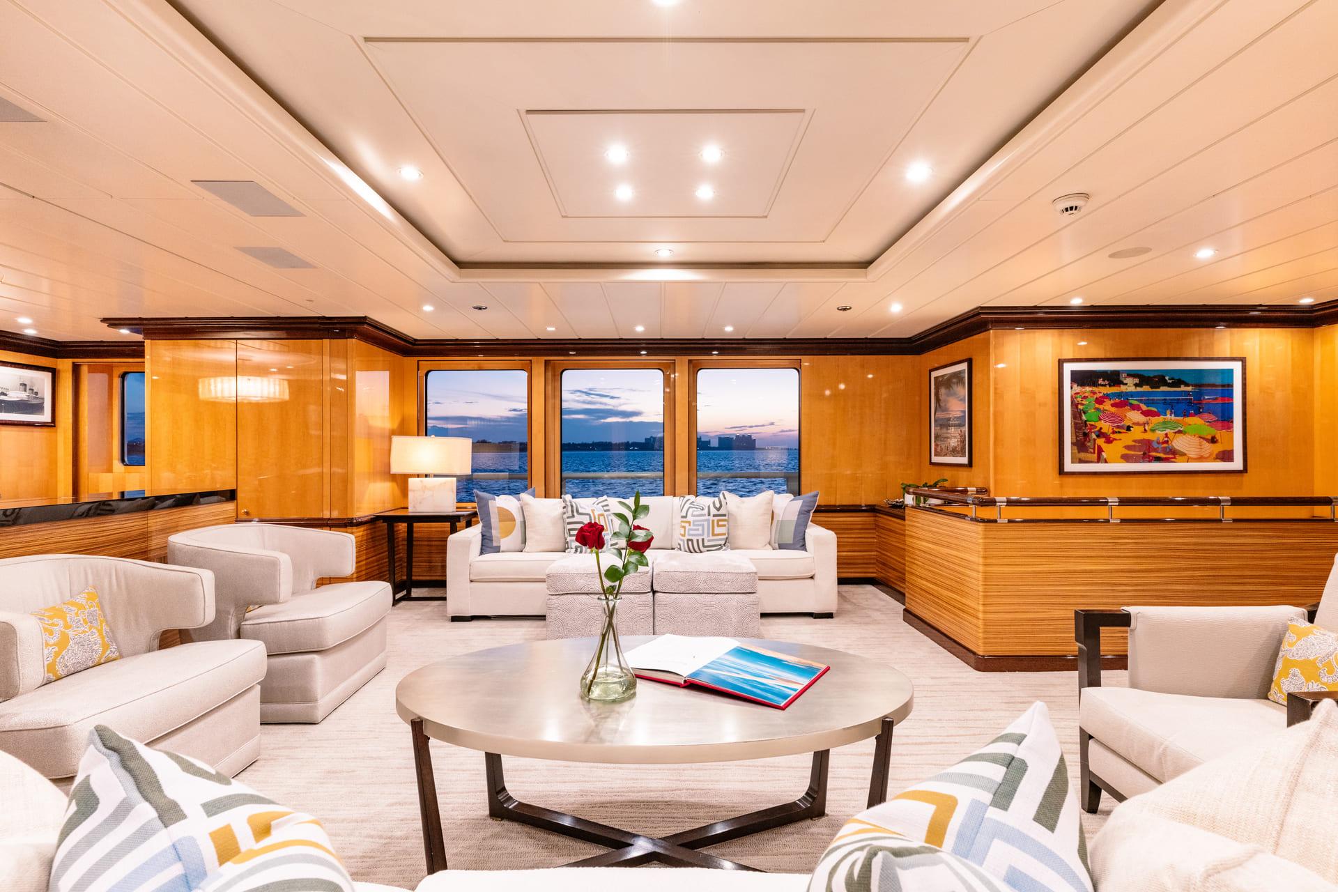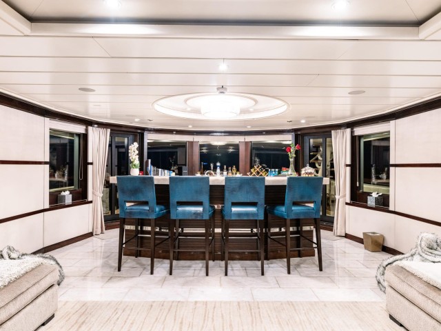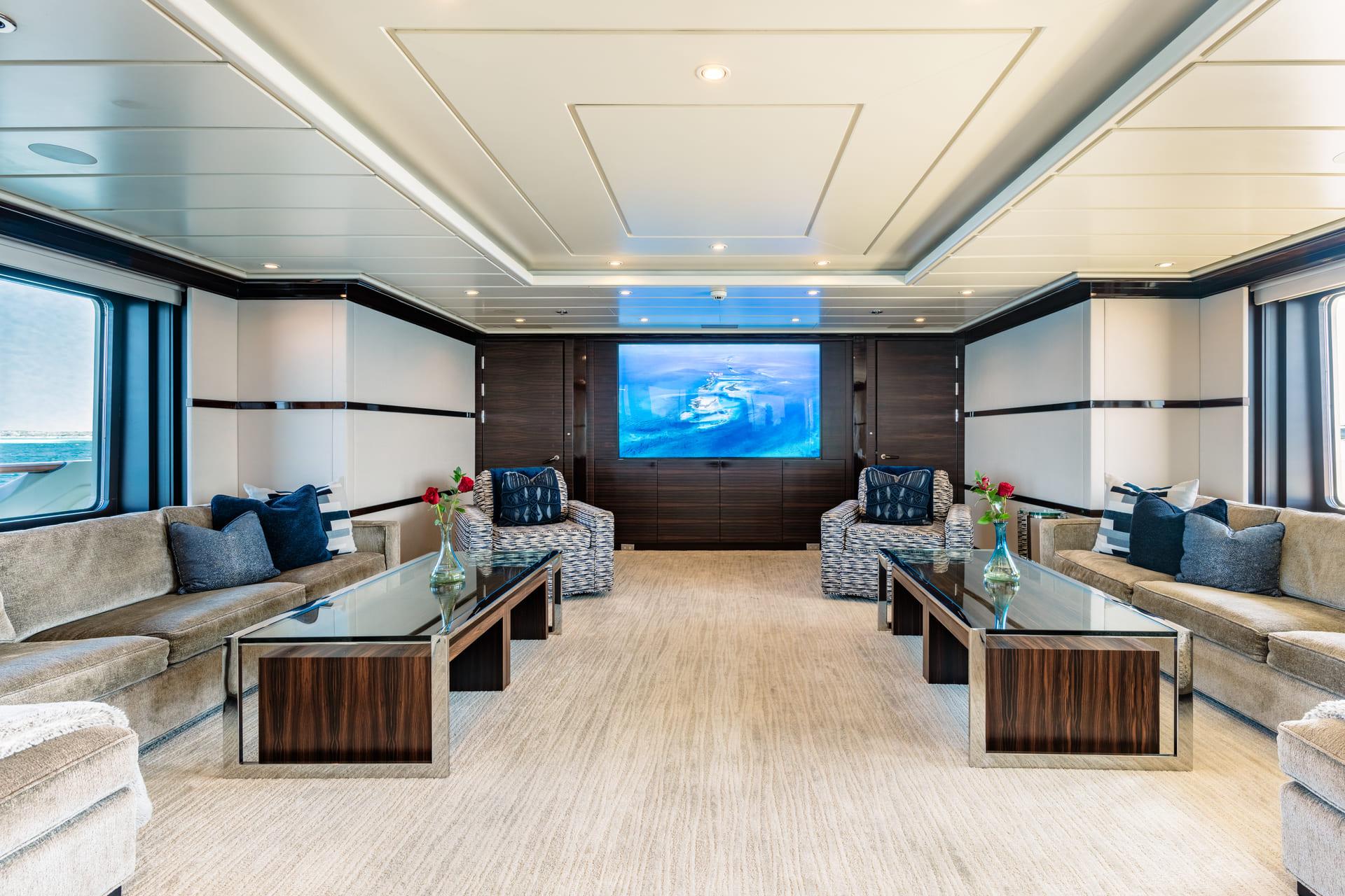 Schon im Hauptsalon spürt man die besondere Ausstrahlung dieser Yacht: Großzügige Sofas, klassische Akzente und viel Tageslicht schaffen einen idealen Ort zum Entspannen. Der angrenzende formelle Essbereich lädt zu festlichen Abendessen ein, während die Skylounge einen legeren Rückzugsort mit Panoramafenstern, einer stilvollen Bar und einem beeindruckenden 86-Zoll-Bildschirm bietet – perfekt für gemütliche Filmabende oder entspannte Nachmittage. Auf den weitläufigen Außendecks verteilen sich mehrere großzügige Bereiche zum Essen, Sonnen, Feiern oder einfach zum Genießen der Aussicht.