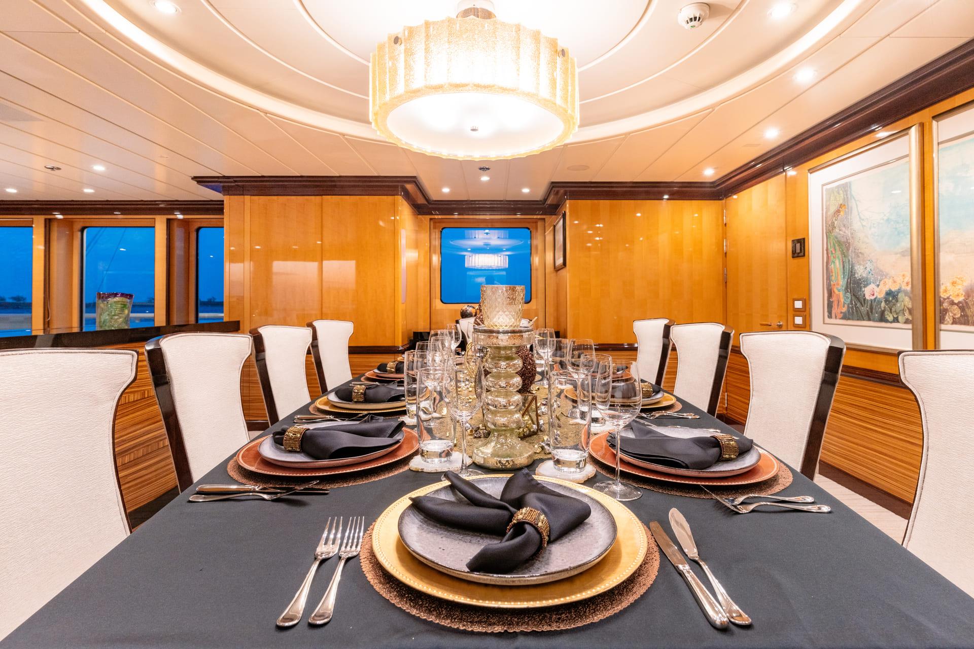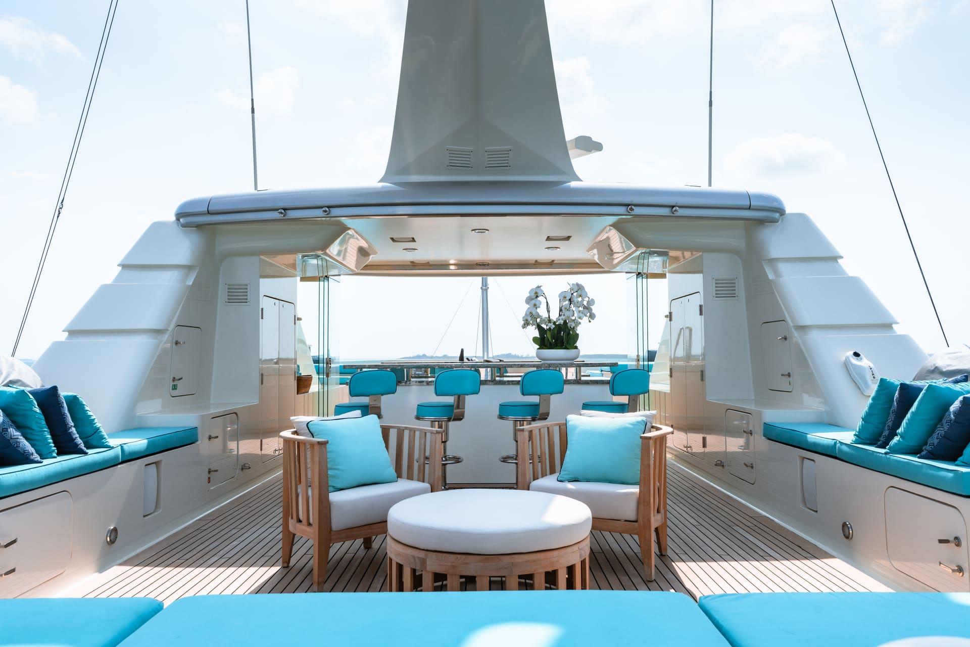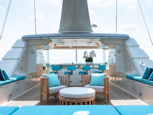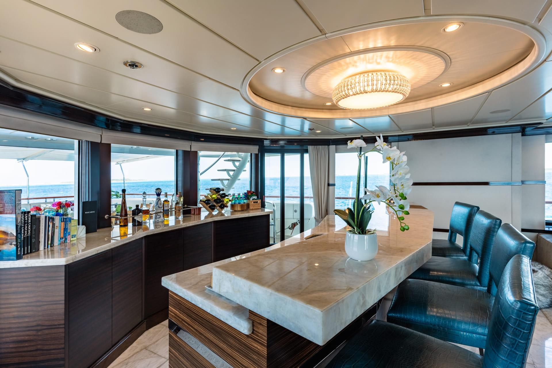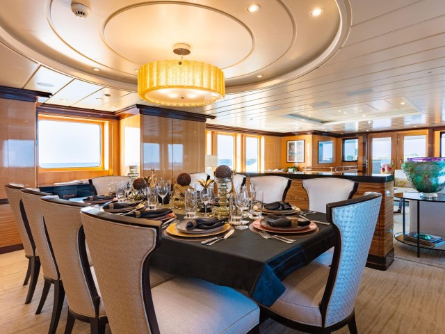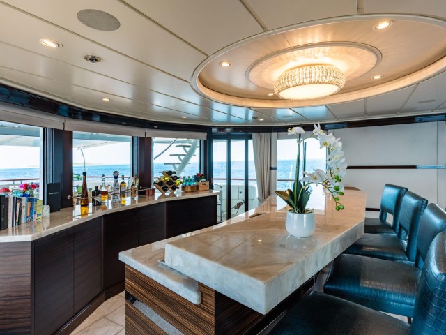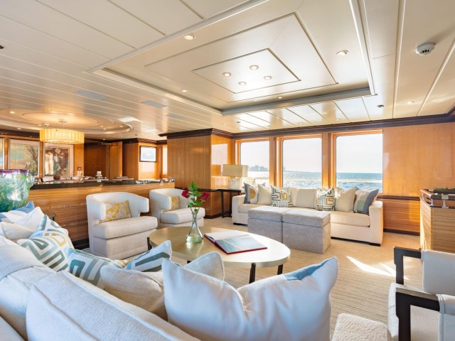 Schon im Hauptsalon spürt man die besondere Ausstrahlung dieser Yacht: Großzügige Sofas, klassische Akzente und viel Tageslicht schaffen einen idealen Ort zum Entspannen. Der angrenzende formelle Essbereich lädt zu festlichen Abendessen ein, während die Skylounge einen legeren Rückzugsort mit Panoramafenstern, einer stilvollen Bar und einem beeindruckenden 86-Zoll-Bildschirm bietet – perfekt für gemütliche Filmabende oder entspannte Nachmittage. Auf den weitläufigen Außendecks verteilen sich mehrere großzügige Bereiche zum Essen, Sonnen, Feiern oder einfach zum Genießen der Aussicht.
