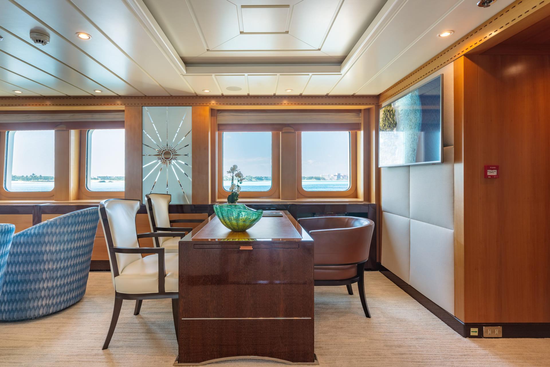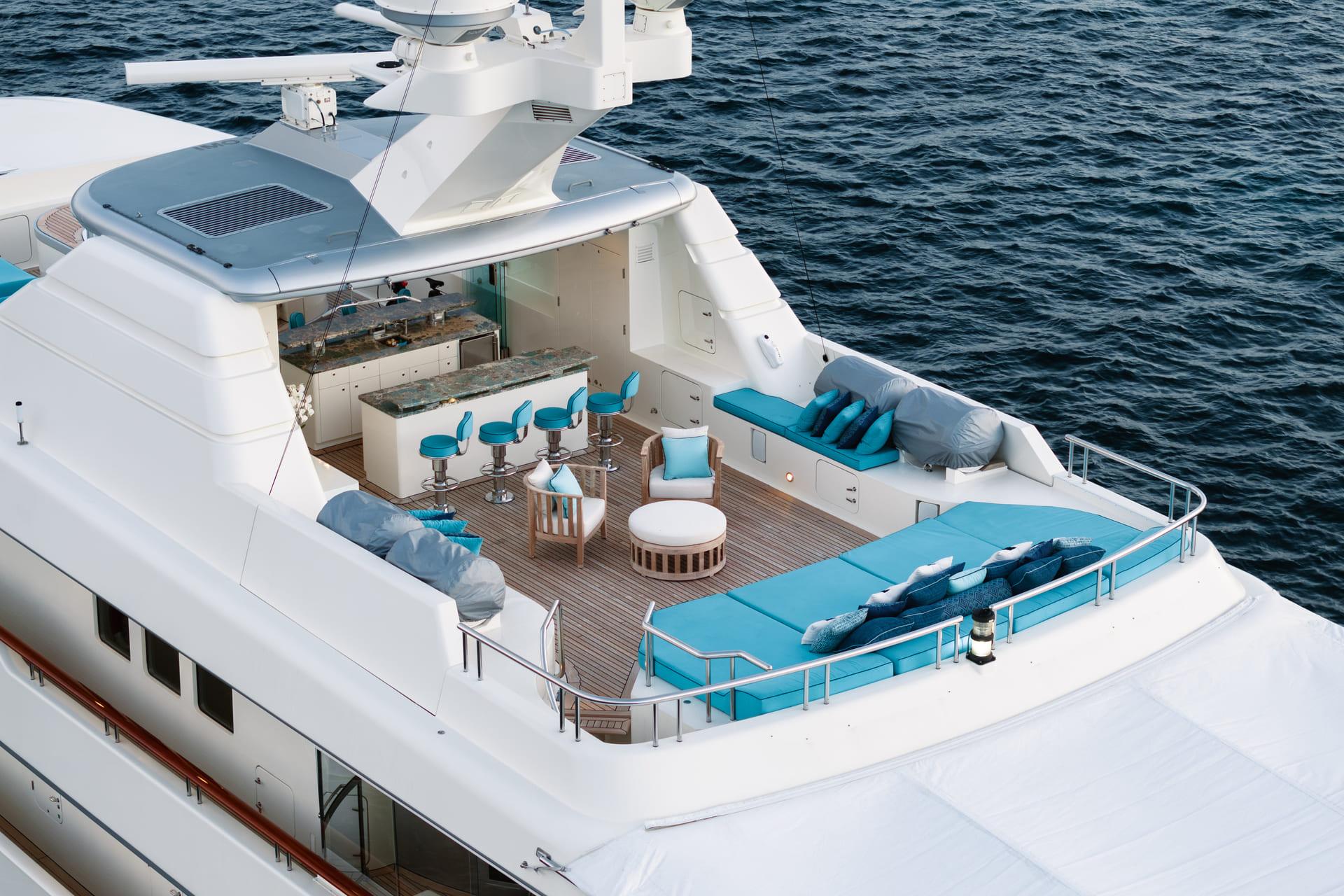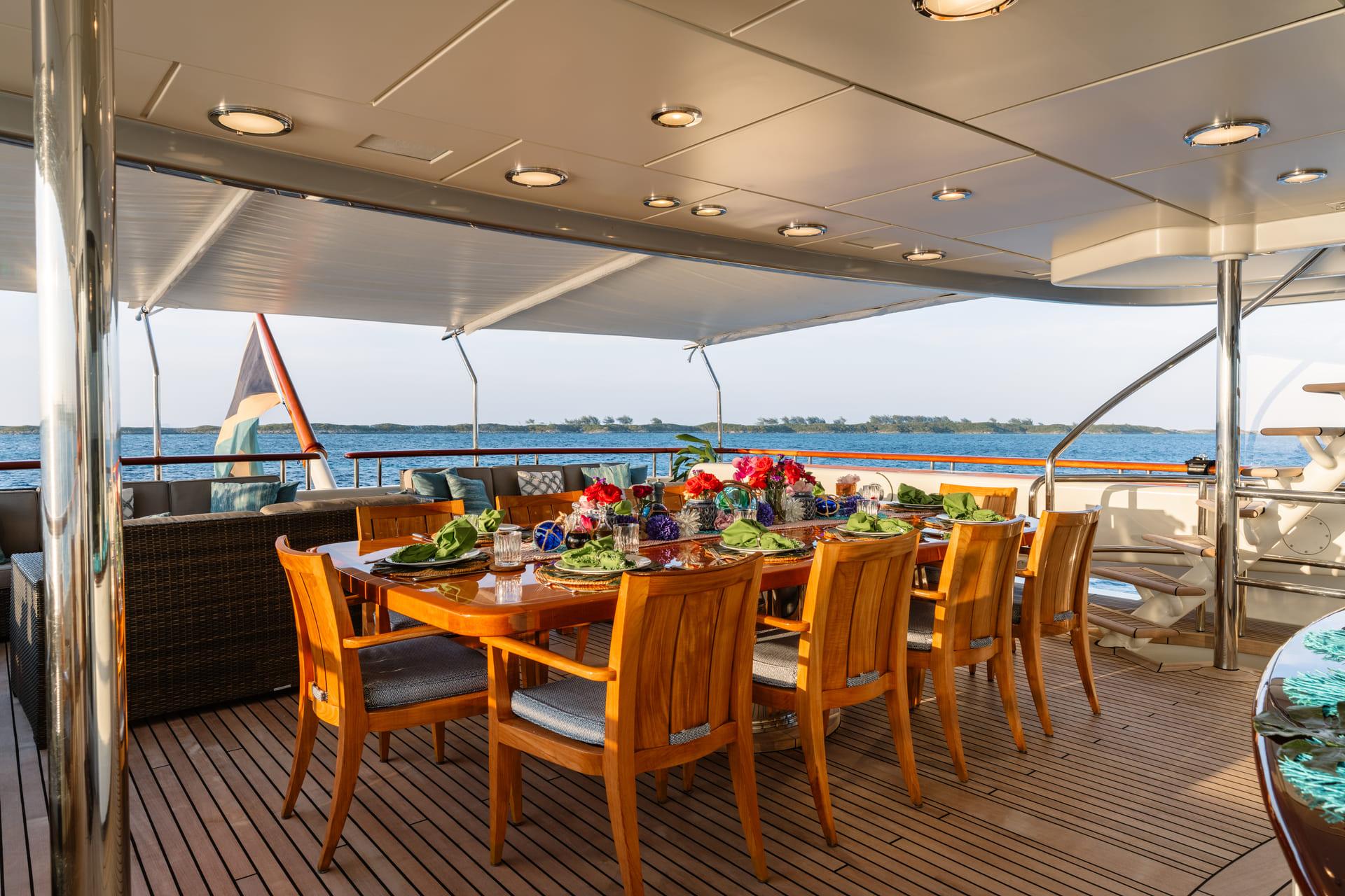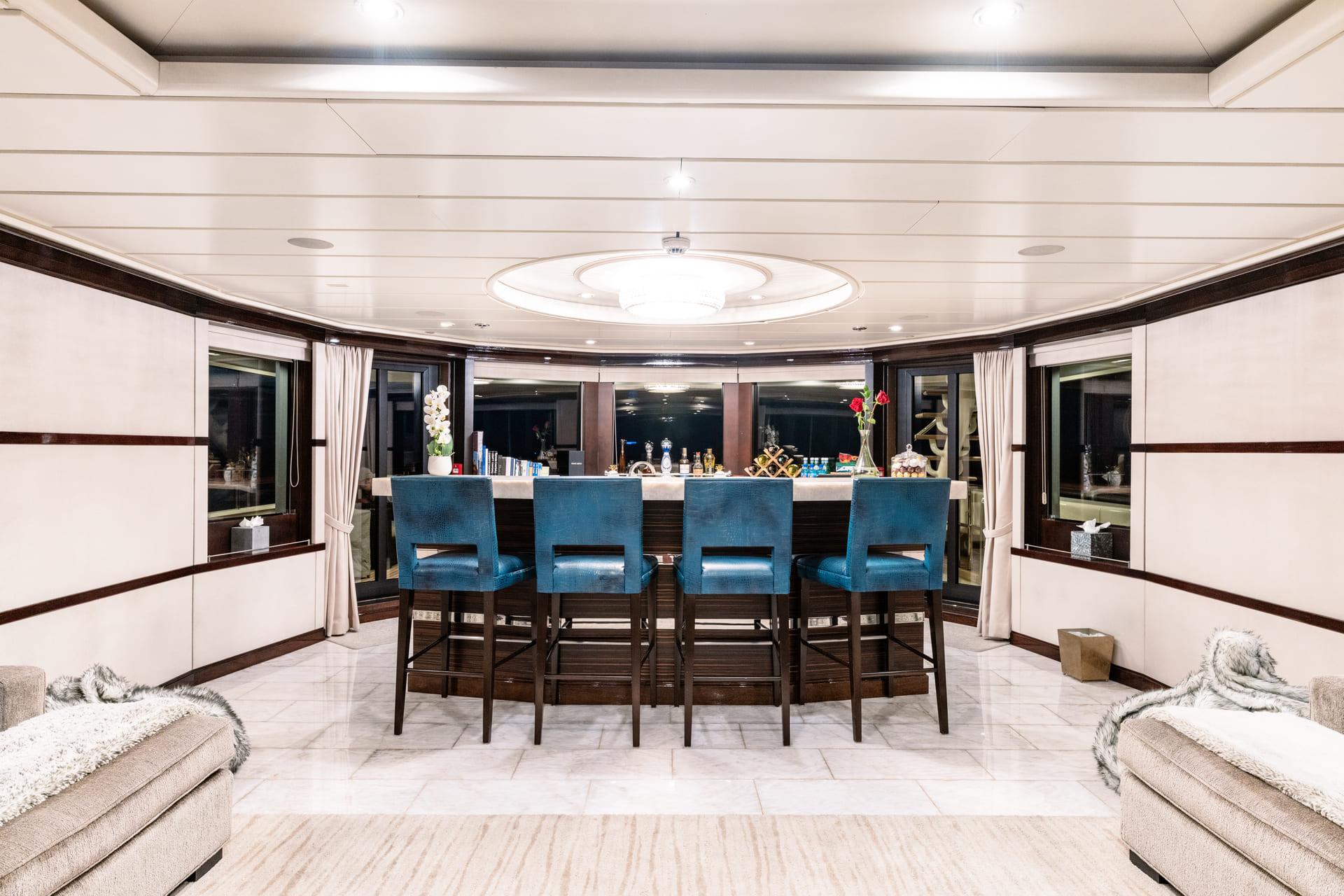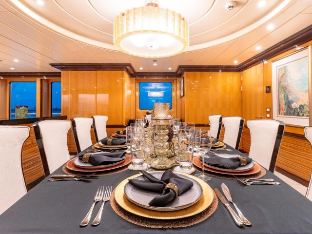 Schon im Hauptsalon spürt man die besondere Ausstrahlung dieser Yacht: Großzügige Sofas, klassische Akzente und viel Tageslicht schaffen einen idealen Ort zum Entspannen. Der angrenzende formelle Essbereich lädt zu festlichen Abendessen ein, während die Skylounge einen legeren Rückzugsort mit Panoramafenstern, einer stilvollen Bar und einem beeindruckenden 86-Zoll-Bildschirm bietet – perfekt für gemütliche Filmabende oder entspannte Nachmittage. Auf den weitläufigen Außendecks verteilen sich mehrere großzügige Bereiche zum Essen, Sonnen, Feiern oder einfach zum Genießen der Aussicht.