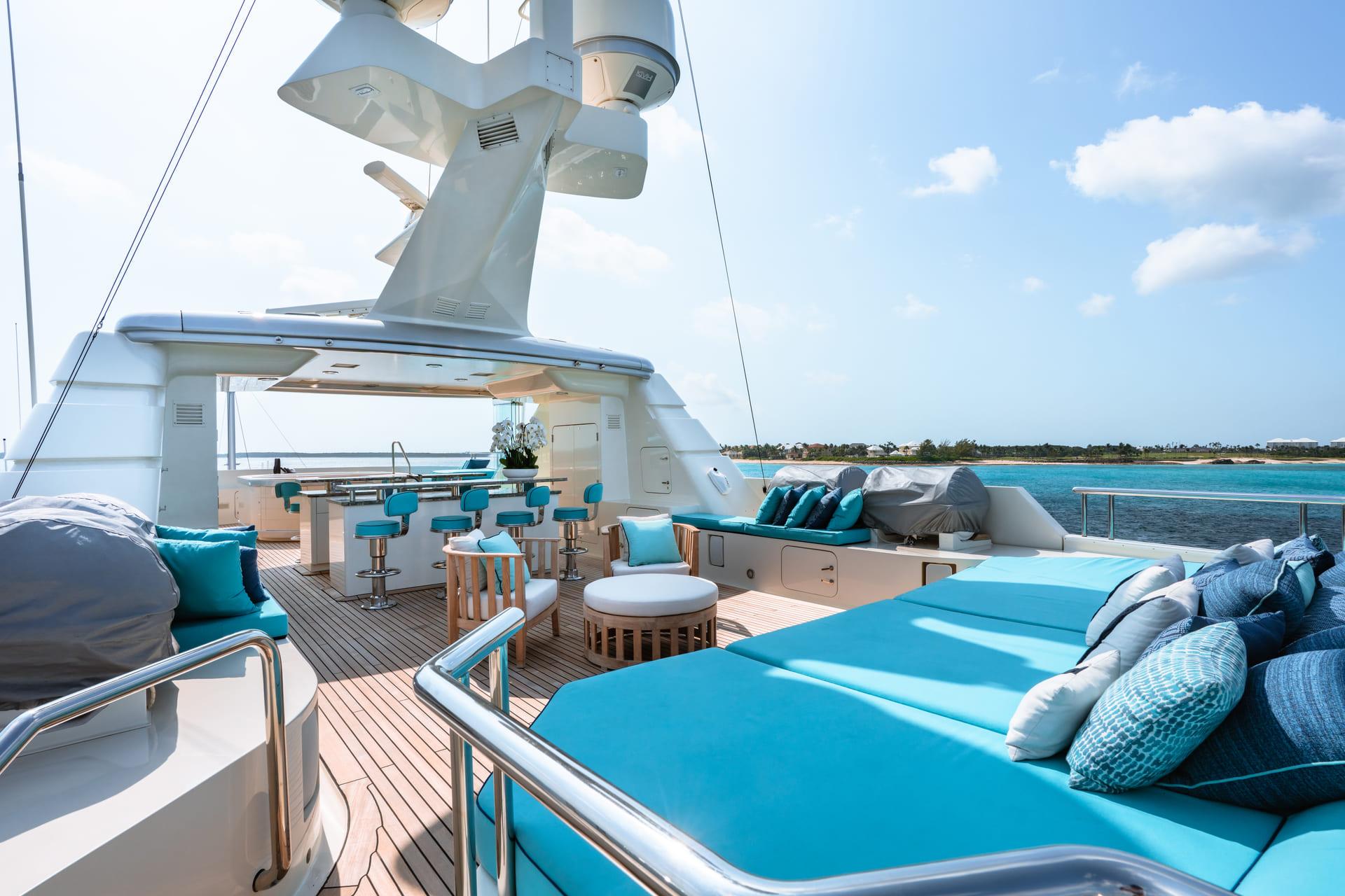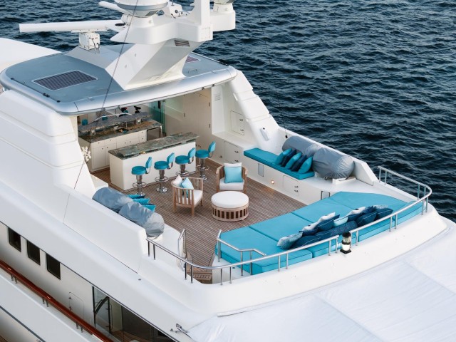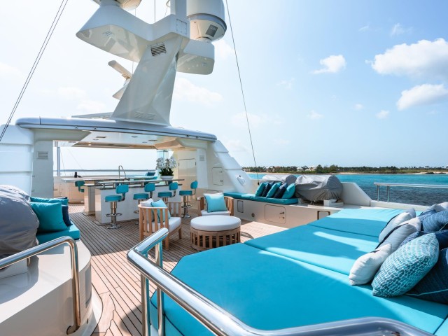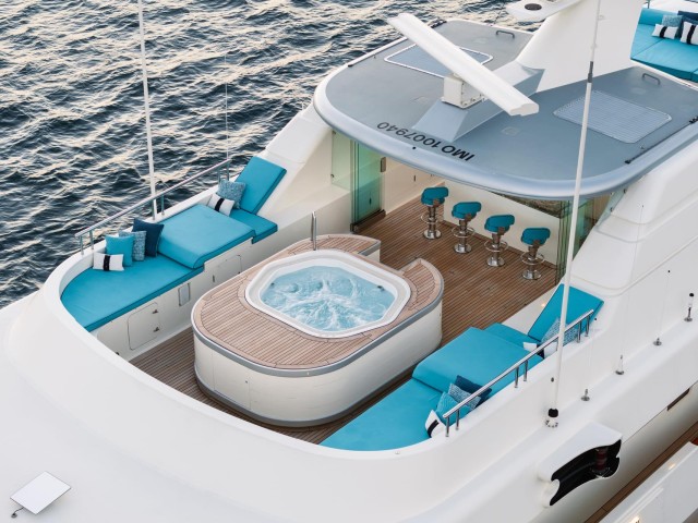 Das Sonnendeck ist das Herzstück des Außenbereichs und bietet alles, was man sich an Bord einer Superyacht wünscht: einen großen Jacuzzi, weiche Sonnenliegen, eine zentrale Bar für Aperitifs bei Sonnenuntergang und einen weitläufigen Bereich zum Entspannen. Fitnessliebhaber profitieren vom gut ausgestatteten Trainingsbereich mit Peloton, TRX-Bändern, Yogamatten und einem kleinen Putting Green mit umweltfreundlichen Golfbällen. Ob aktiv oder entspannt – auf Nita K II findet jede Person ihren Lieblingsplatz.