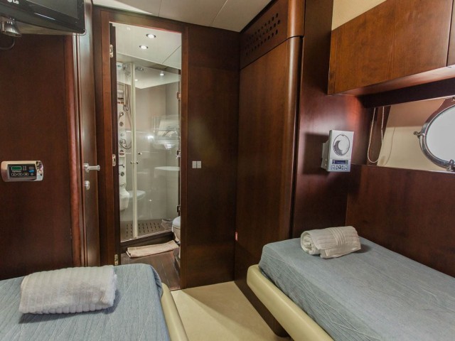 Ulisse bietet Platz für bis zu 8 Gäste in 4 gut ausgestatteten Kabinen, jede mit einem eigenen Bad und einem hochmodernen Unterhaltungssystem. Die Master-Suite ist regelrecht palastartig und verfügt über das gleiche BOSE-Heimkino wie der Salon, sowie einen Schminktisch, eine begehbare Kommode und Designer-Details. Wenn Sie sich für die VIP-Suite entscheiden, finden Sie eine Oase aus dunklem Edelholz und ein eigenes Bad mit Waschbecken, Dusche und Bidet. Die beiden Twin-Zimmer sind großzügig und elegant. Eine separate Unterkunft ist für die aufmerksame und leidenschaftliche 4-köpfige Crew vorgesehen, die dafür sorgt, dass jeder Moment an Bord optimal genutzt wird.