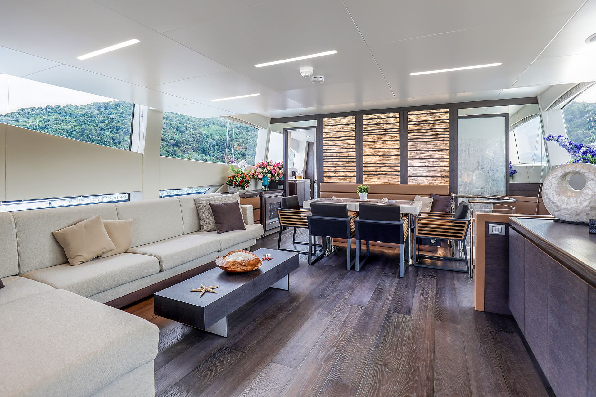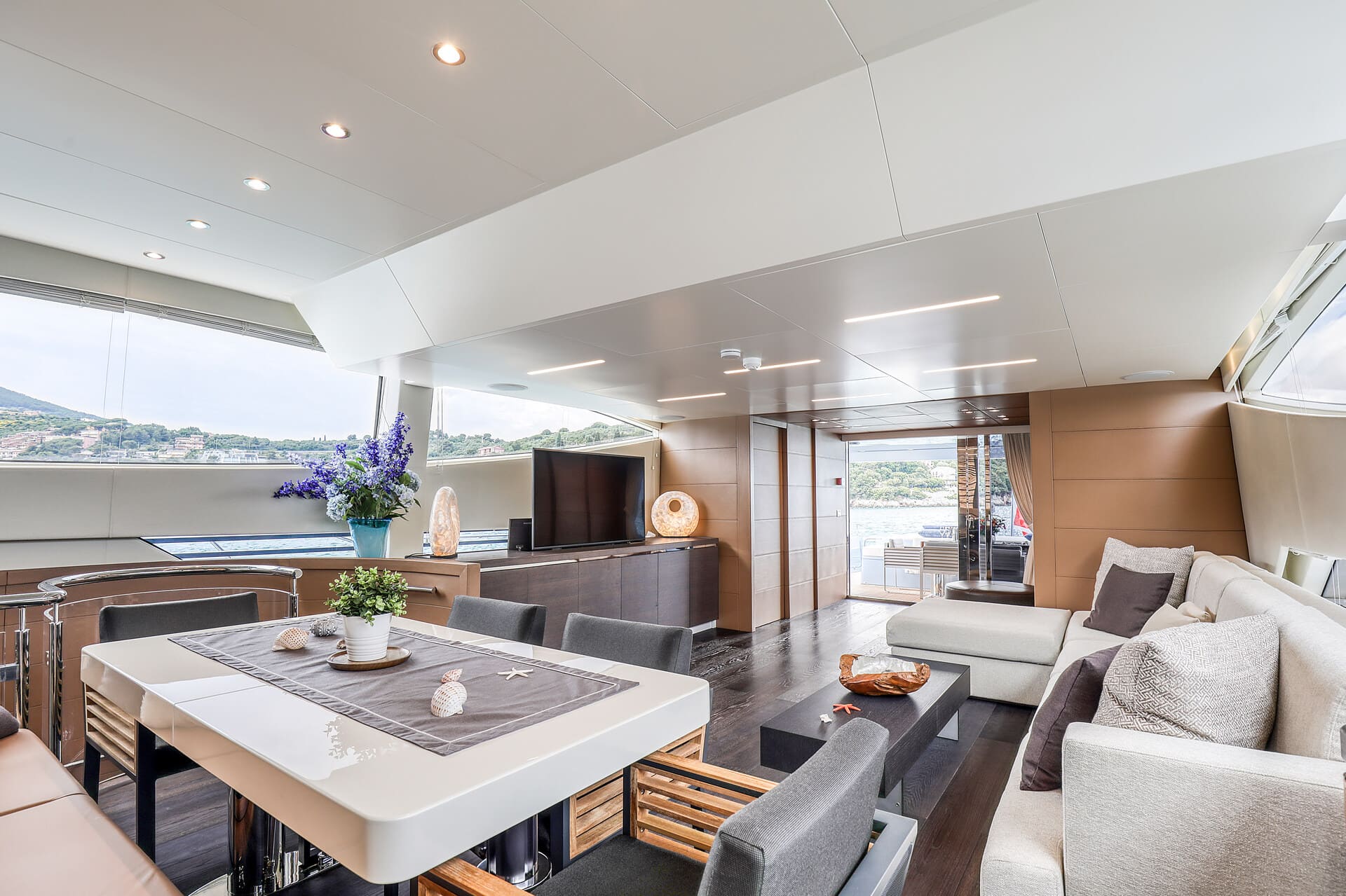 Los espacios al aire libre son uno de los puntos fuertes de 55 Fifty Five. La cubierta de popa incluye una generosa zona de comedor y relajación con un televisor plegable, barbacoa, nevera y una amplia zona para tomar el sol. El flybridge ofrece una zona de comedor al aire libre con una amplia zona para tomar el sol y sombra opcional mediante un toldo personalizado, mientras que la amplia cubierta de proa está diseñada para socializar, con una zona de asientos circular con capacidad para 14 huéspedes, perfecta para cócteles al atardecer o largas y tranquilas tardes al sol.