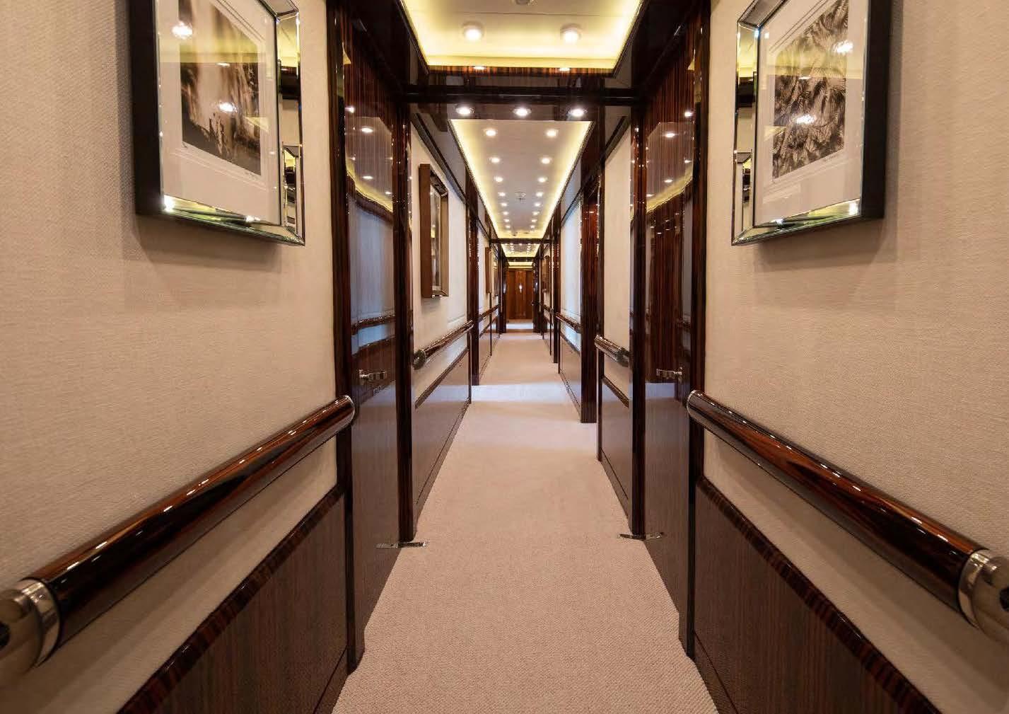 AHS acoge hasta 12 invitados en seis suntuosos camarotes. Cuatro elegantes cabinas dobles ofrecen amplios espacios de descanso, mientras que dos cabinas convertibles permiten la máxima flexibilidad para diferentes configuraciones de invitados. Su interior, diseñado originalmente por el renombrado Alberto Pinto, refleja sofisticación en cada detalle. Además, dos cabinas adicionales con acabados de lujo están disponibles para personal de seguridad o asistentes, garantizando un servicio inigualable.