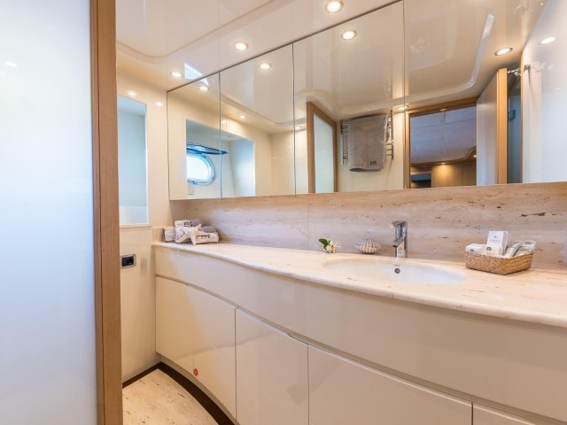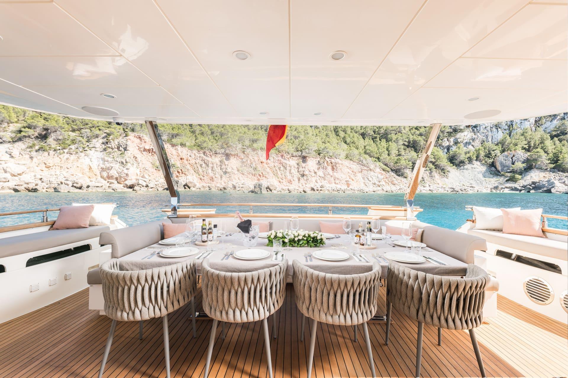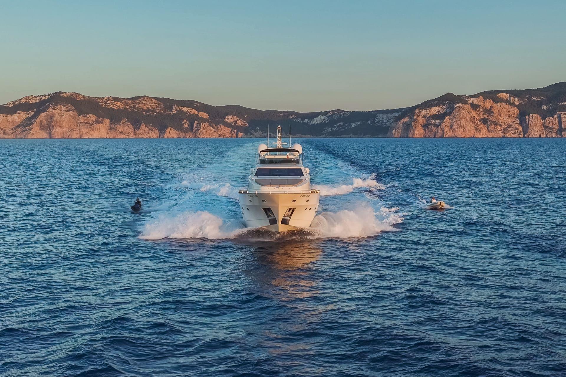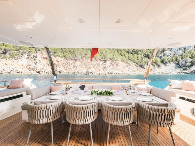 Con base en Ibiza y disponible durante todo el año, B4 es ideal para recorrer Mallorca, Menorca y Formentera. A bordo, una tripulación profesional de cinco personas garantiza un servicio atento y una experiencia fluida.