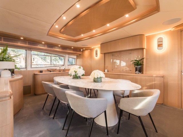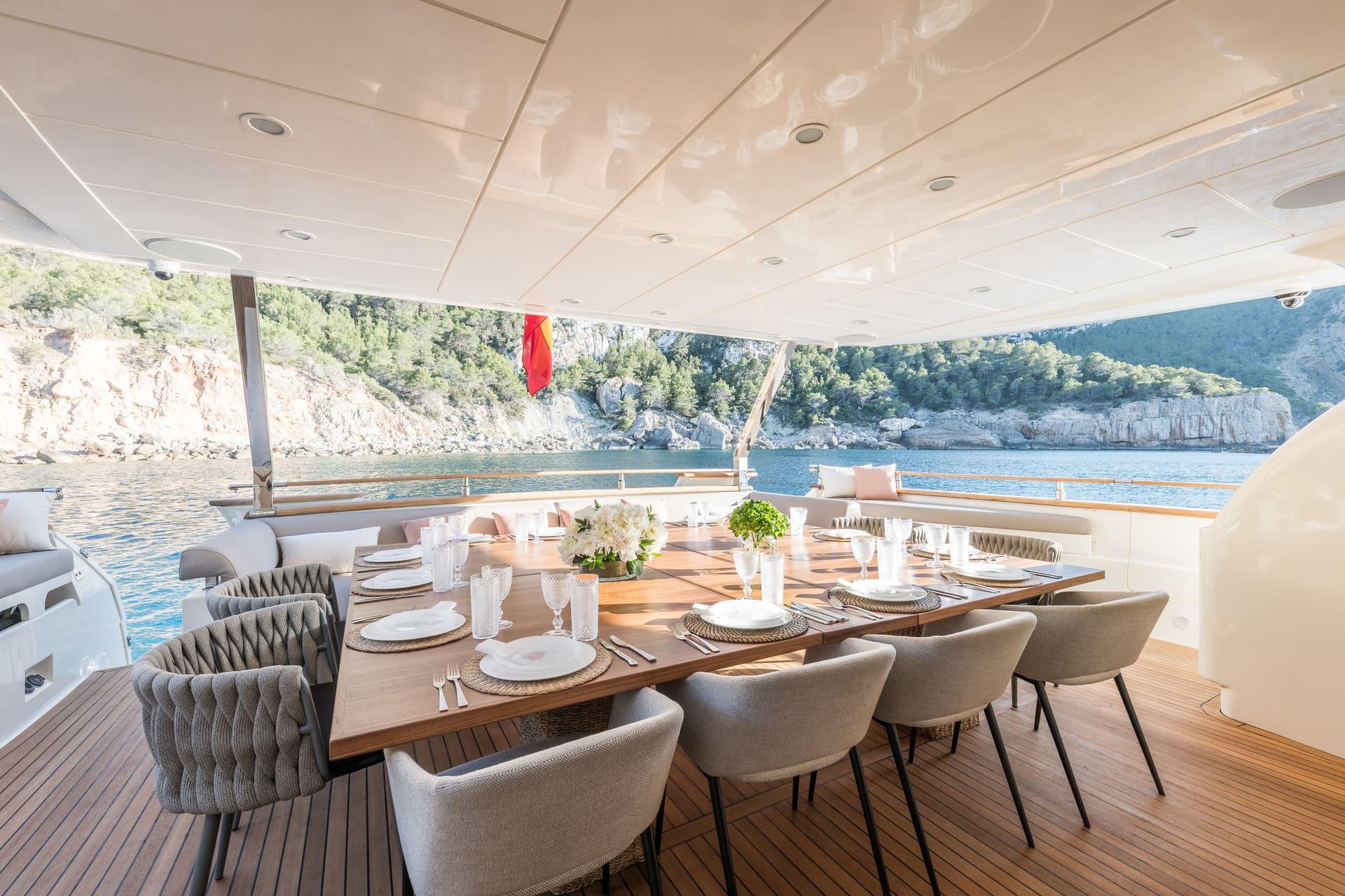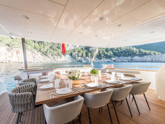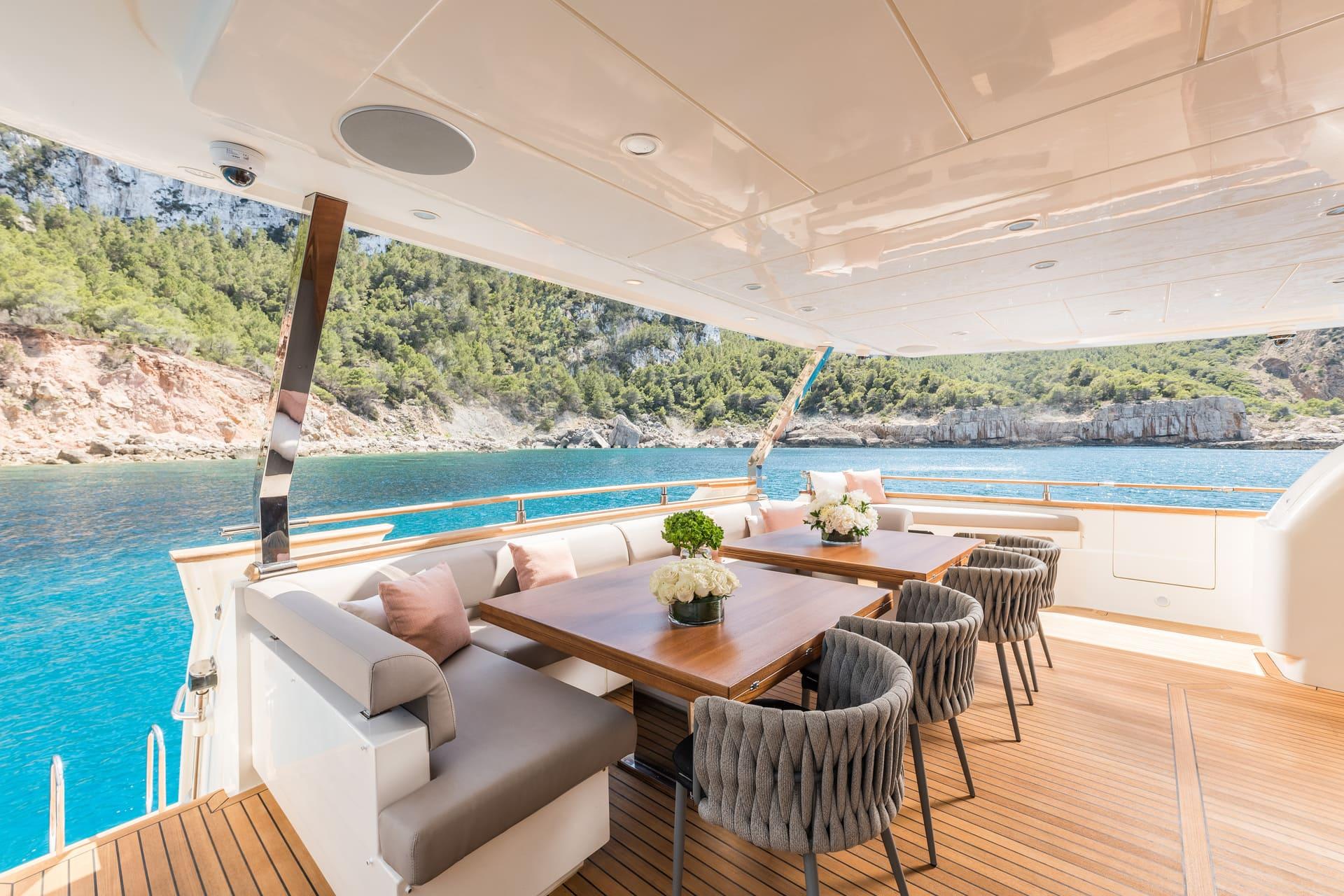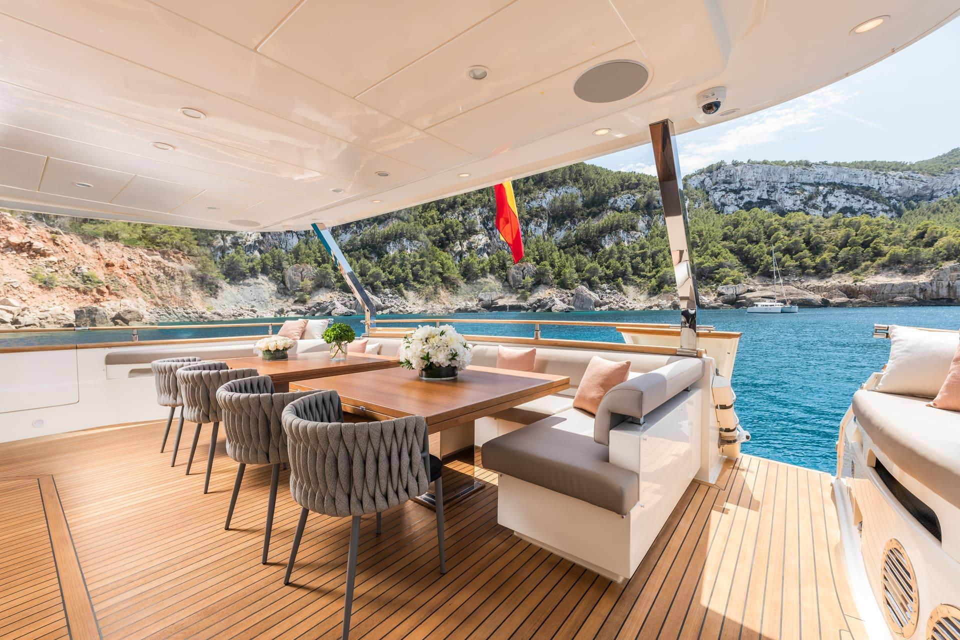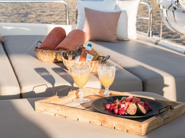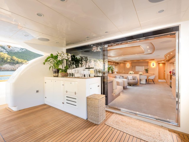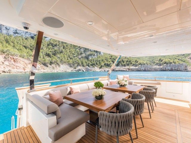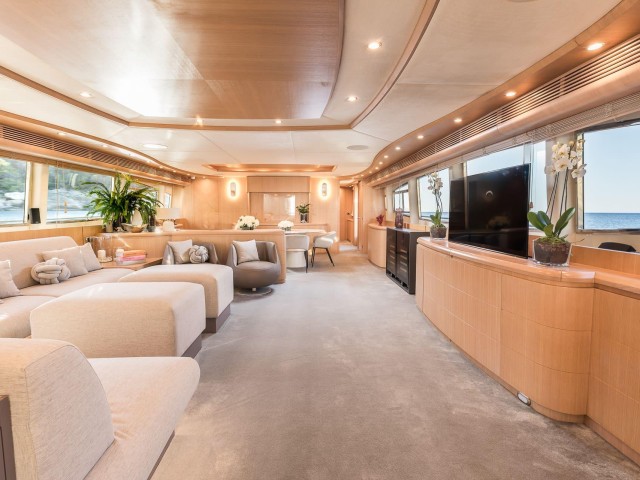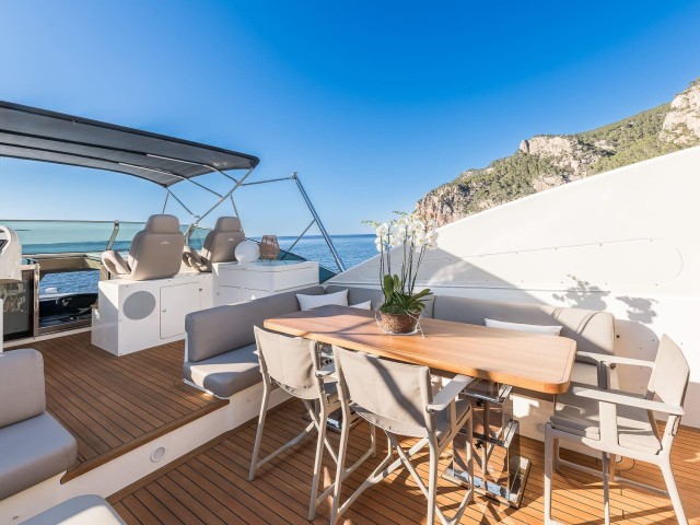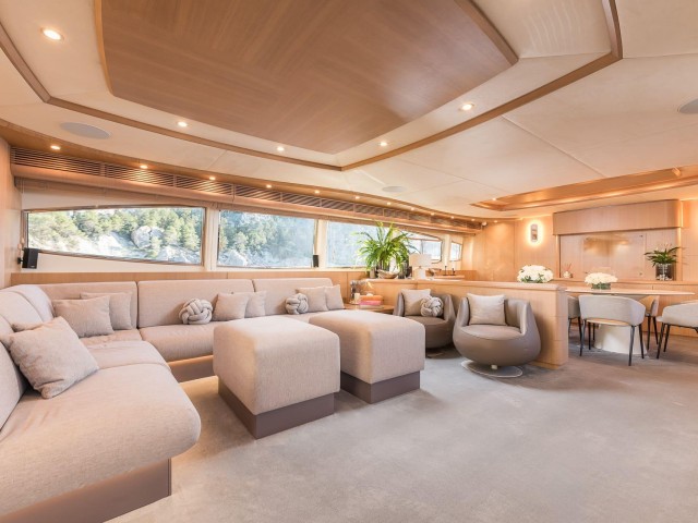 Tras su refit, B4 presenta un estilo moderno y cuidado en todos sus espacios. La inversión realizada ha elevado notablemente el confort y la estética del yate. El salón principal es luminoso y acogedor, con amplias zonas de estar y grandes ventanales que aportan luz natural. Las áreas exteriores ofrecen múltiples opciones para relajarse, tomar el sol o disfrutar de comidas al aire libre.