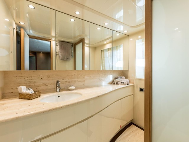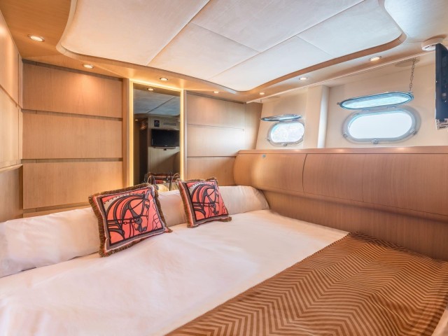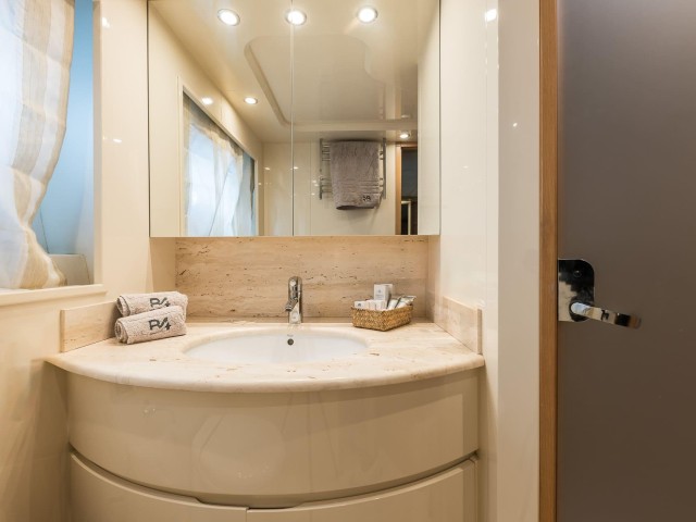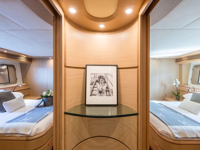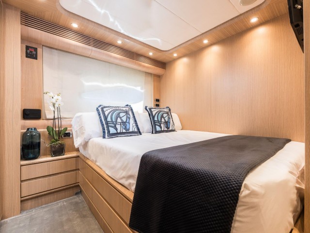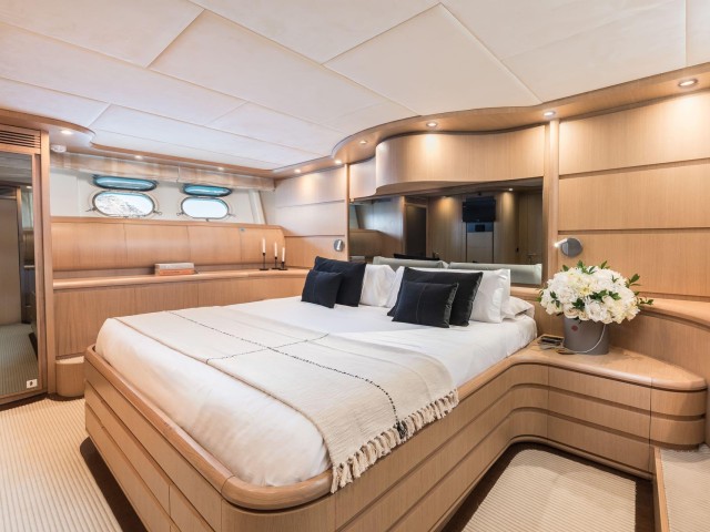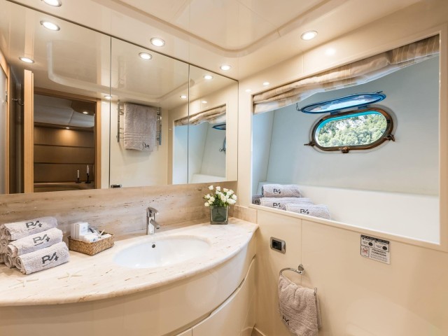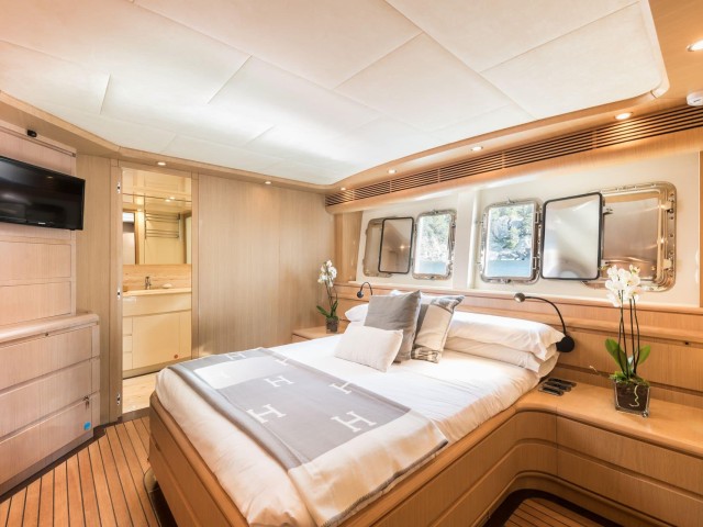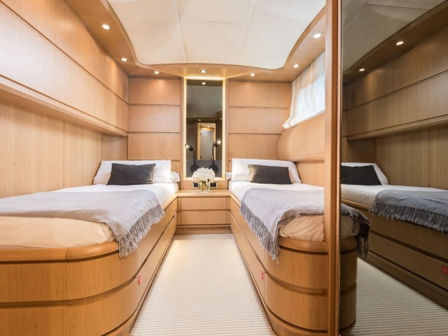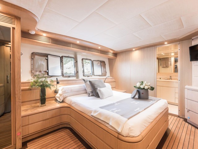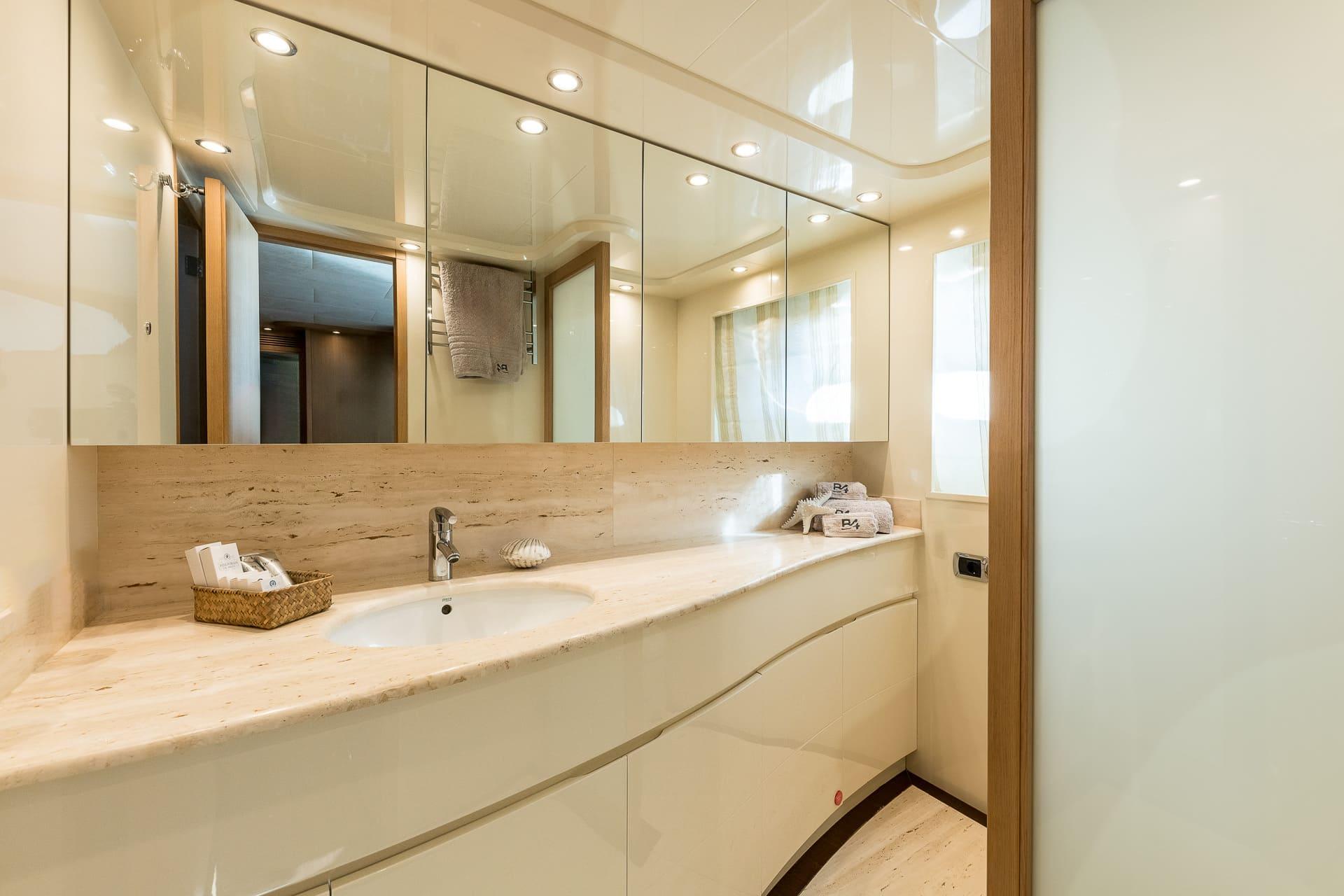 B4 puede alojar hasta doce invitados en seis cabinas, todas con baño privado. La distribución es muy flexible y se adapta perfectamente a diferentes tipos de grupos. Incluye una cabina principal en proa, dos cabinas VIP, una cabina doble en la cubierta principal y dos cabinas twin convertibles en dobles, cada una con camas Pullman adicionales.