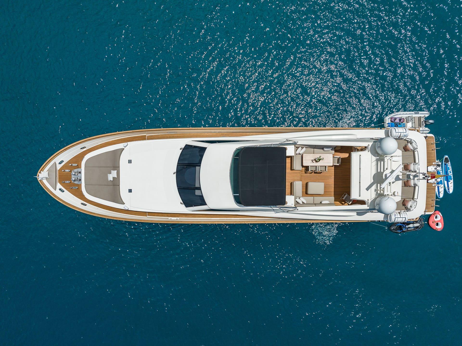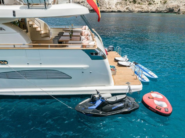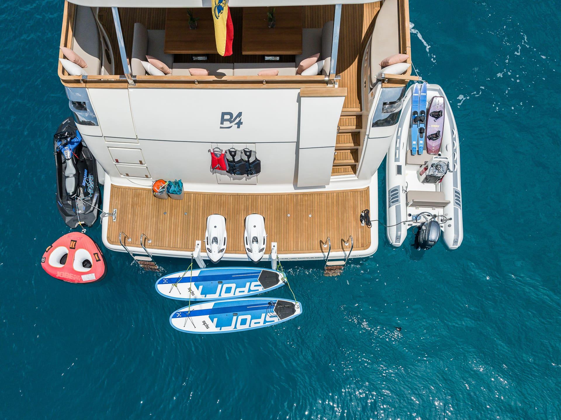 Los espacios exteriores están diseñados para disfrutar plenamente del mar, con zonas amplias para descansar y socializar. El yate dispone de una excelente selección de juguetes acuáticos, incluyendo tender Novurania de 4,02 m, jet ski, dos Seabobs, wakeboard, esquís acuáticos, paddleboards y towable inflable, además de equipo de snorkel.