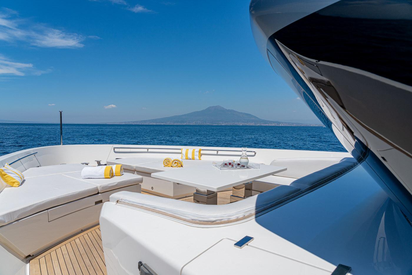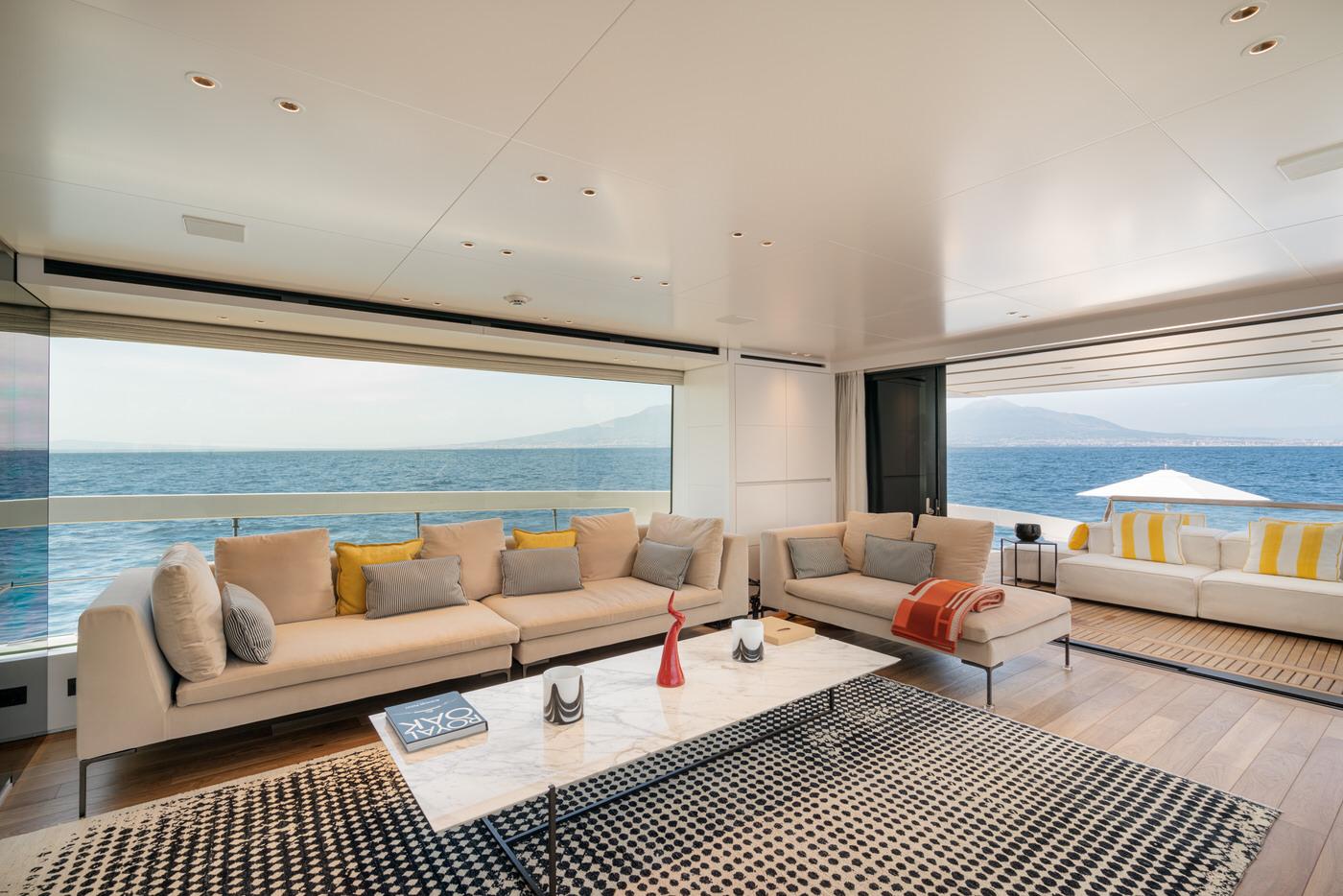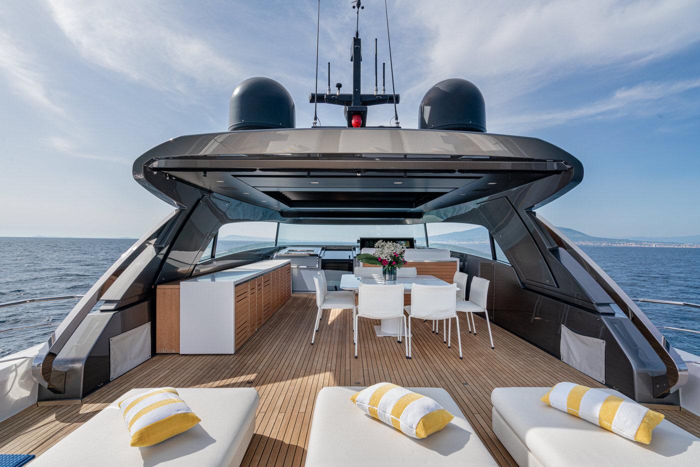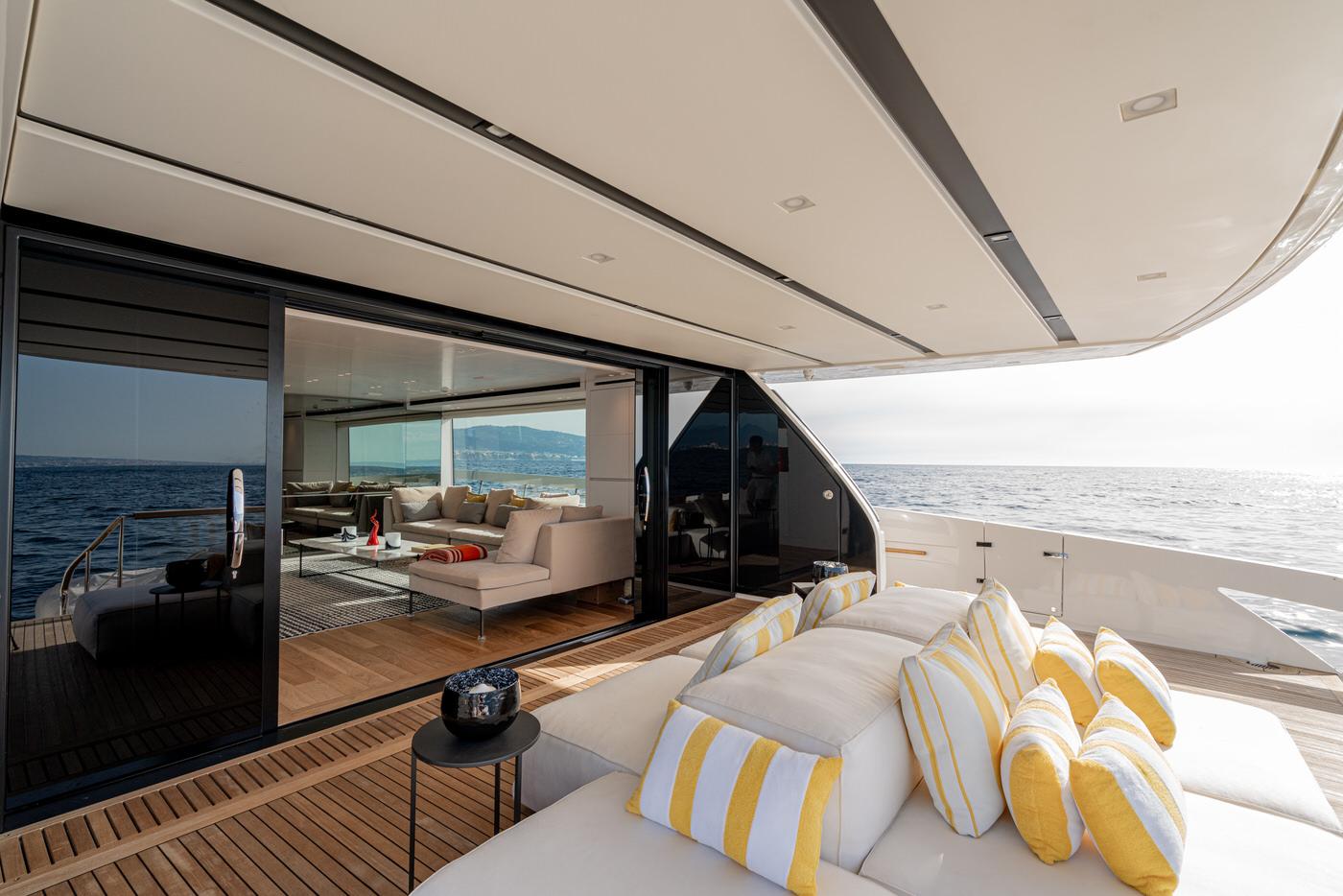 La cubierta principal conecta de manera natural con las zonas exteriores, ofreciendo diferentes espacios para disfrutar a lo largo del día. En la proa, una zona lounge con solárium ofrece un rincón tranquilo y privado con vistas abiertas al mar.