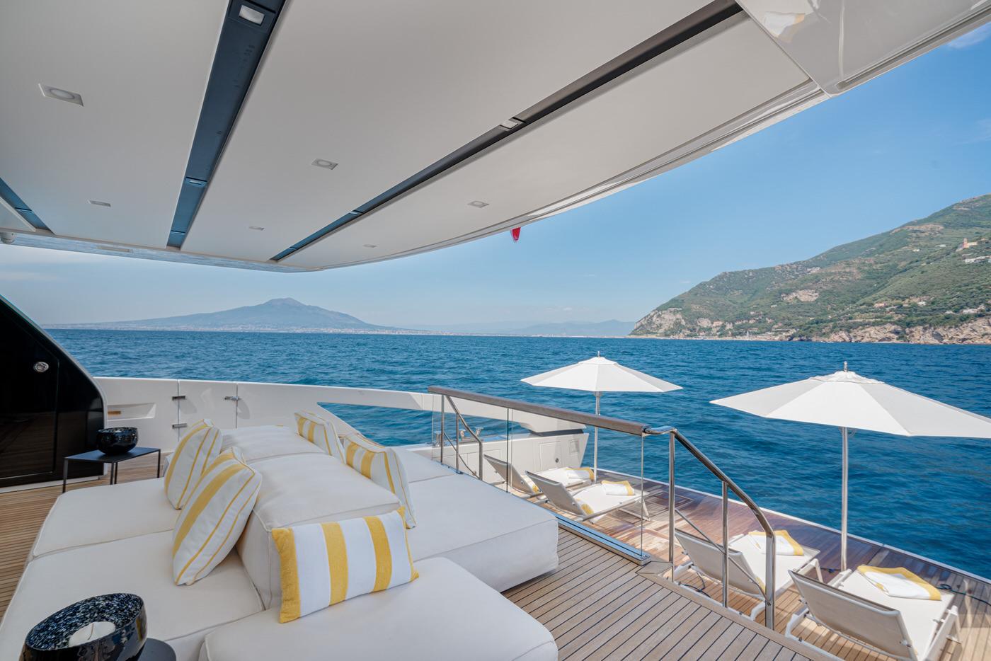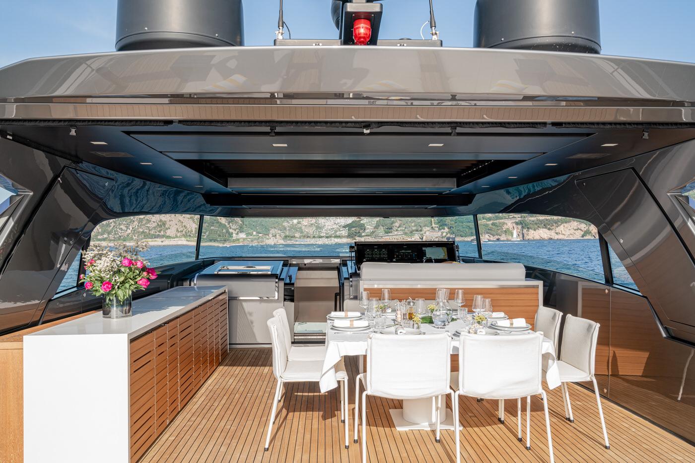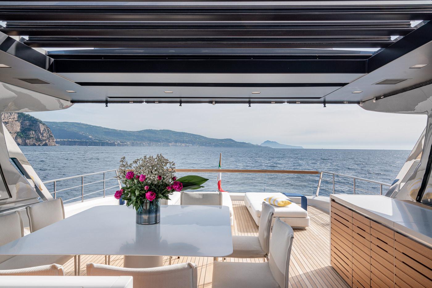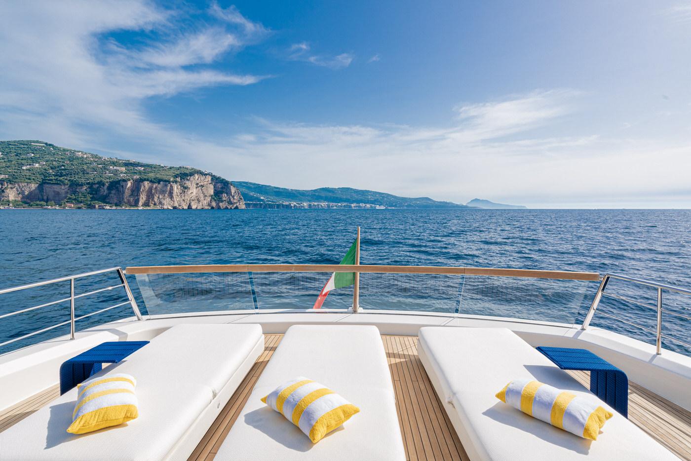 La cubierta principal conecta de manera natural con las zonas exteriores, ofreciendo diferentes espacios para disfrutar a lo largo del día. En la proa, una zona lounge con solárium ofrece un rincón tranquilo y privado con vistas abiertas al mar.