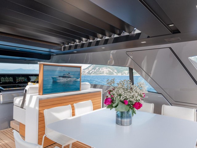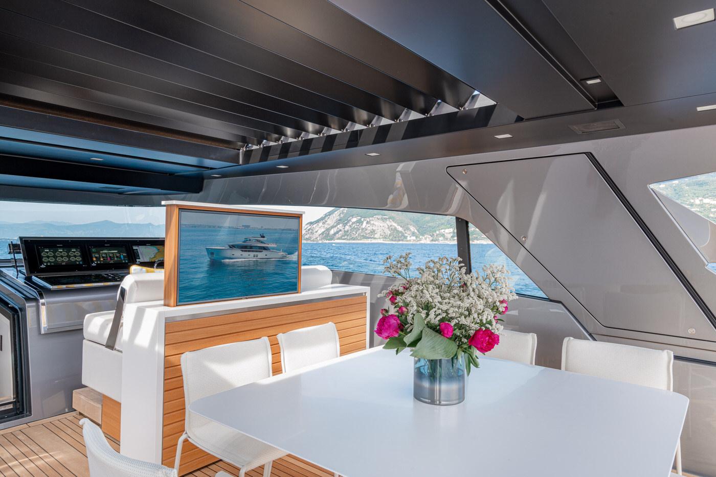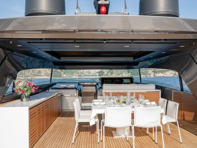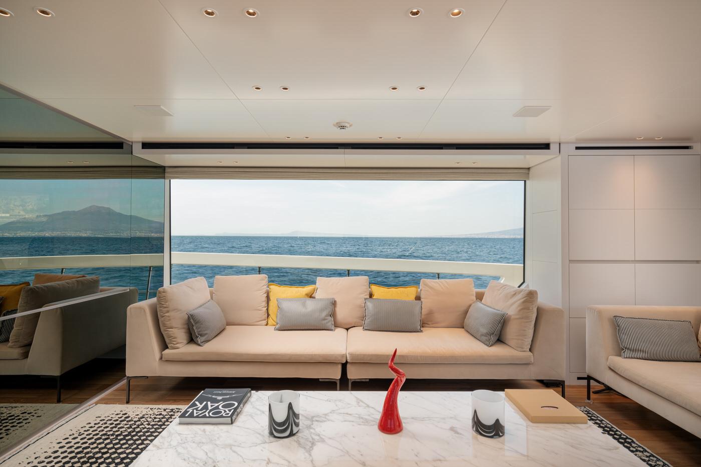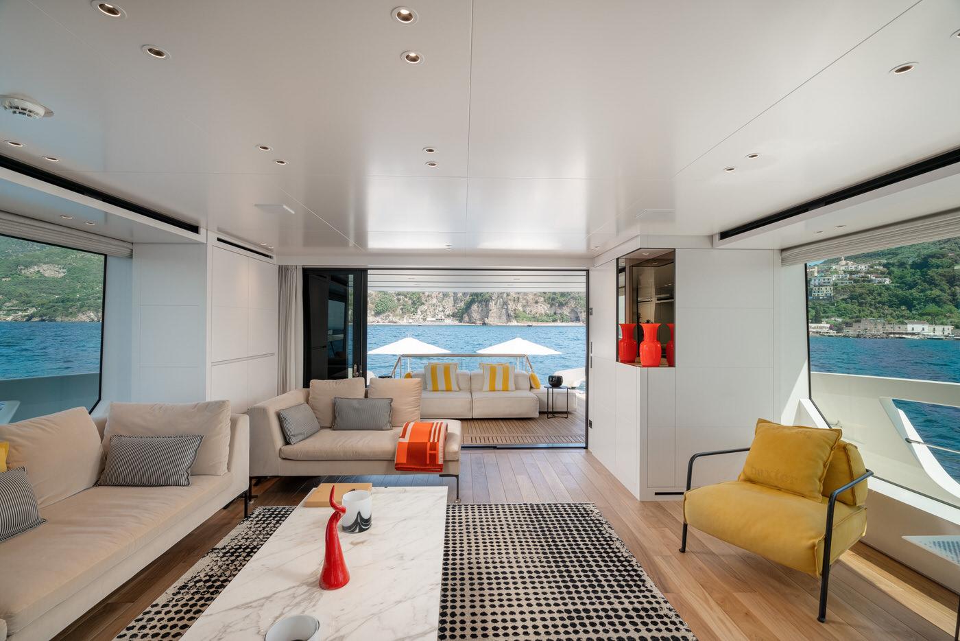 La cubierta principal conecta de manera natural con las zonas exteriores, ofreciendo diferentes espacios para disfrutar a lo largo del día. En la proa, una zona lounge con solárium ofrece un rincón tranquilo y privado con vistas abiertas al mar.