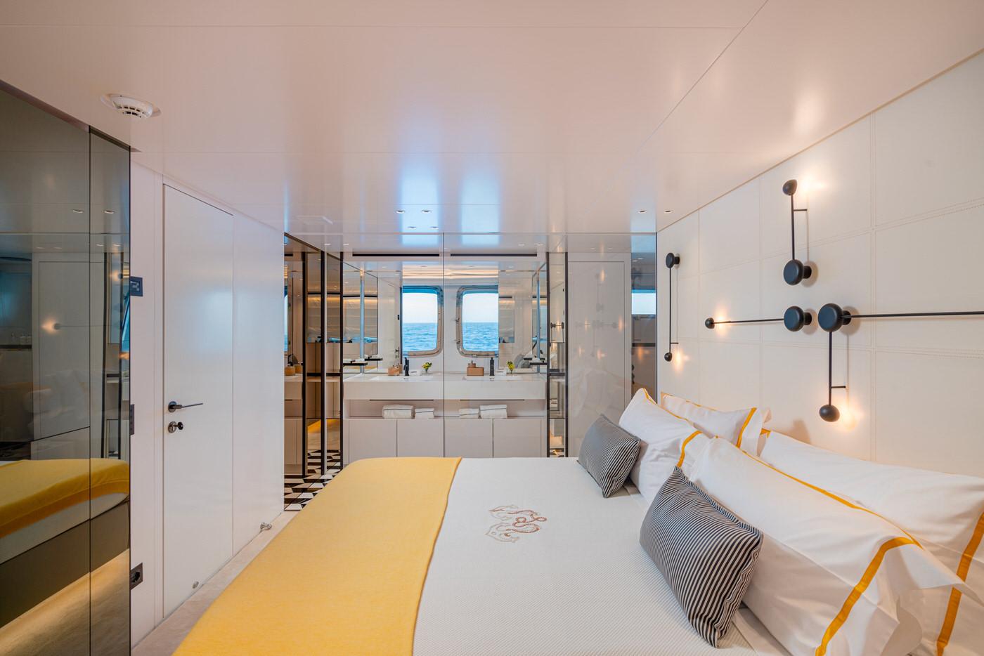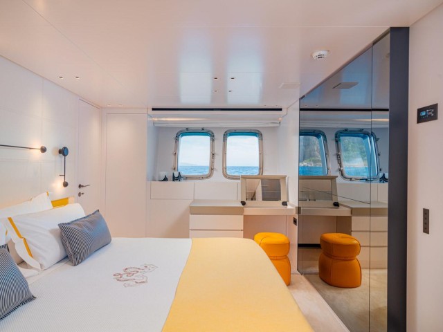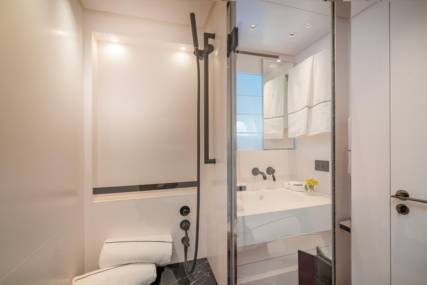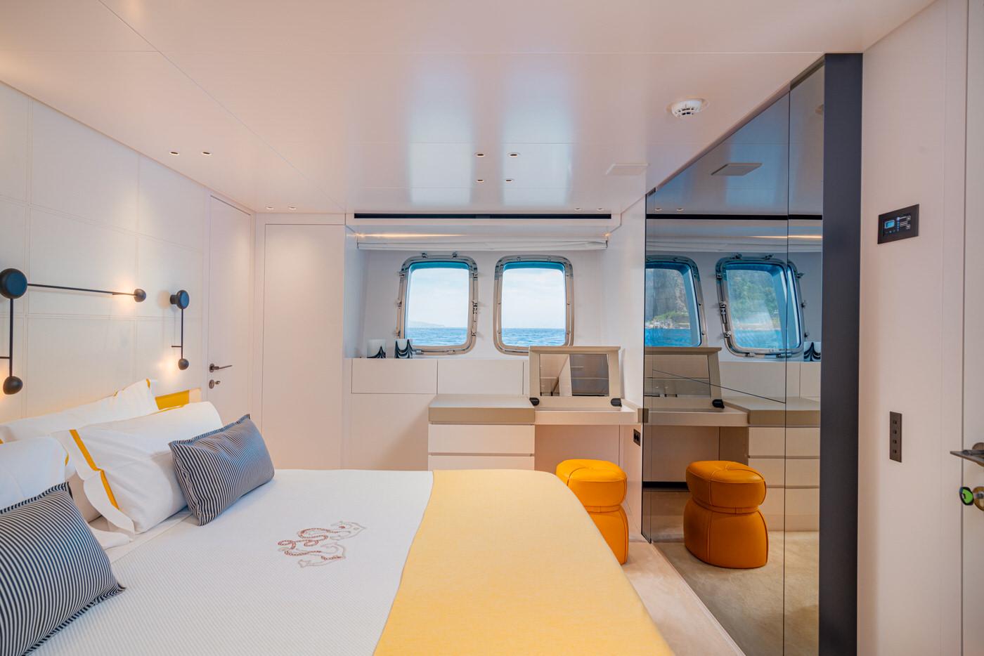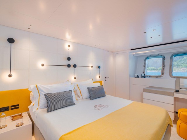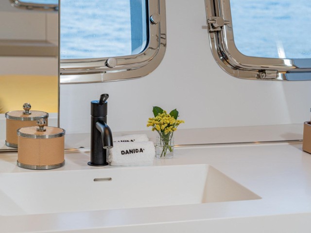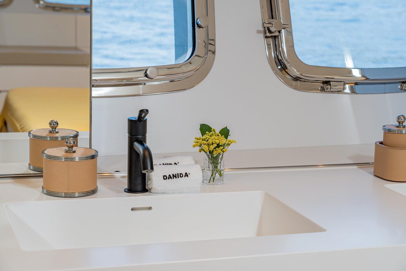 Danida puede alojar hasta ocho invitados en cuatro cabinas, todas con baño en suite. La cabina principal, junto con una cabina VIP y dos cabinas twin, ofrece un diseño equilibrado y acogedor, pensado para garantizar descanso y privacidad durante toda la estancia.
