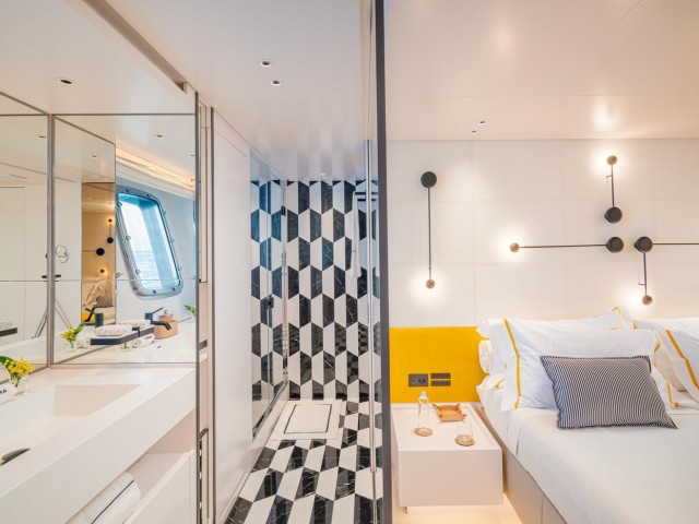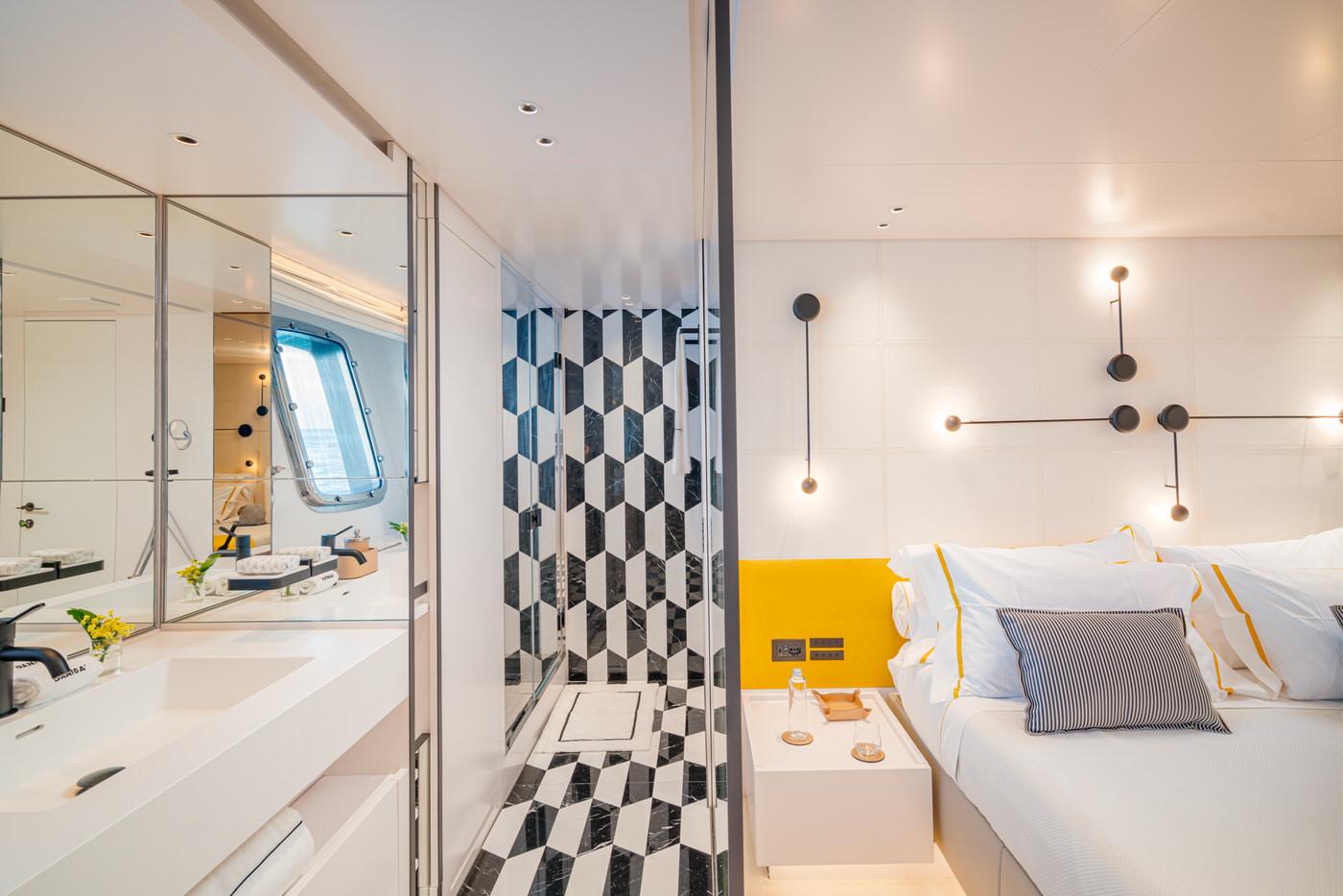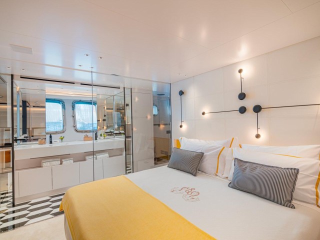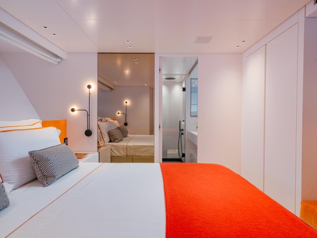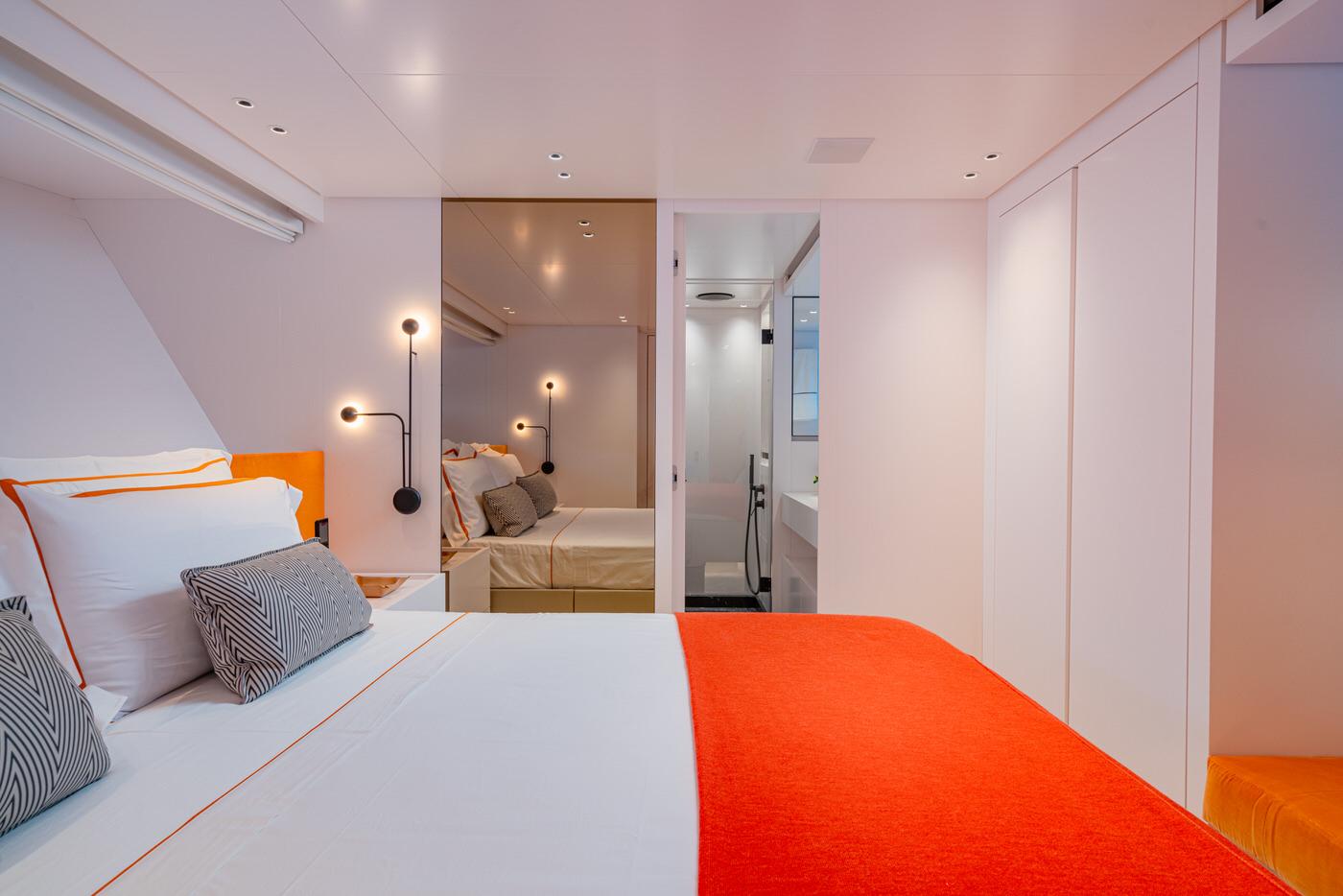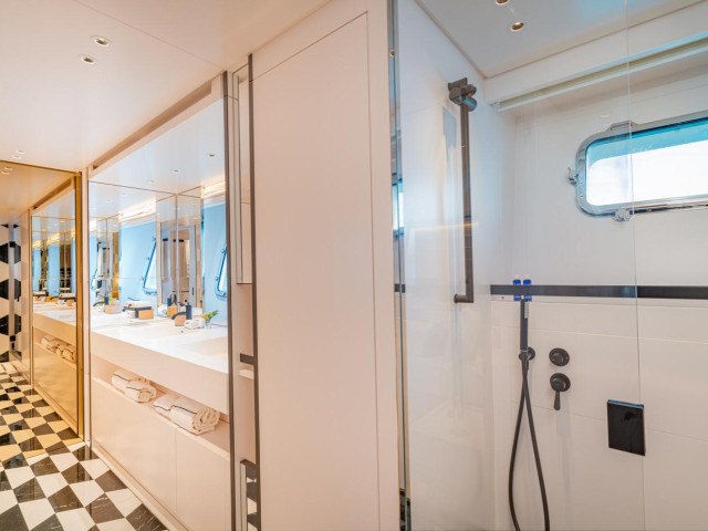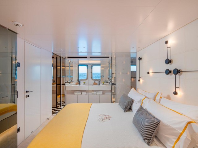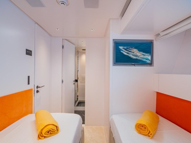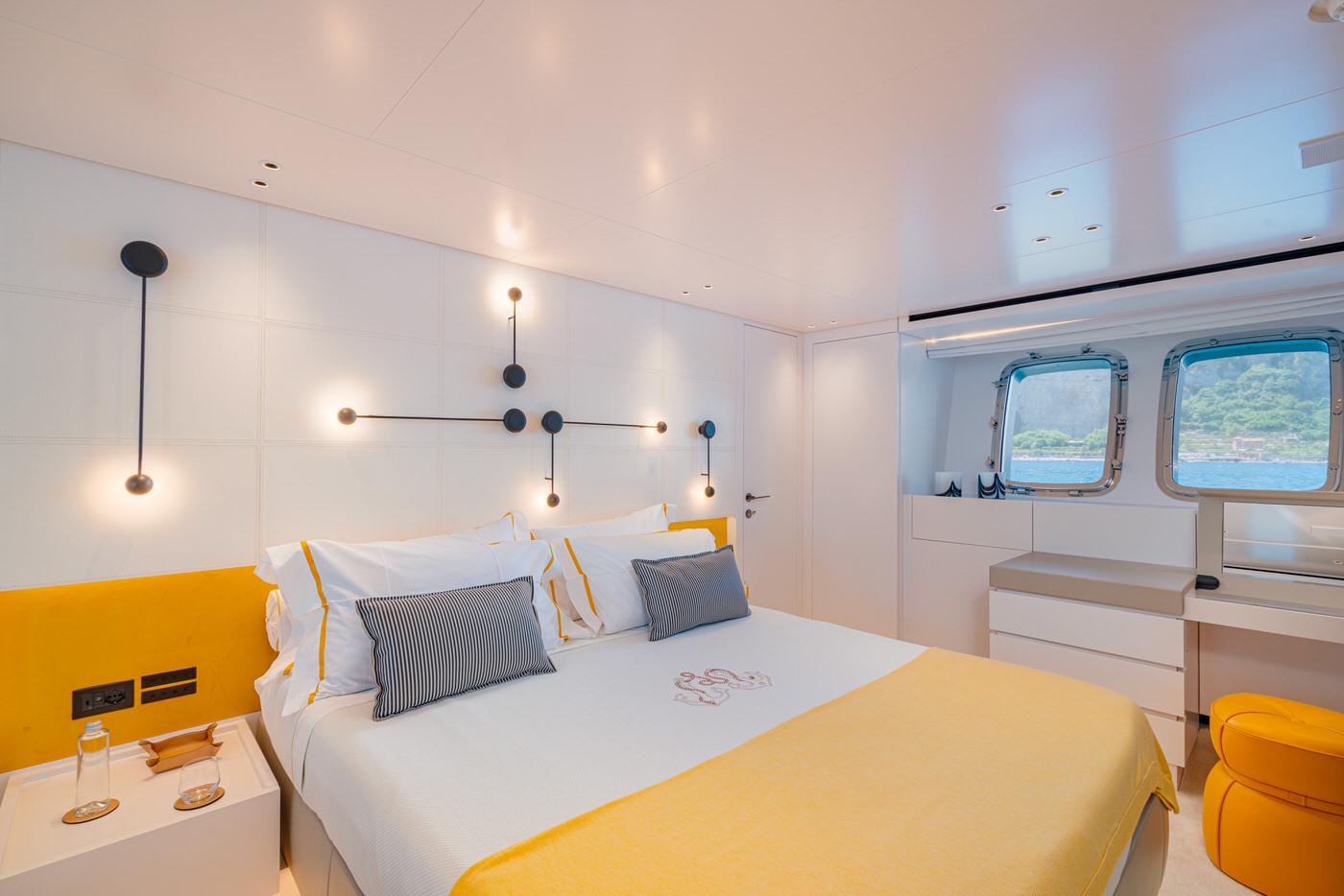 Danida puede alojar hasta ocho invitados en cuatro cabinas, todas con baño en suite. La cabina principal, junto con una cabina VIP y dos cabinas twin, ofrece un diseño equilibrado y acogedor, pensado para garantizar descanso y privacidad durante toda la estancia.