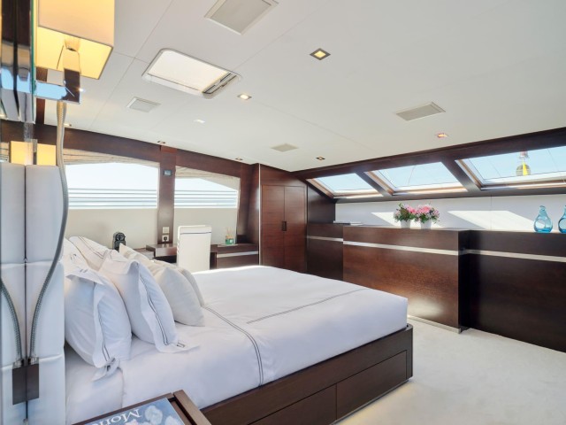 Hakuna Matata cuenta con seis cabinas elegantemente decoradas, ofreciendo un refugio perfecto para cada invitado. En la cubierta principal se encuentra la suite VIP, equipada con una cama king-size, un vestidor y un baño privado. En la cubierta inferior, destaca la impresionante suite principal de ancho completo, que incluye una cama king-size, sofá, escritorio, vestidor y un lujoso baño con ducha y bañera equipada con televisión integrada. Dos suites VIP con camas queen-size y baños privados, así como dos cabinas dobles, cada una con una litera Pullman y baño en suite, ofrecen un confort adicional y flexibilidad para familias o grupos.