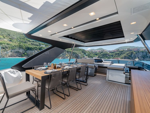 La gran zona del flybridge de Lucky es perfecta para relajarse mientras se absorben las encantadoras vistas al mar y ofrece sombra del viento y el sol. La cubierta de popa incluso cuenta con una maravillosa mesa de comedor donde se puede disfrutar cómodamente de comidas capturadas directamente del mar, o relajarse en el cómodo sofá. Si hay demasiada brisa para disfrutar adecuadamente de sus platos gourmet, baje las escaleras para protegerse del viento y disponer de más espacio para sentarse. Lucky es el yate perfecto para grupos que disfrutan tanto de la socialización como de un rato tranquilo de lectura, ya que el espacio está organizado de forma eficiente para proporcionar tanto numerosas opciones de asiento como rincones tranquilos.