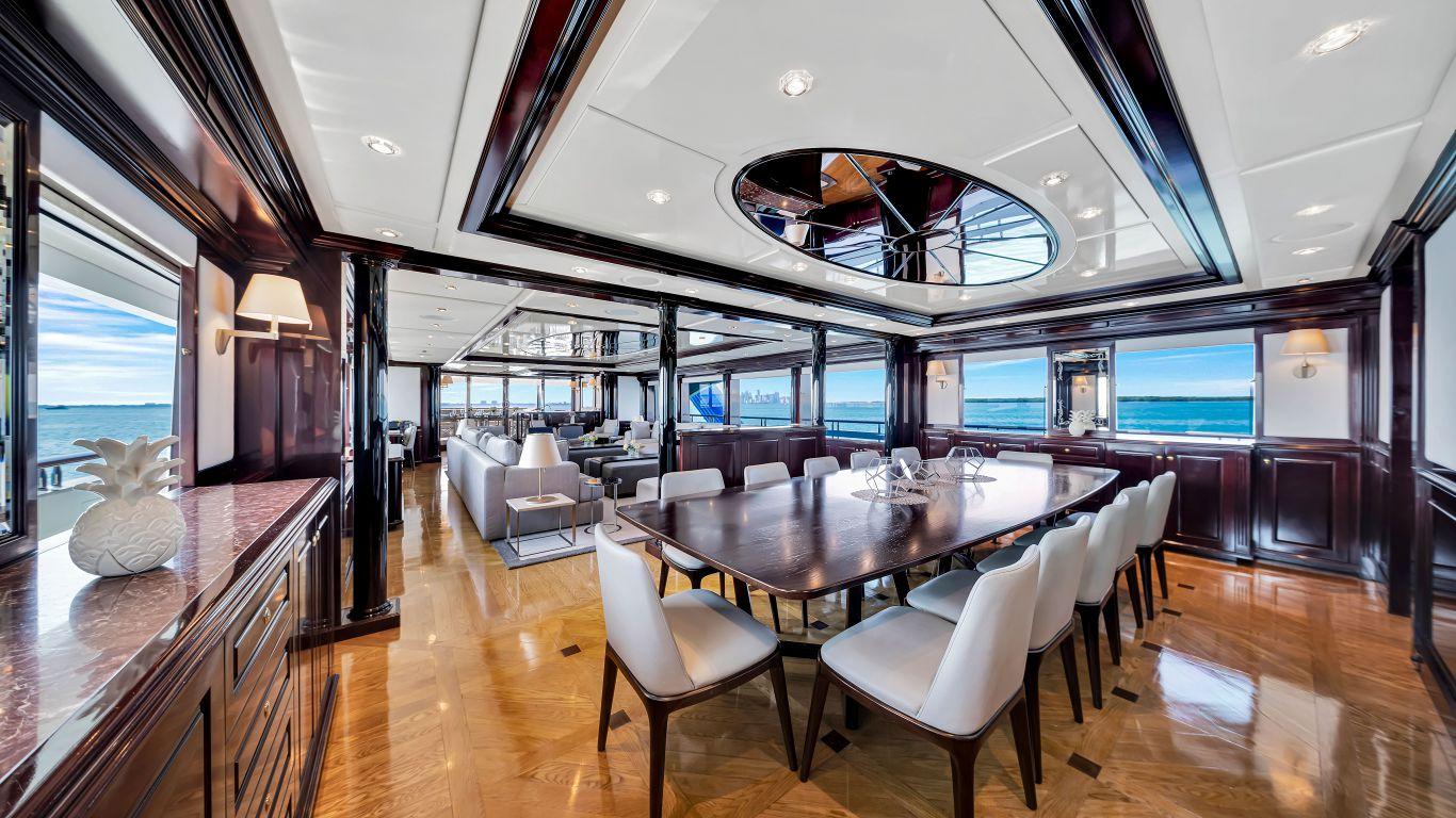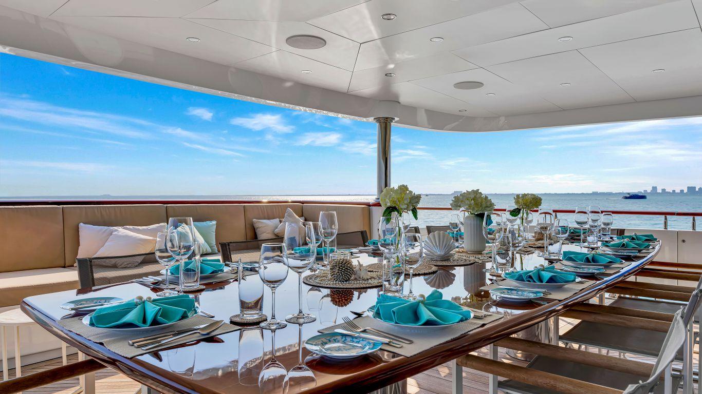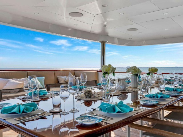 Su salón principal es un acogedor centro social, con un gran bar para cócteles nocturnos y reuniones relajadas. Los huéspedes pueden disfrutar de cenas al aire libre en la cubierta de popa con vistas al mar o cenar con estilo en el comedor interior climatizado de la cubierta principal. Todos los espacios a bordo están diseñados para fomentar la conexión y crear momentos compartidos memorables, ya sea durante una cena a la luz de las velas o una copa por la tarde junto al mar.