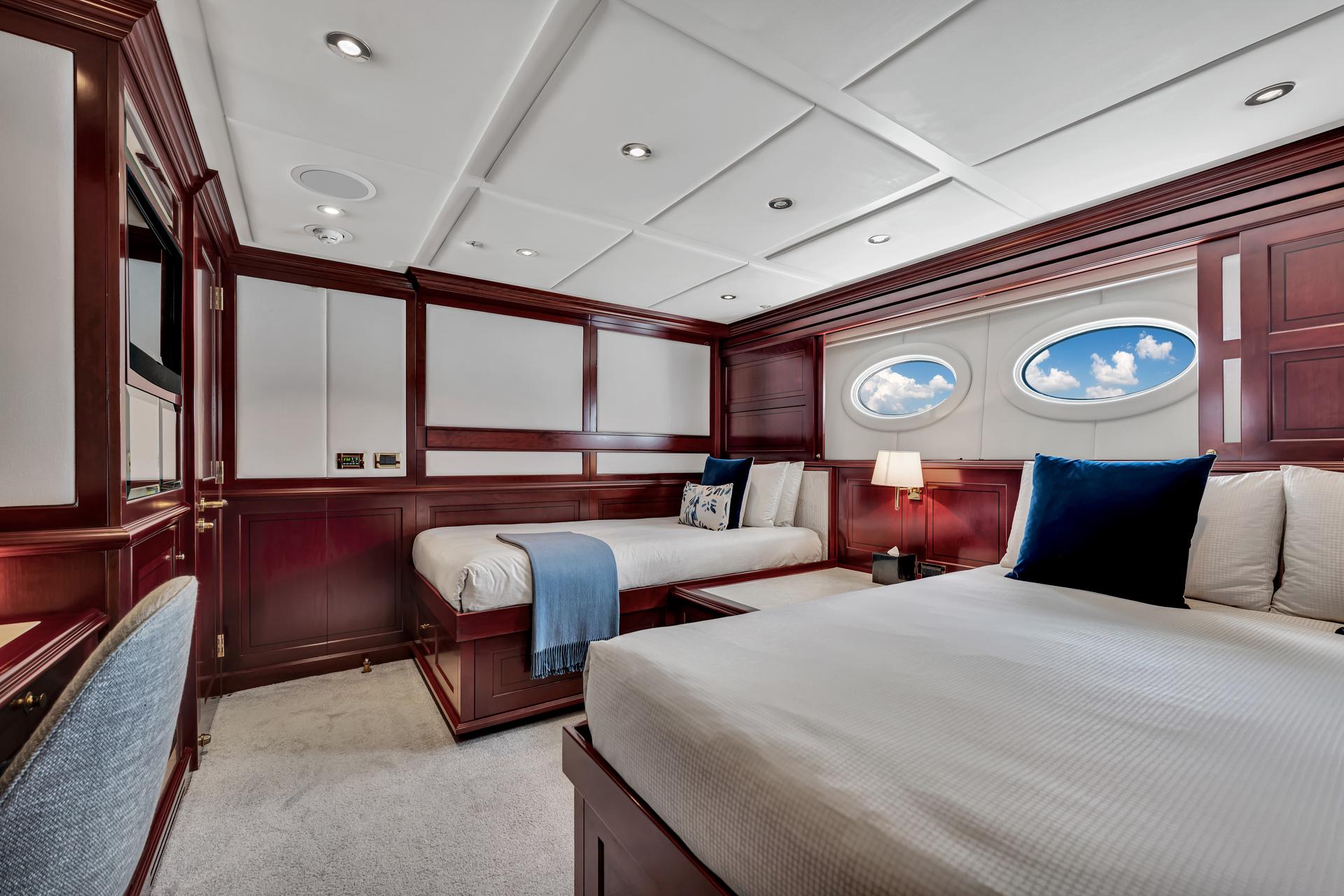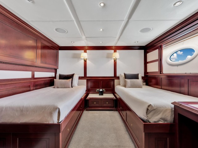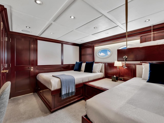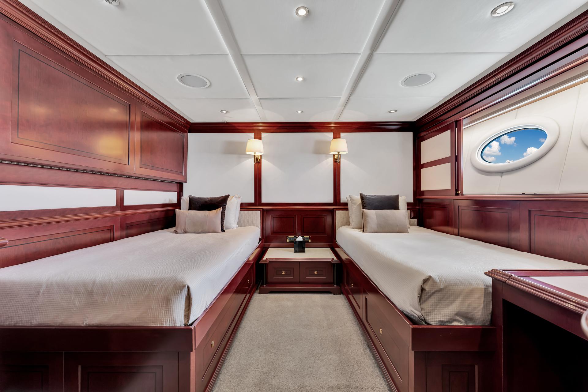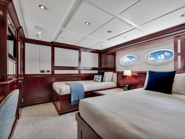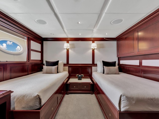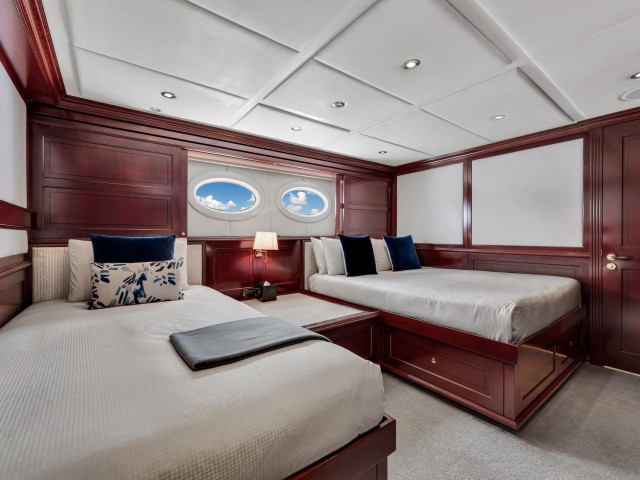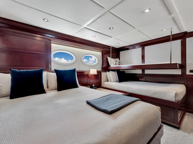 Junto a la suite principal, una «cabina de mayordomo» doble ofrece un alojamiento cómodo para niños pequeños, una niñera o personal de servicio. En la cubierta principal, un camarote doble adicional ofrece comodidad y privacidad, mientras que la cubierta inferior alberga dos camarotes triples con cama queen y dos camas individuales, cada uno con baño privado, junto con dos camarotes dobles con literas Pullman. Con un total de 13 camas más dos literas Pullman, la distribución es ideal para familias numerosas, grupos de amigos o fiestas que requieran una combinación de camas dobles e individuales.