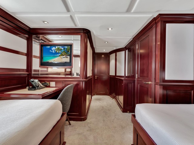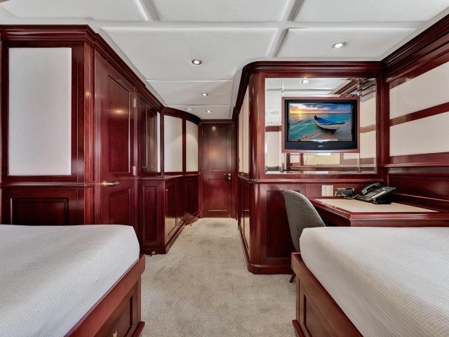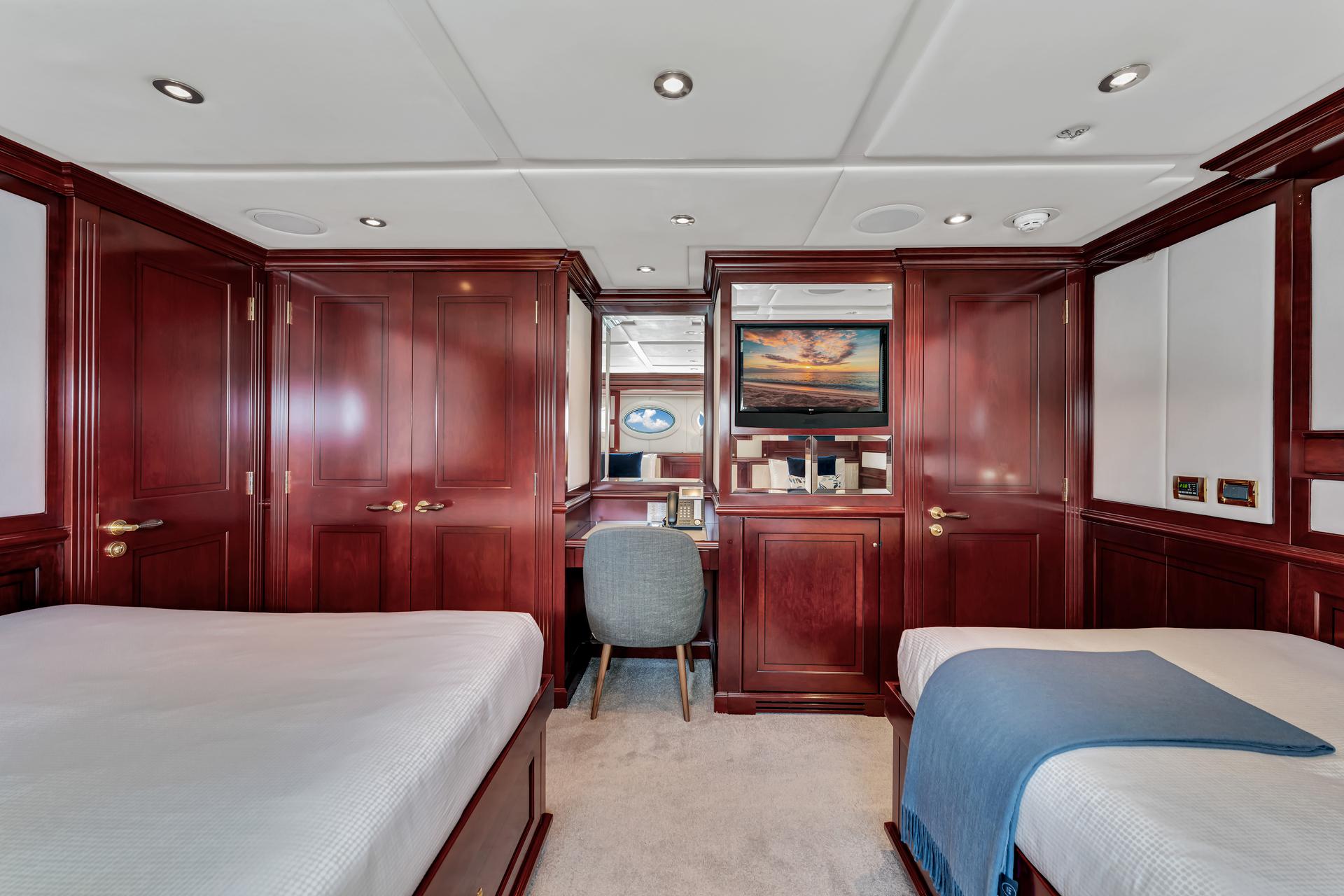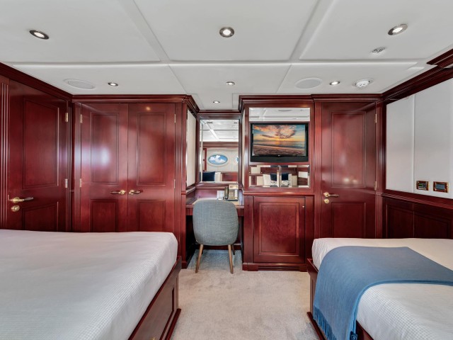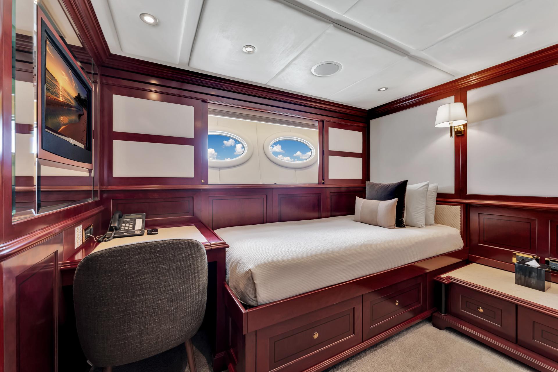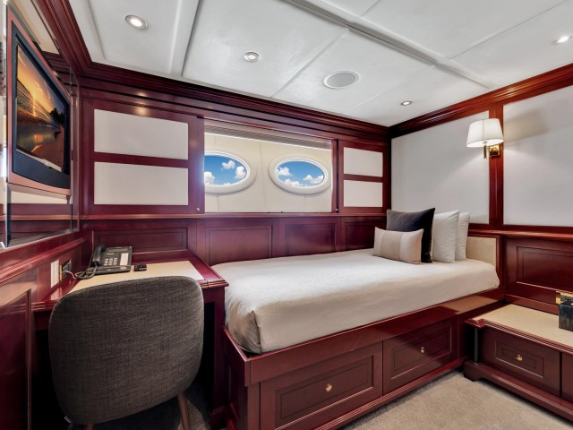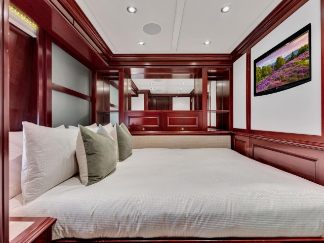 Junto a la suite principal, una «cabina de mayordomo» doble ofrece un alojamiento cómodo para niños pequeños, una niñera o personal de servicio. En la cubierta principal, un camarote doble adicional ofrece comodidad y privacidad, mientras que la cubierta inferior alberga dos camarotes triples con cama queen y dos camas individuales, cada uno con baño privado, junto con dos camarotes dobles con literas Pullman. Con un total de 13 camas más dos literas Pullman, la distribución es ideal para familias numerosas, grupos de amigos o fiestas que requieran una combinación de camas dobles e individuales.