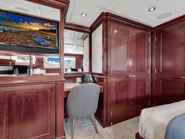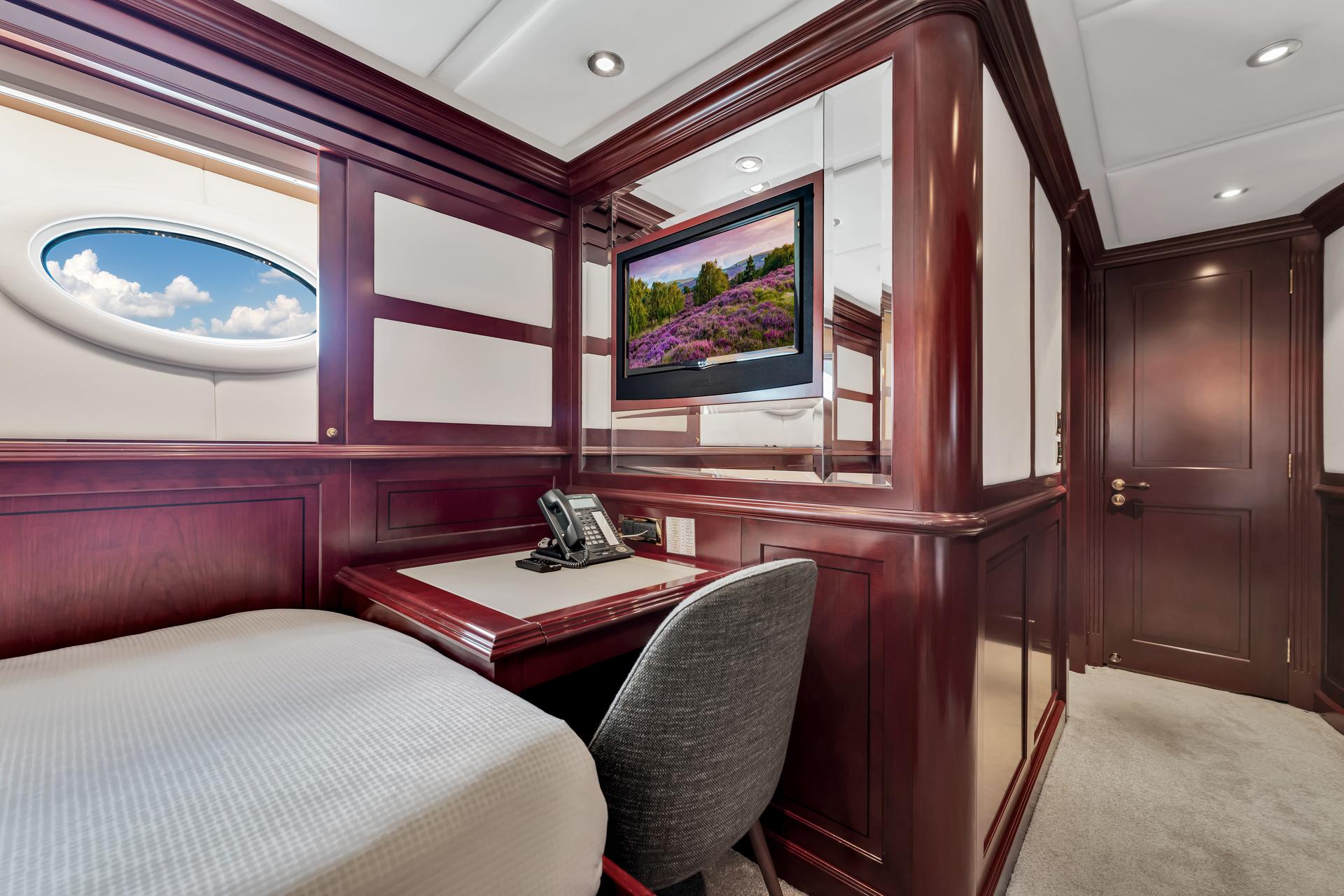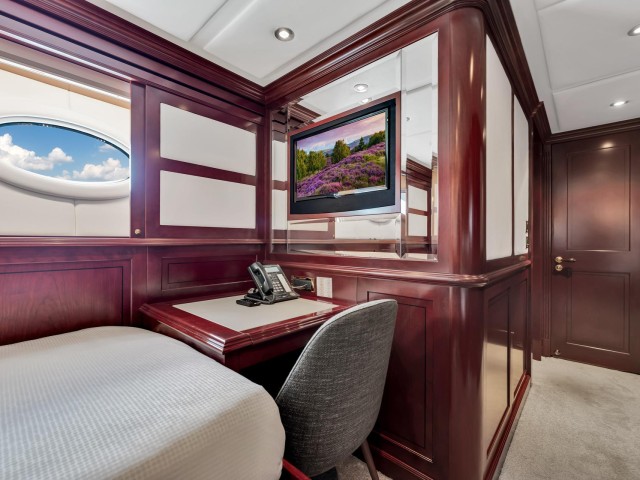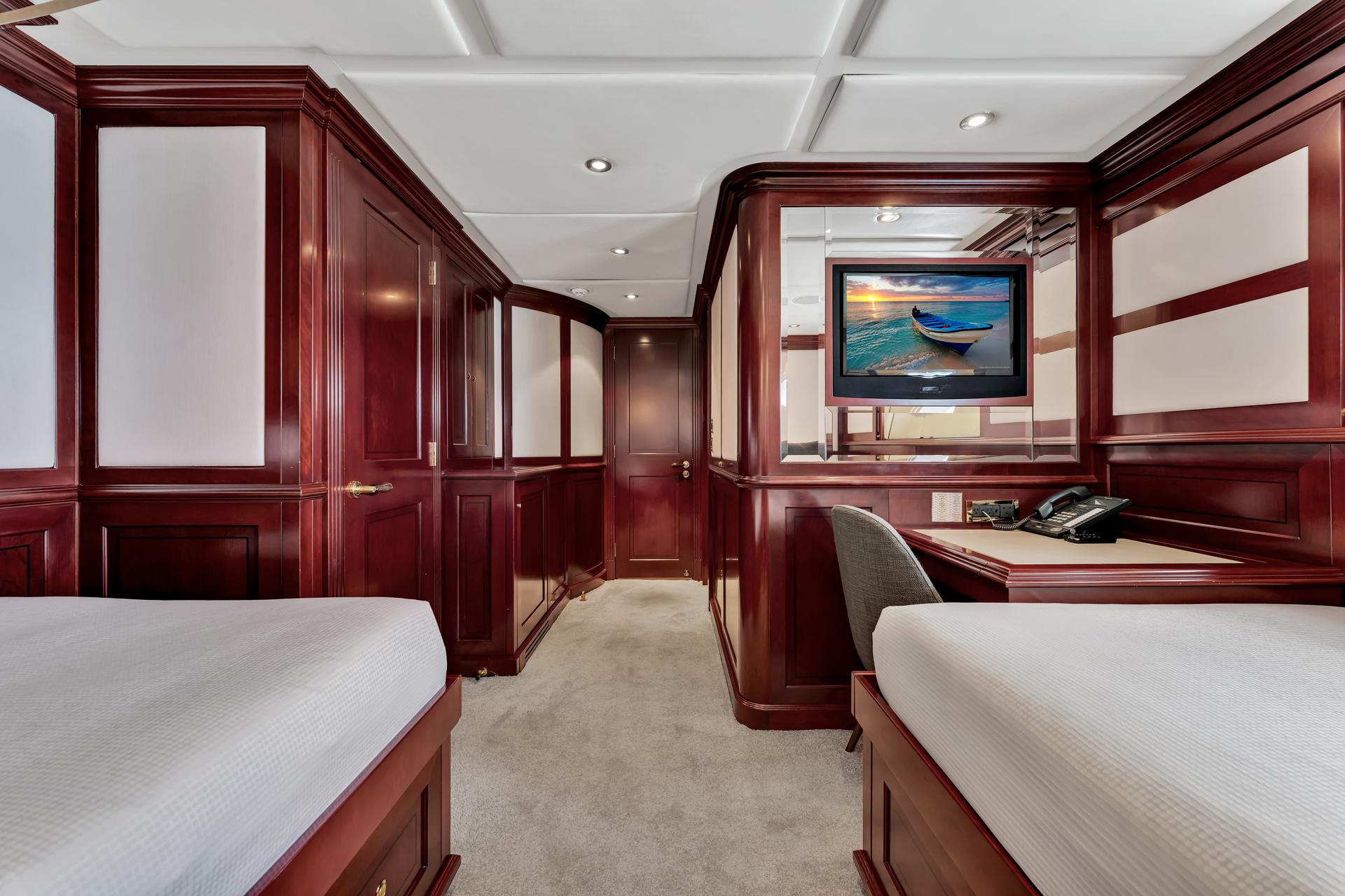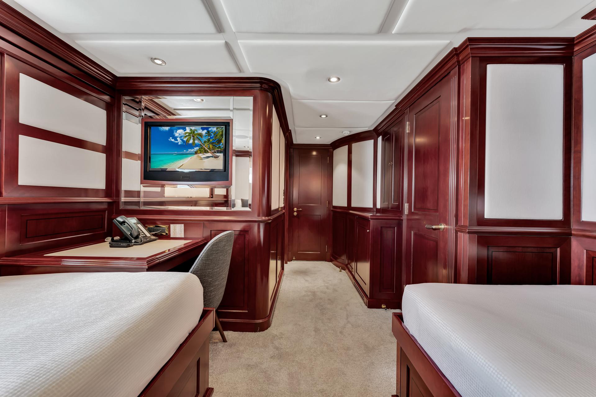 Junto a la suite principal, una «cabina de mayordomo» doble ofrece un alojamiento cómodo para niños pequeños, una niñera o personal de servicio. En la cubierta principal, un camarote doble adicional ofrece comodidad y privacidad, mientras que la cubierta inferior alberga dos camarotes triples con cama queen y dos camas individuales, cada uno con baño privado, junto con dos camarotes dobles con literas Pullman. Con un total de 13 camas más dos literas Pullman, la distribución es ideal para familias numerosas, grupos de amigos o fiestas que requieran una combinación de camas dobles e individuales.