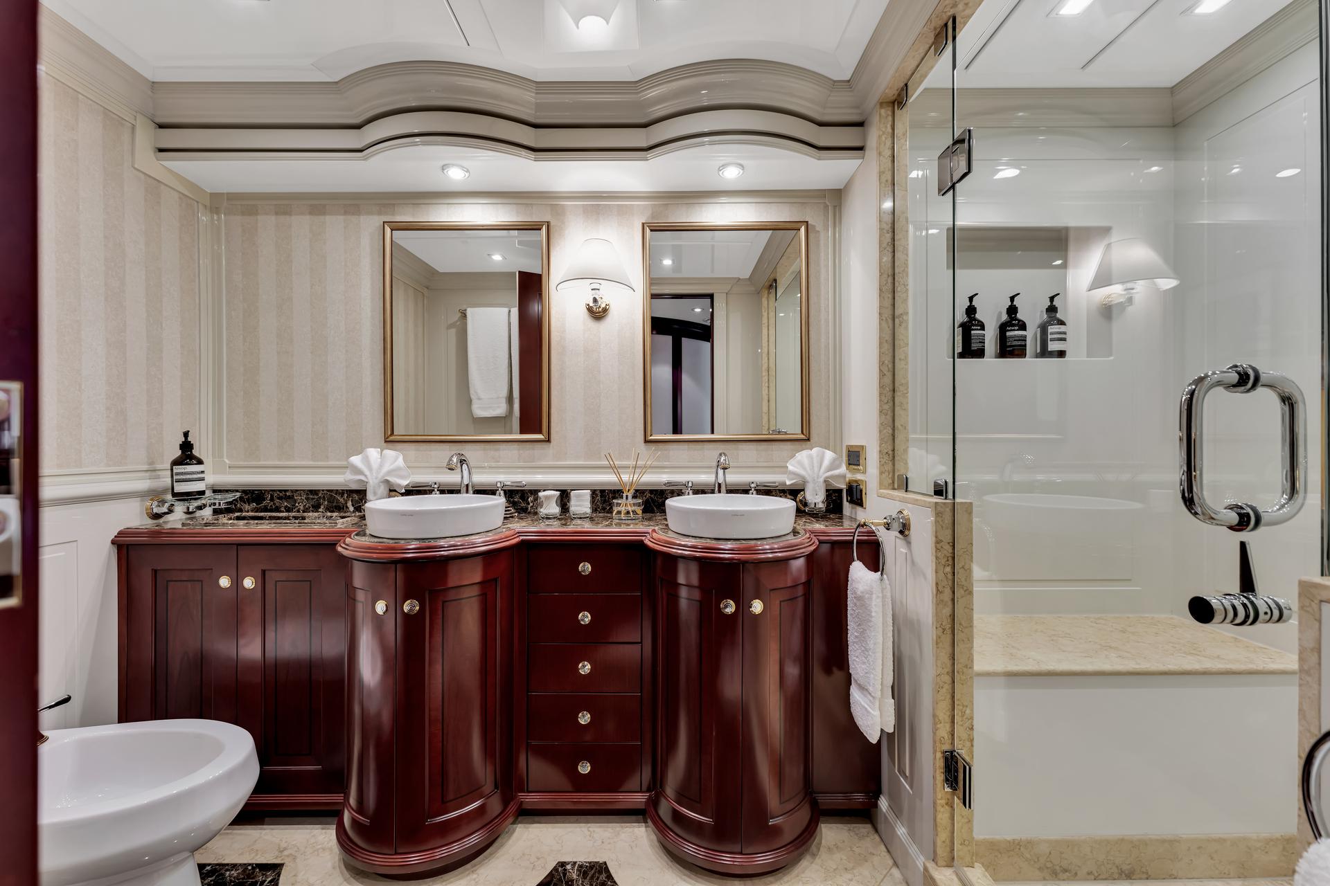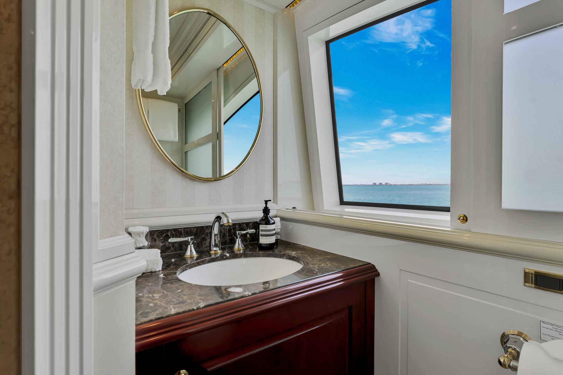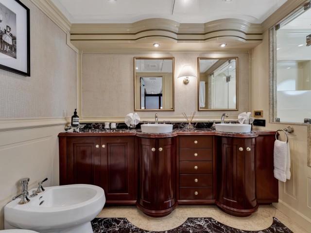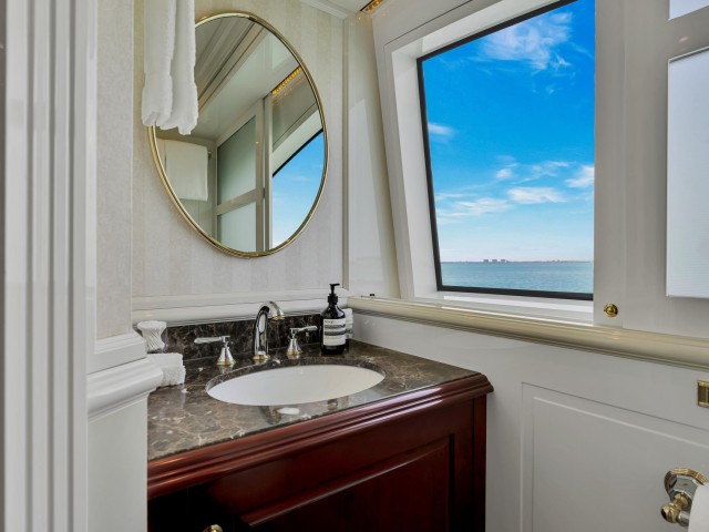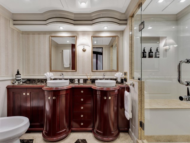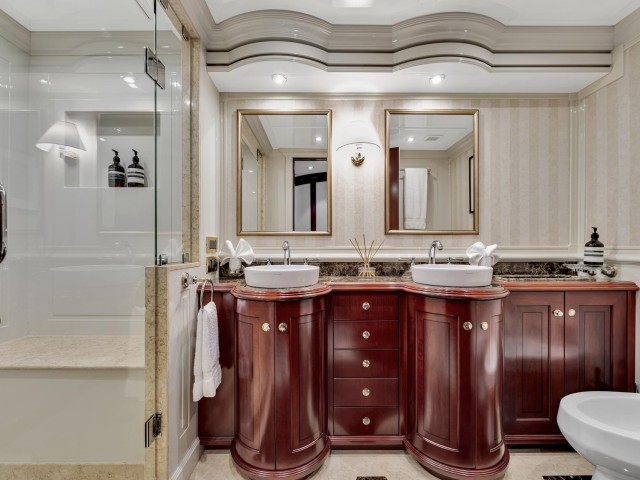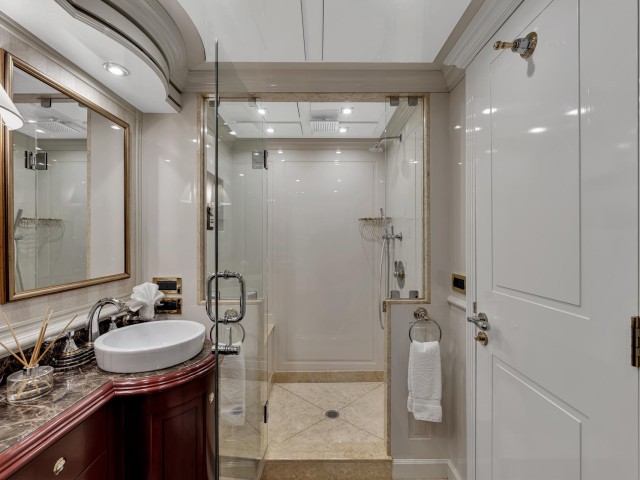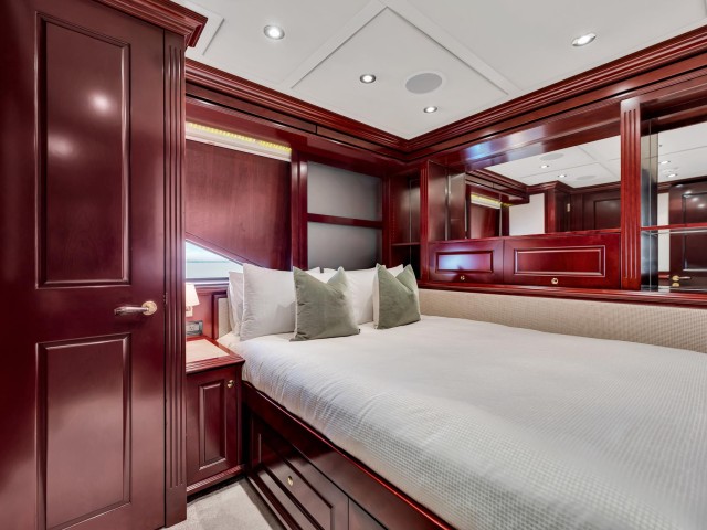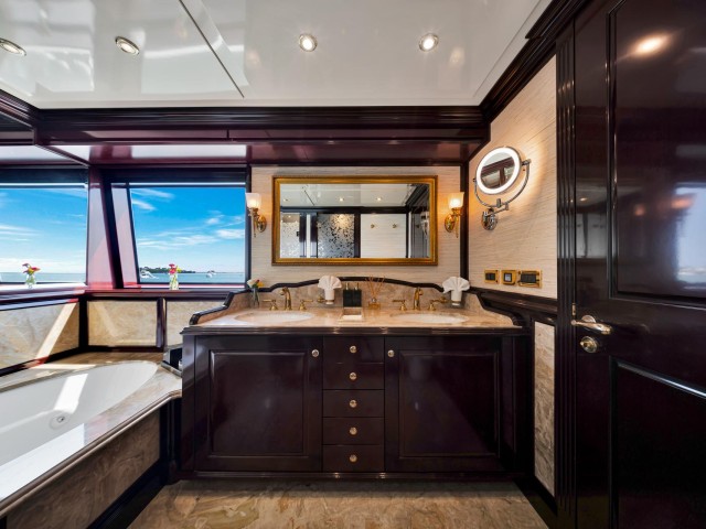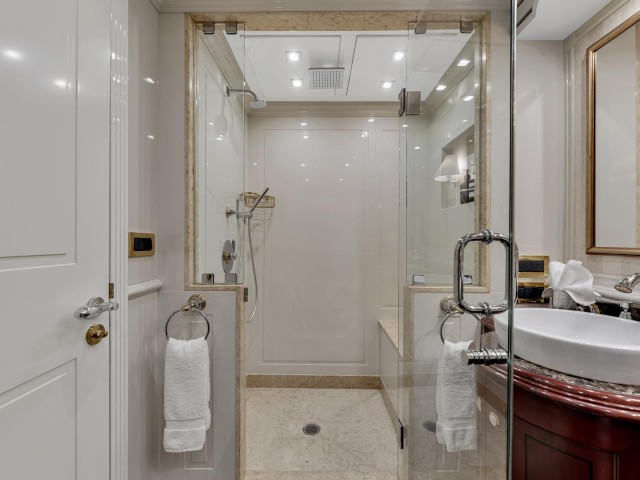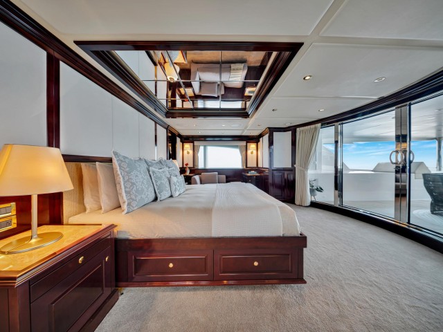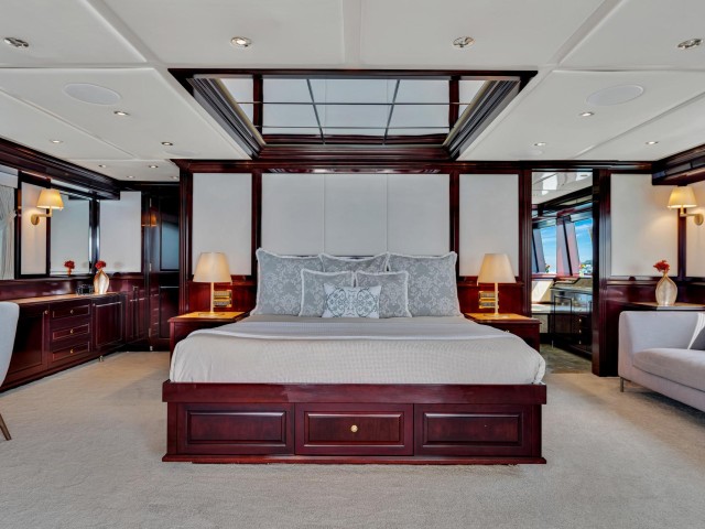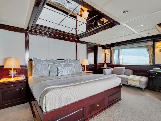 Sweet Caroline ofrece una distribución muy adaptable con siete camarotes para un máximo de 12 huéspedes, lo que proporciona un nivel de flexibilidad poco común. La suite principal de manga completa, situada en la cubierta del skylounge, es un auténtico refugio, con una cama king-size, cuarto de baño en suite con jacuzzi y ducha independiente, y acceso privado a la cubierta de popa para disfrutar de vistas panorámicas con total privacidad.