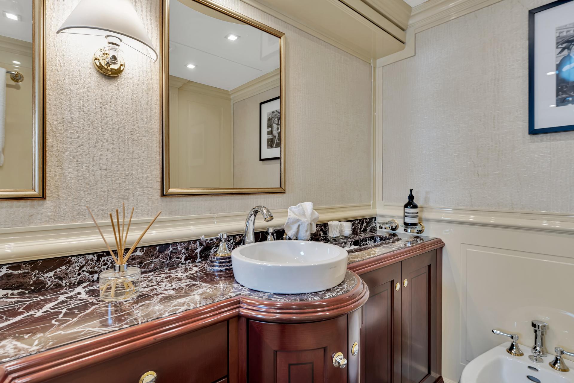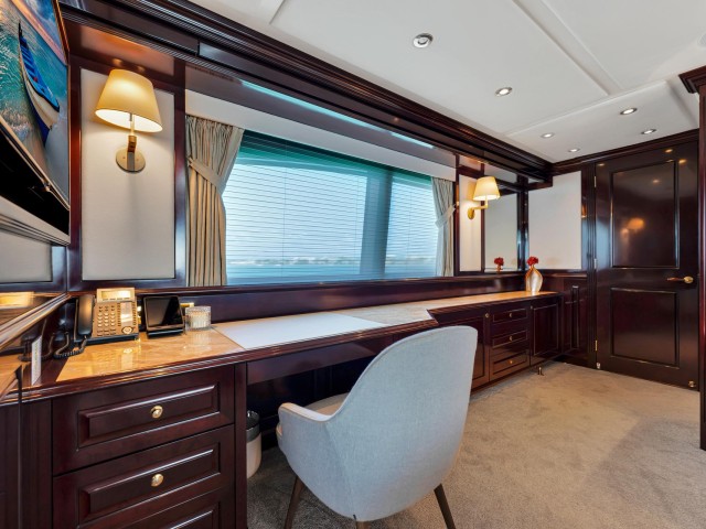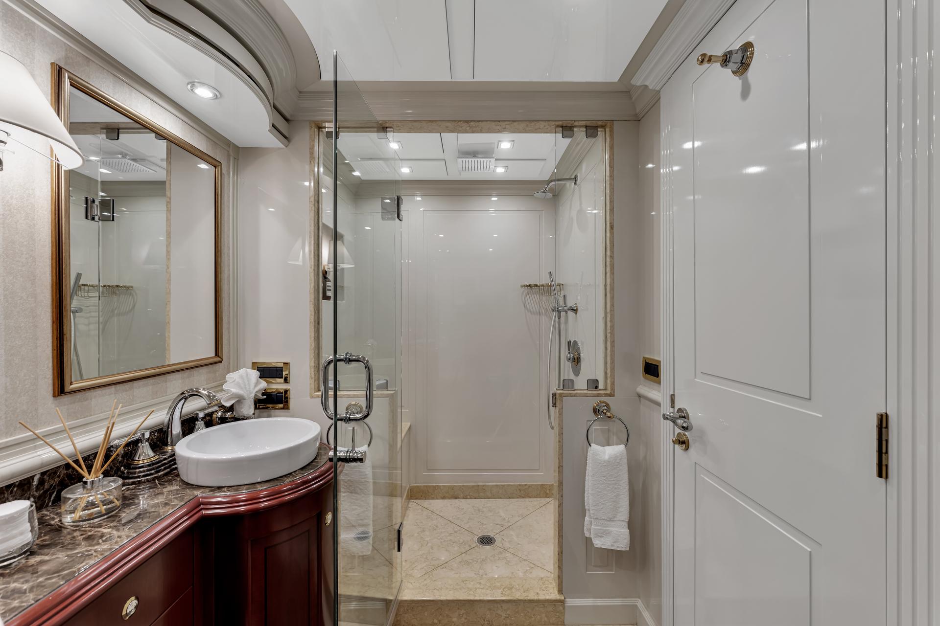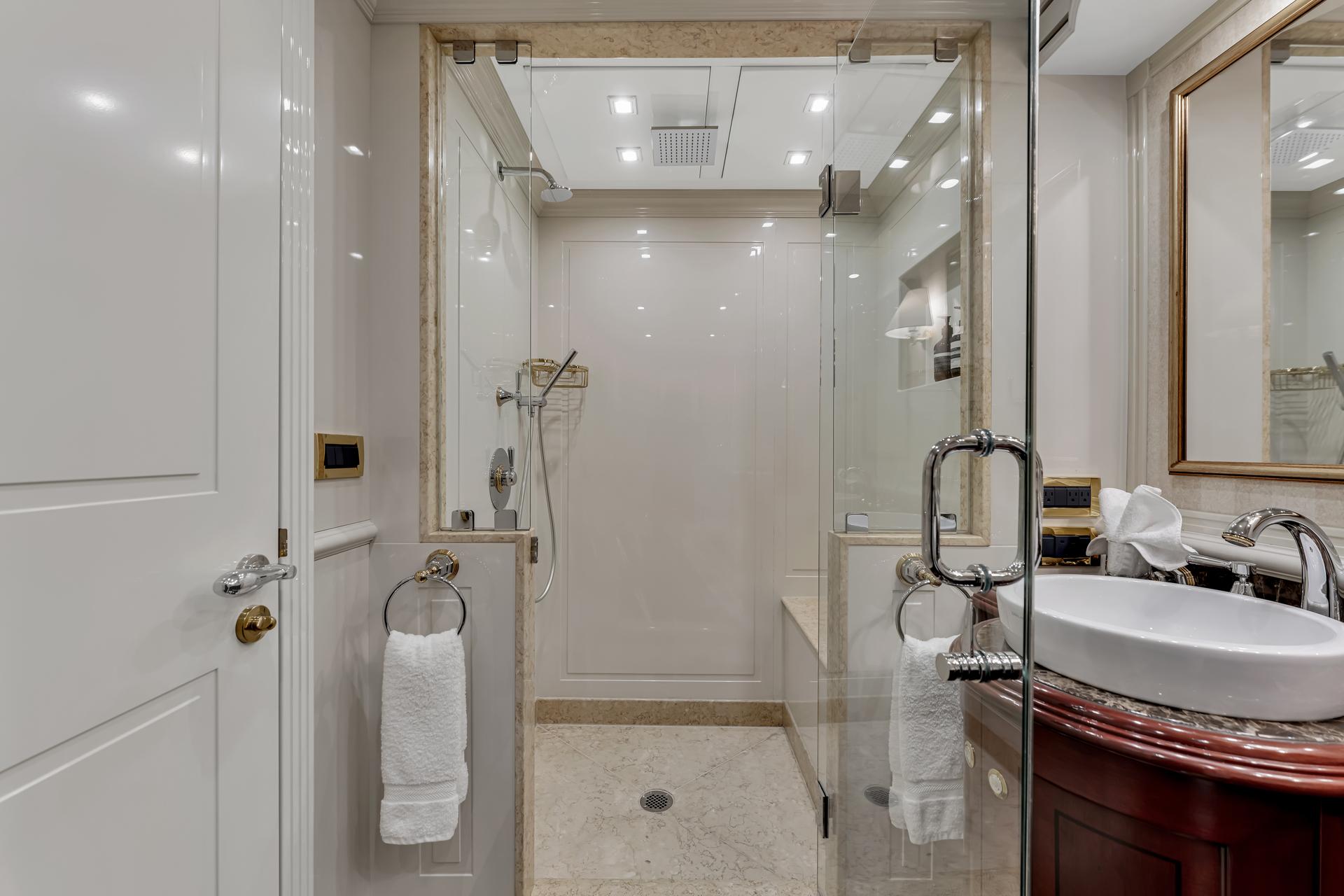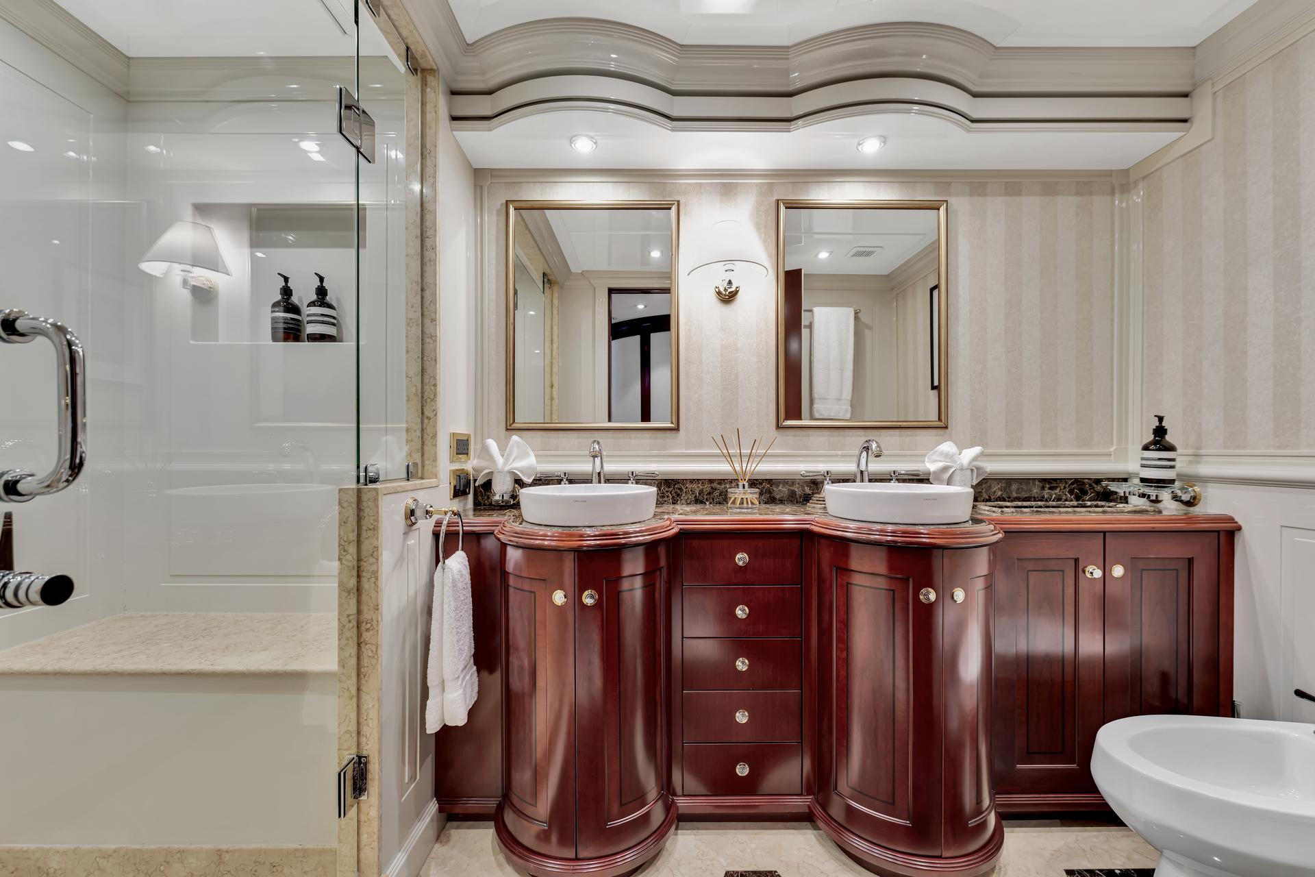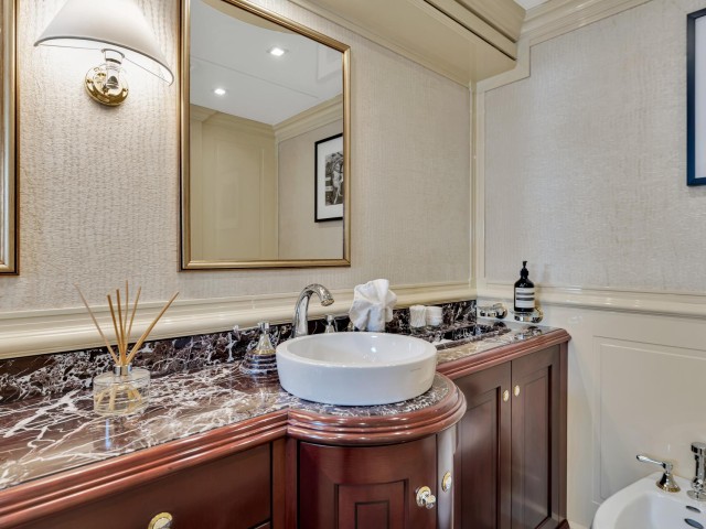 Sweet Caroline ofrece una distribución muy adaptable con siete camarotes para un máximo de 12 huéspedes, lo que proporciona un nivel de flexibilidad poco común. La suite principal de manga completa, situada en la cubierta del skylounge, es un auténtico refugio, con una cama king-size, cuarto de baño en suite con jacuzzi y ducha independiente, y acceso privado a la cubierta de popa para disfrutar de vistas panorámicas con total privacidad.