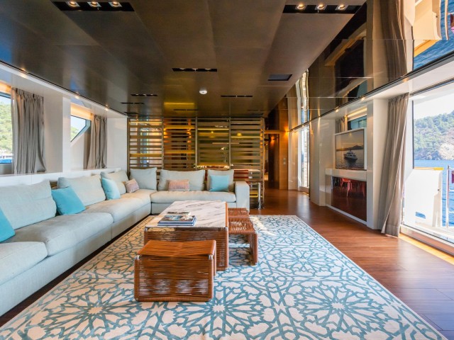 Cuando le apetezca tantear el mar, diríjase a la enorme plataforma de baño y utilice uno de los emocionantes juguetes acuáticos con los que está equipado Takara One. Después de un emocionante rato con uno de los seabobs, puede compartir sus aventuras con sus invitados mientras se relaja en la cubierta de popa con acogedores sofás, o deslizar la puerta para llegar al lujoso salón, que está inundado de luz natural gracias a los ventanales envolventes. Este espacio de vida cuenta con un sofisticado comedor formal, un bar y un magnífico mobiliario que dejará sin palabras a cualquier entusiasta del diseño. Otra zona interior de la que dispone este yate de lujo es el skylounge, con una enorme televisión de plasma, donde podrá organizar noches de cine con sus amigos y familiares.