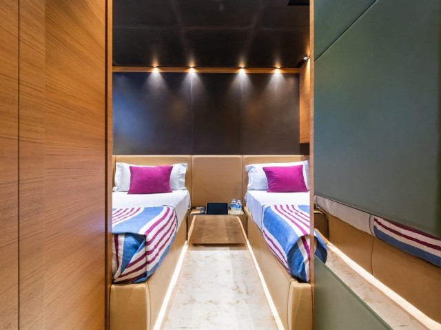 Takara One ofrece la máxima comodidad para 12 invitados en 5 camarotes cuidadosamente equipados. El camarote principal tiene un aspecto exclusivo gracias a su innovador mobiliario, paredes de espejo y un elegante baño para mimarse después de largos días en el mar. La suite VIP tiene una paleta creativa, utilizada artísticamente para proporcionar un entorno impresionante para los días de descanso.