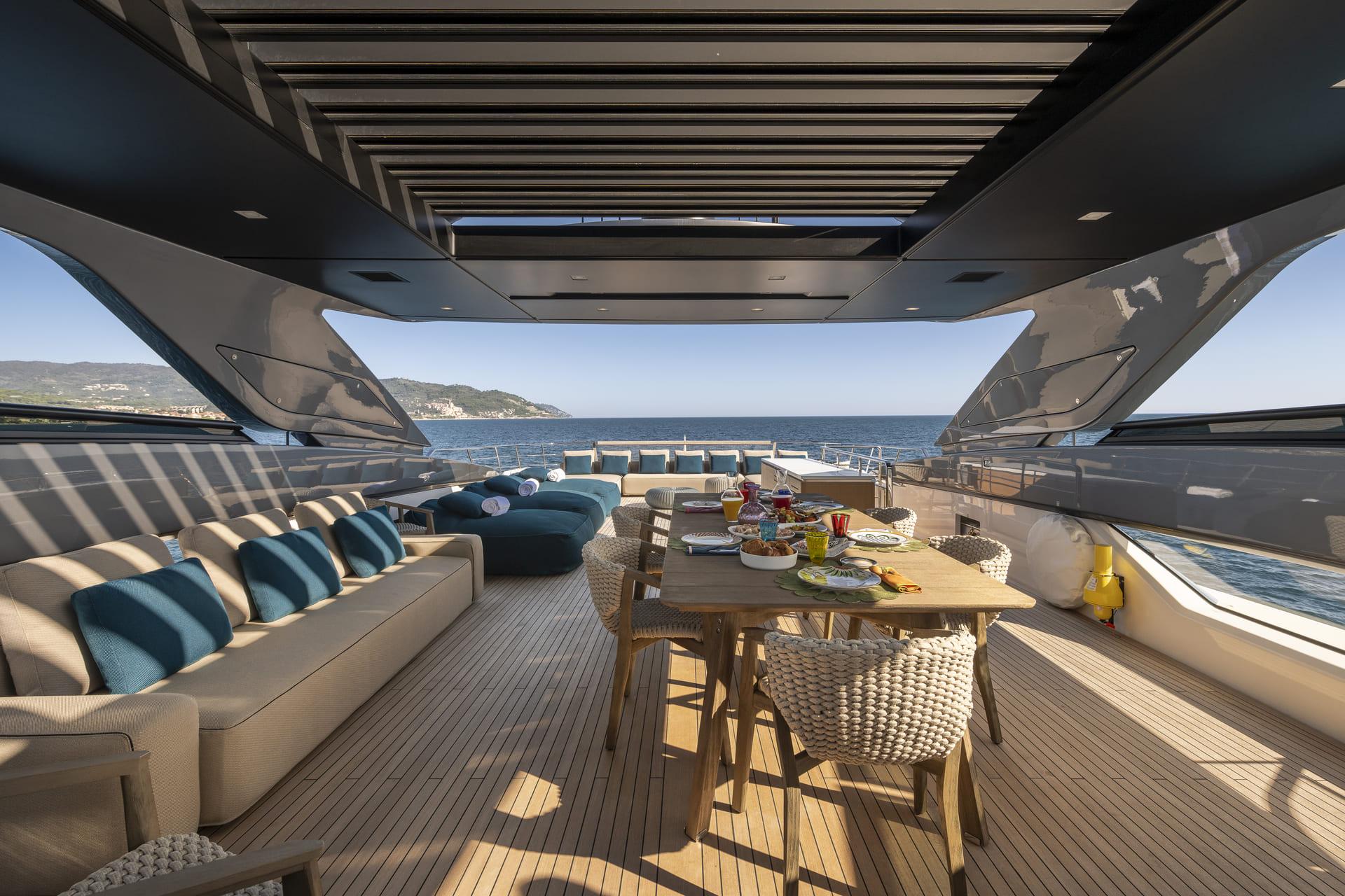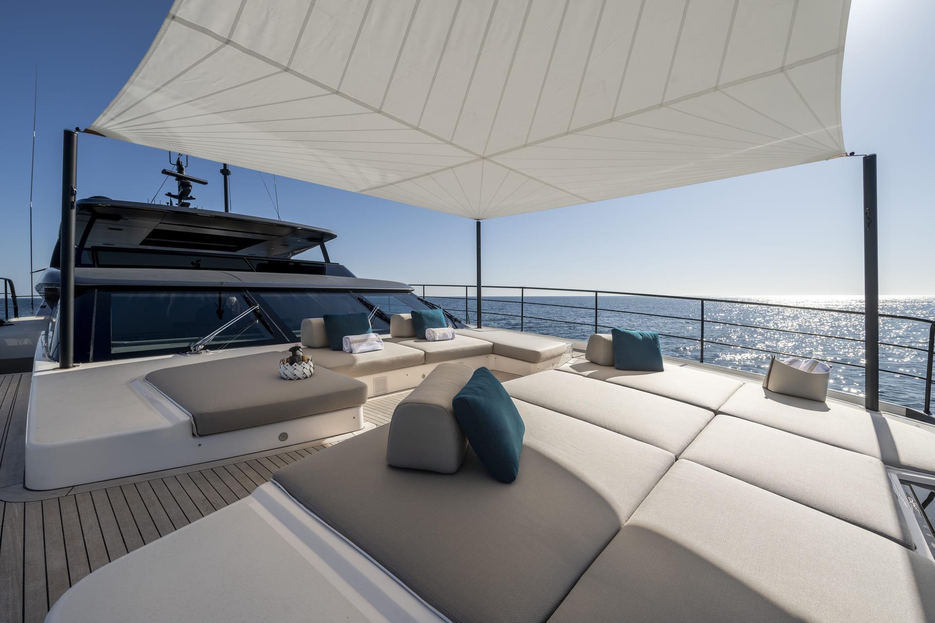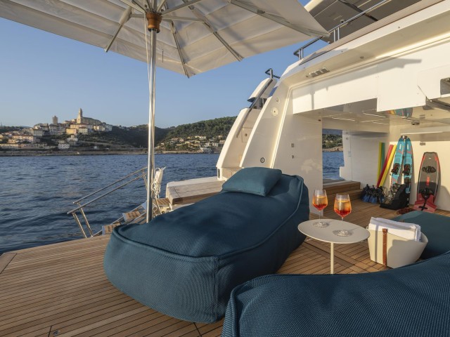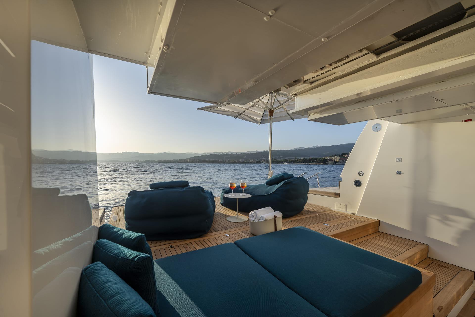 Las cubiertas exteriores ofrecen distintos ambientes a lo largo del día. La popa cuenta con una zona protegida y cómoda para comidas al aire libre, mientras que la proa dispone de amplias áreas de solárium.