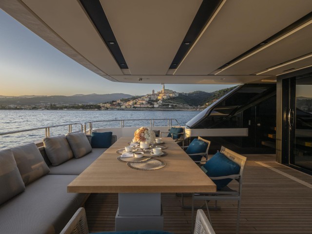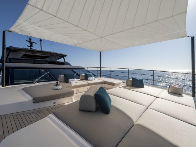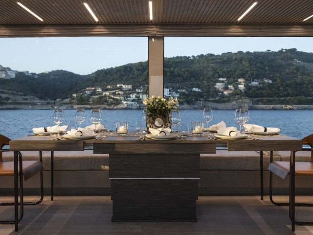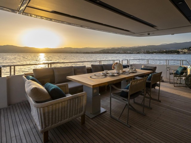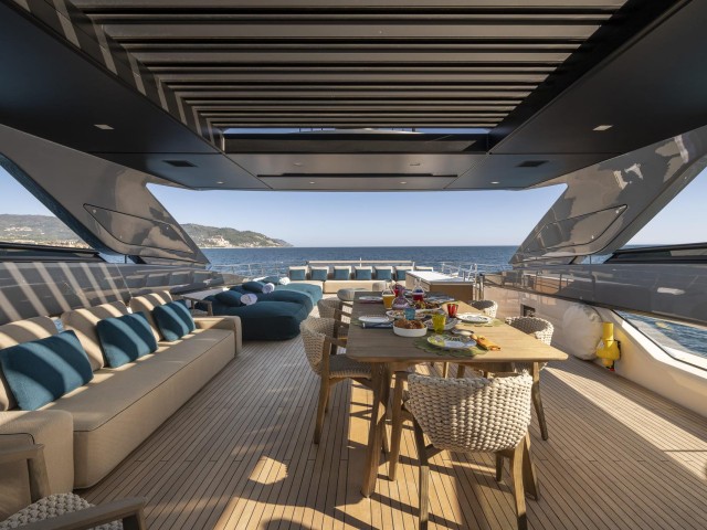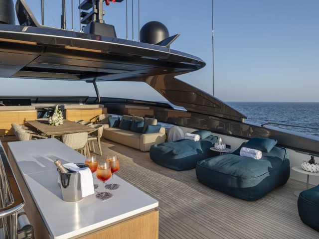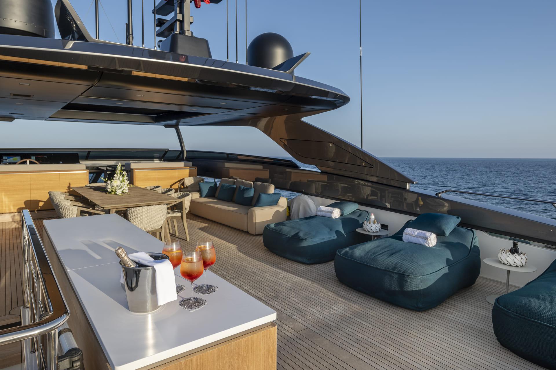 Las cubiertas exteriores ofrecen distintos ambientes a lo largo del día. La popa cuenta con una zona protegida y cómoda para comidas al aire libre, mientras que la proa dispone de amplias áreas de solárium.