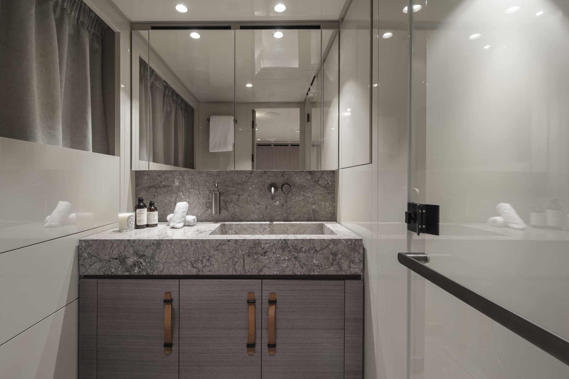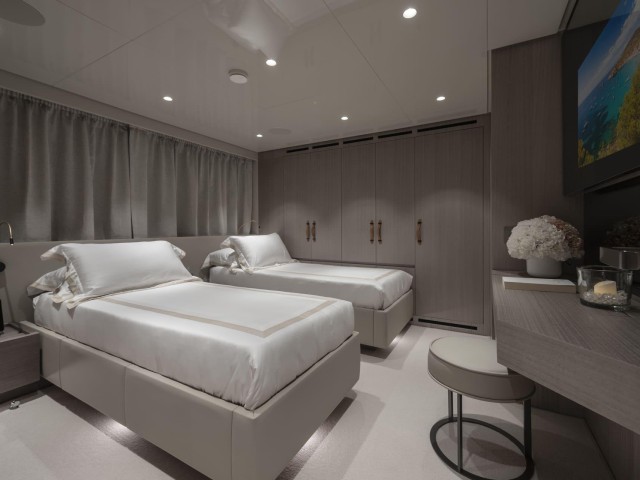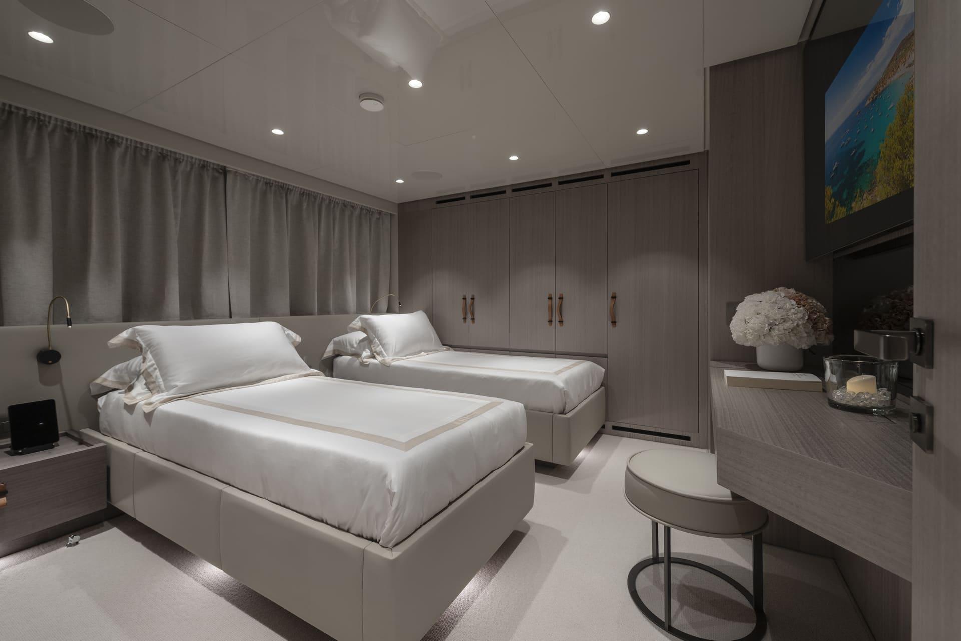 En la cubierta inferior se encuentran dos cabinas VIP y dos cabinas convertibles que pueden configurarse como dobles o twin, adaptándose fácilmente a diferentes grupos. Todas cuentan con baño en suite y detalles de calidad como secadores Dyson.