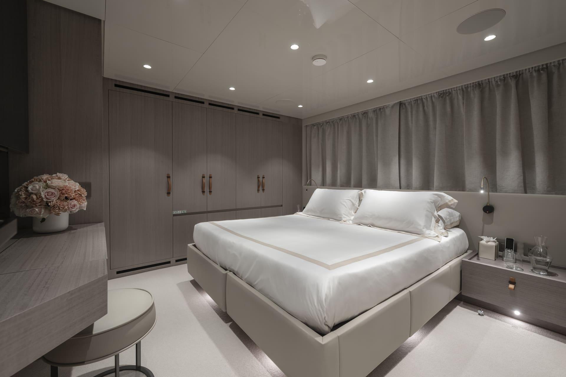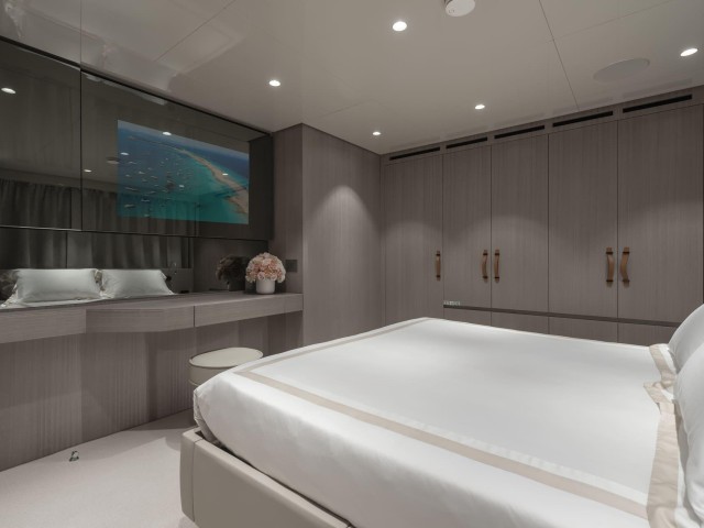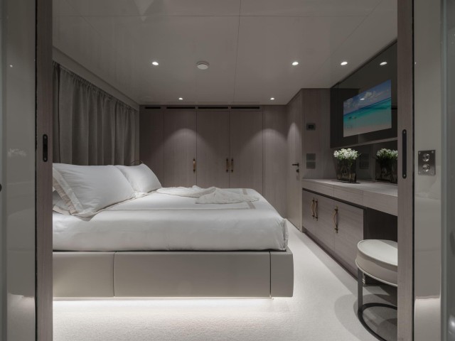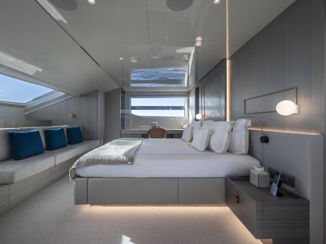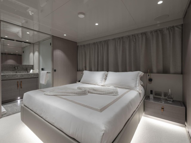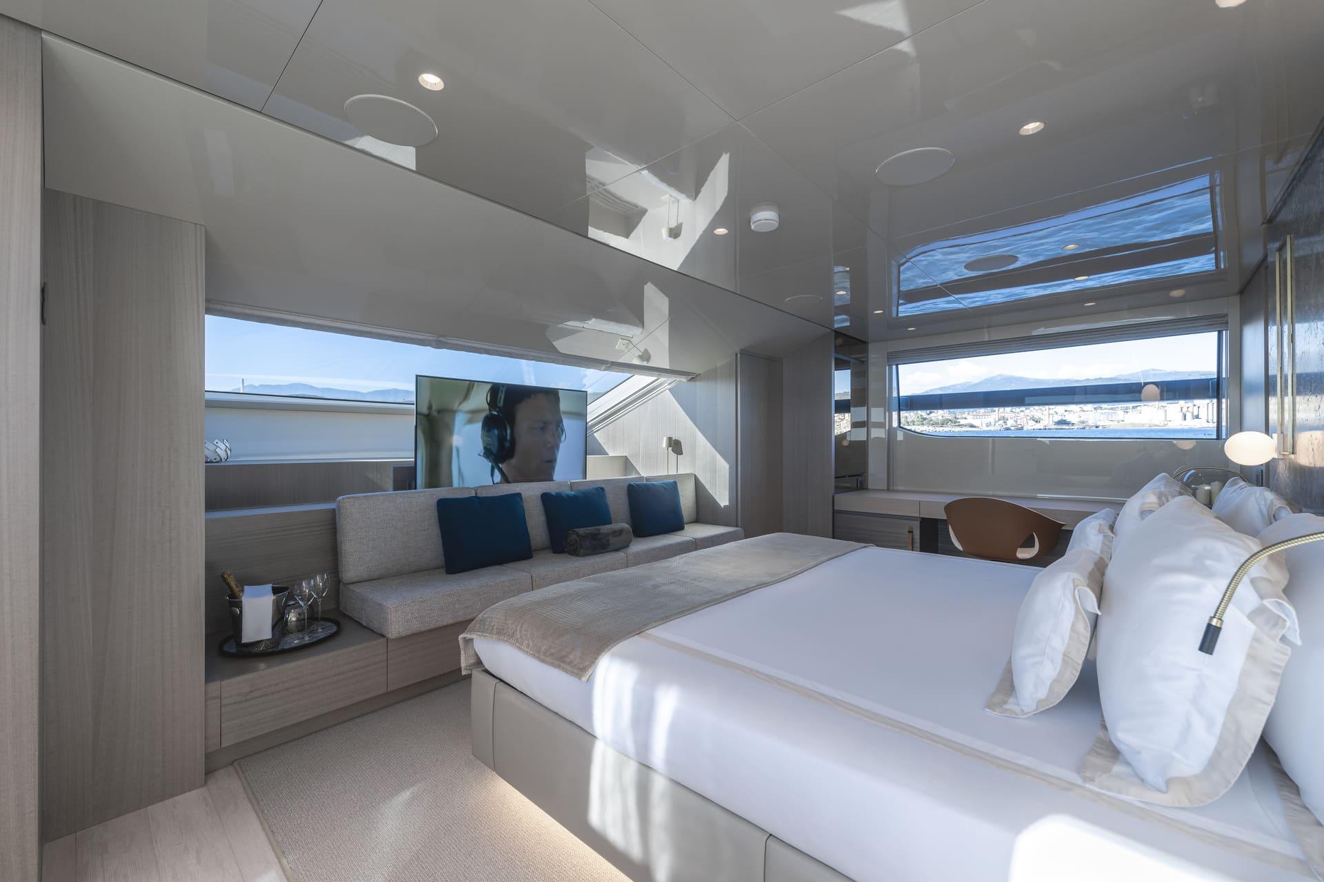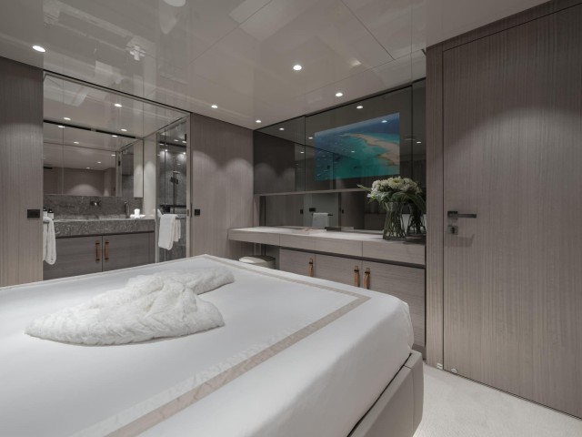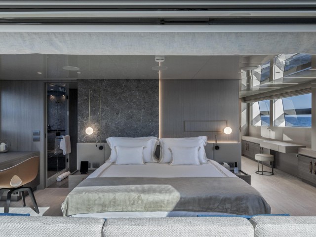 La suite principal, situada en la cubierta principal, destaca por sus amplios ventanales, vestidor y acceso directo a la proa, creando un espacio luminoso y privado con vistas al mar.