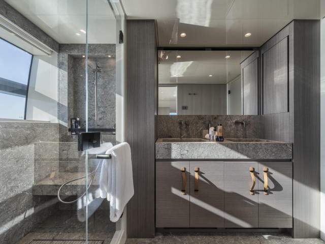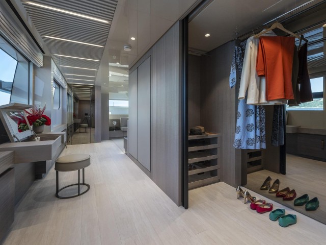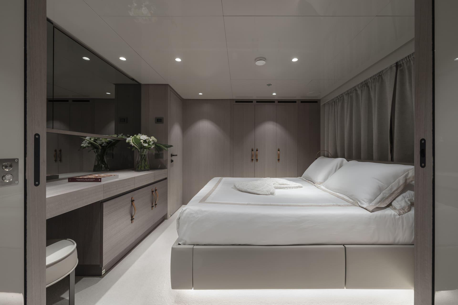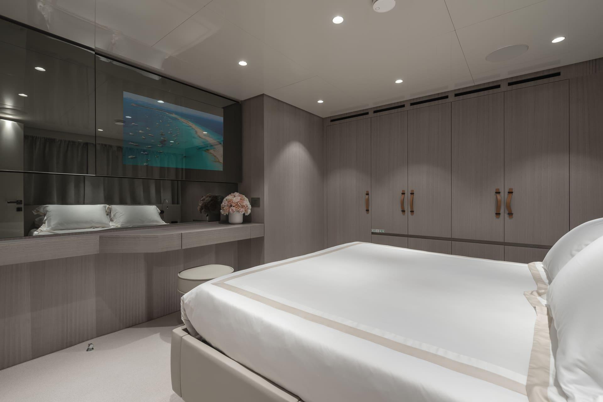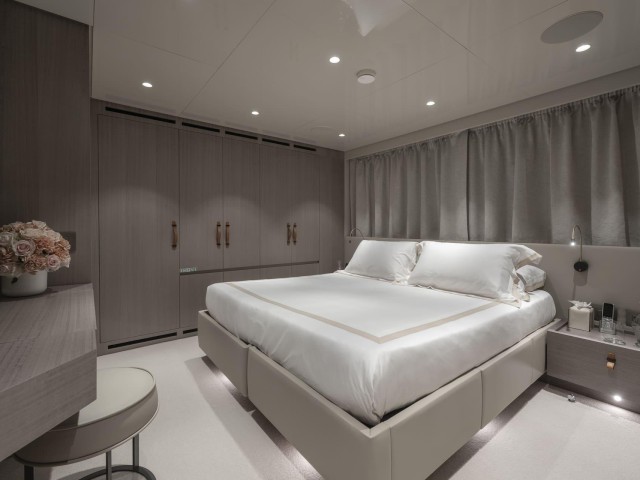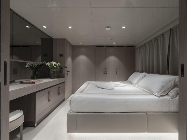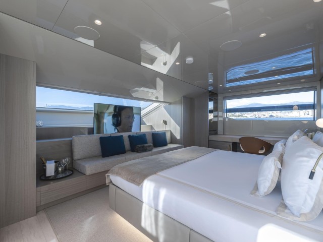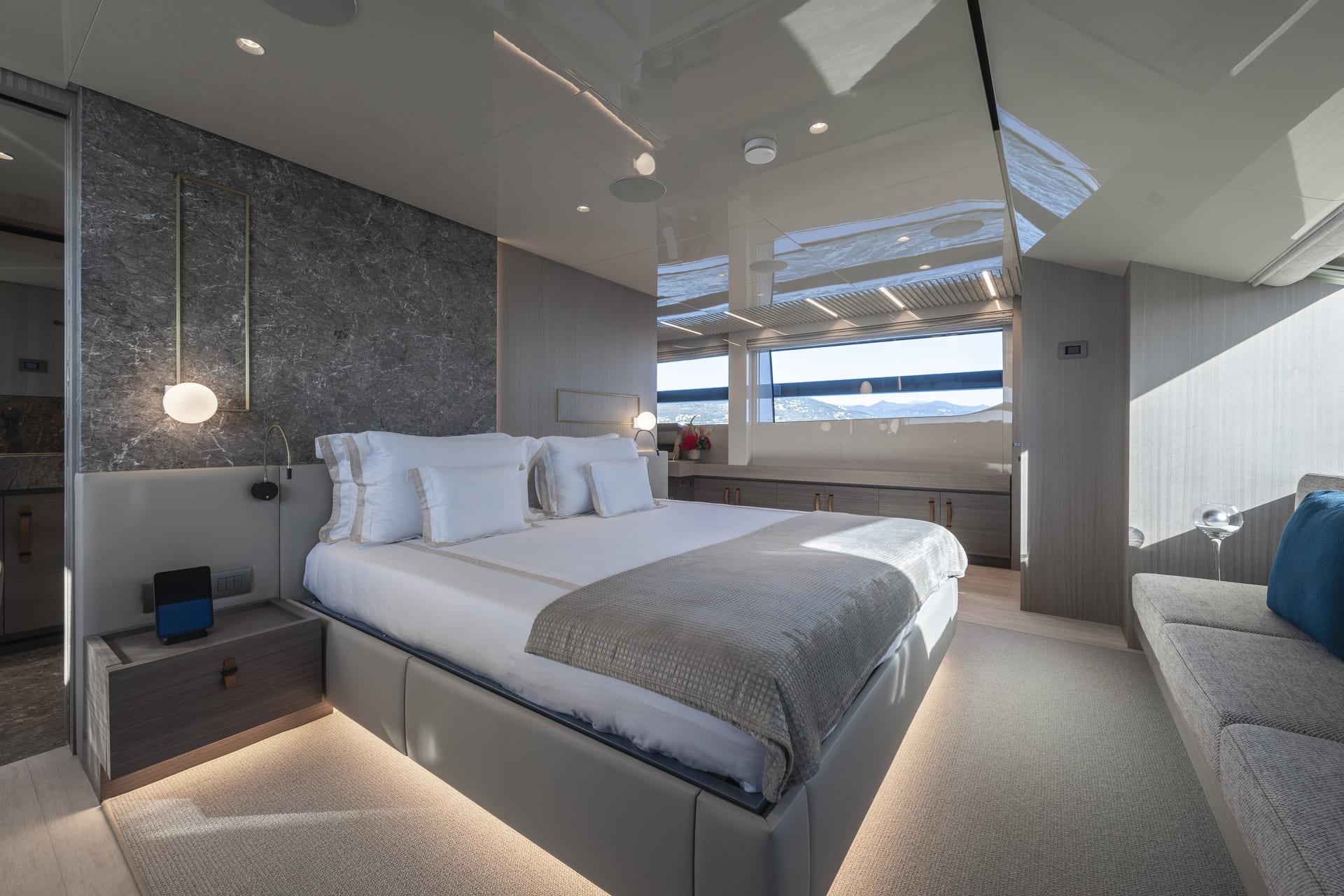 La suite principal, situada en la cubierta principal, destaca por sus amplios ventanales, vestidor y acceso directo a la proa, creando un espacio luminoso y privado con vistas al mar.