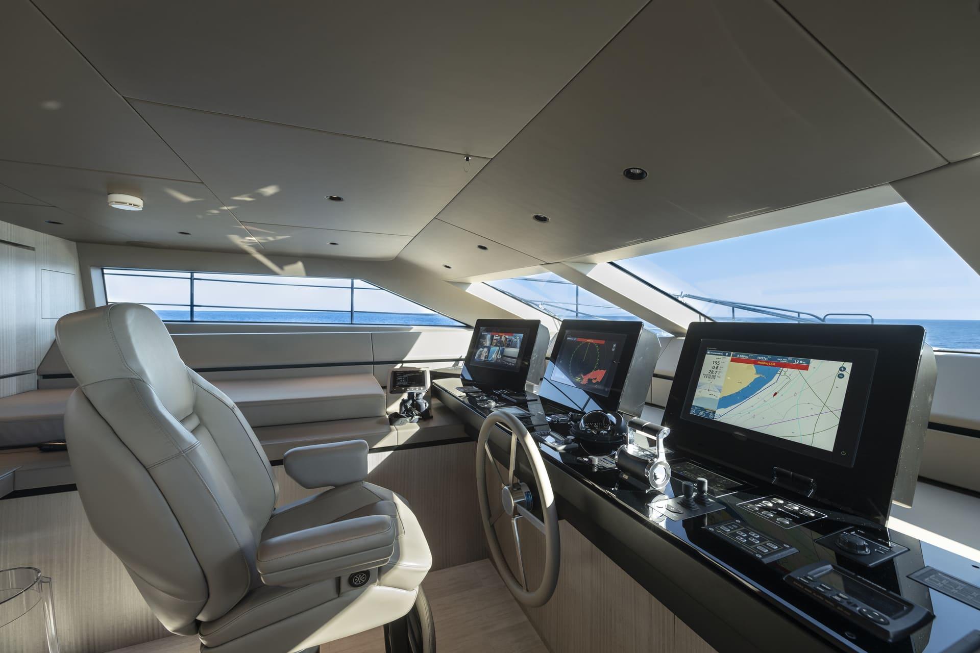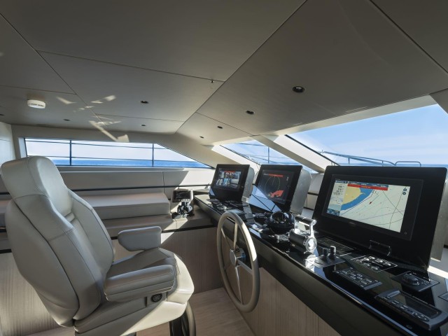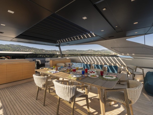 El flybridge es un espacio versátil con comedor para ocho invitados, parrilla Teppanyaki, tumbonas y un segundo puesto de mando, ideal tanto para relajarse como para socializar.