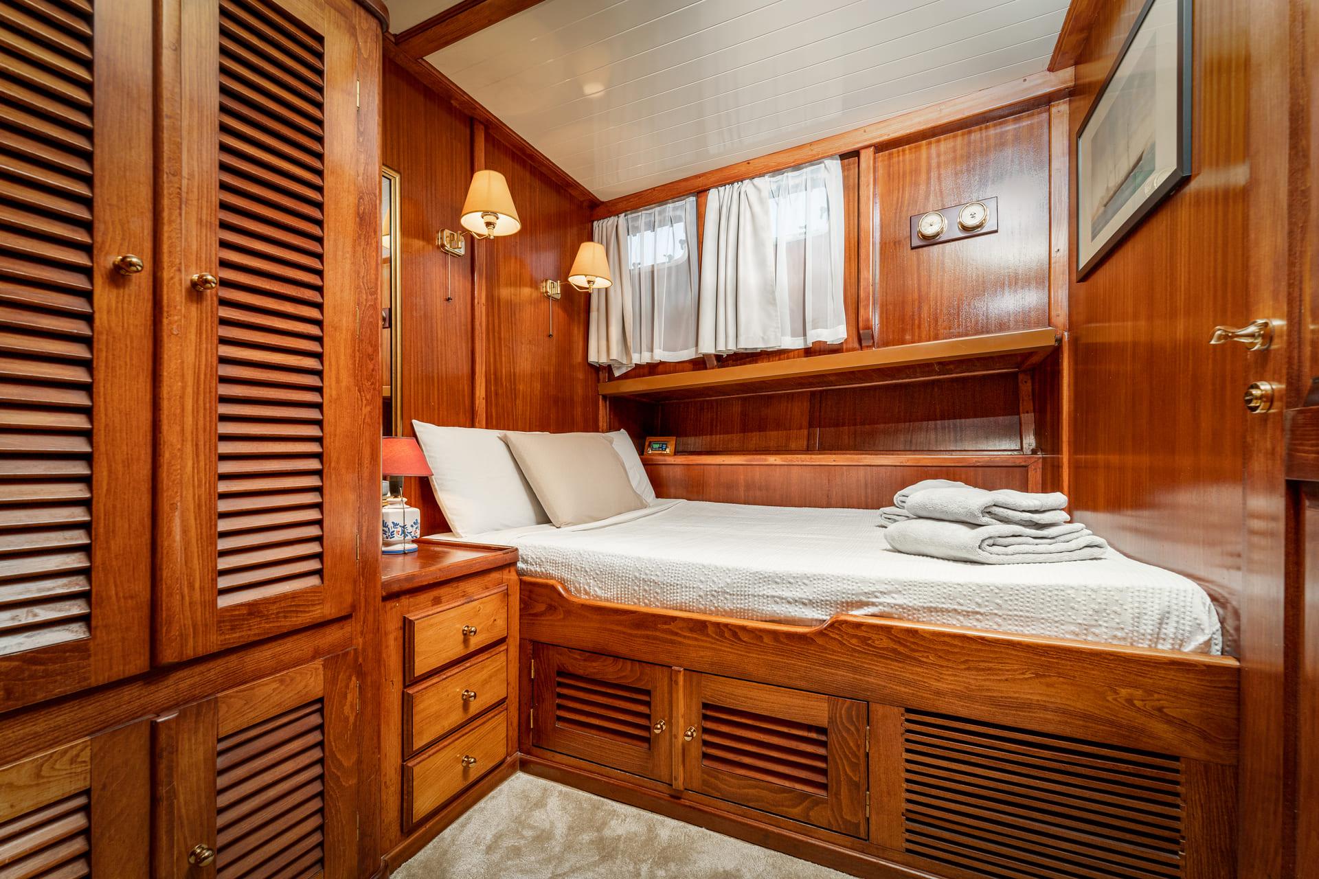 Each cabin is equipped with practical comforts including air conditioning, hairdryers, bathrobes and quality amenities, ensuring a pleasant stay on board. The configuration works well for families, groups of friends or mixed charters, offering both flexibility and space.