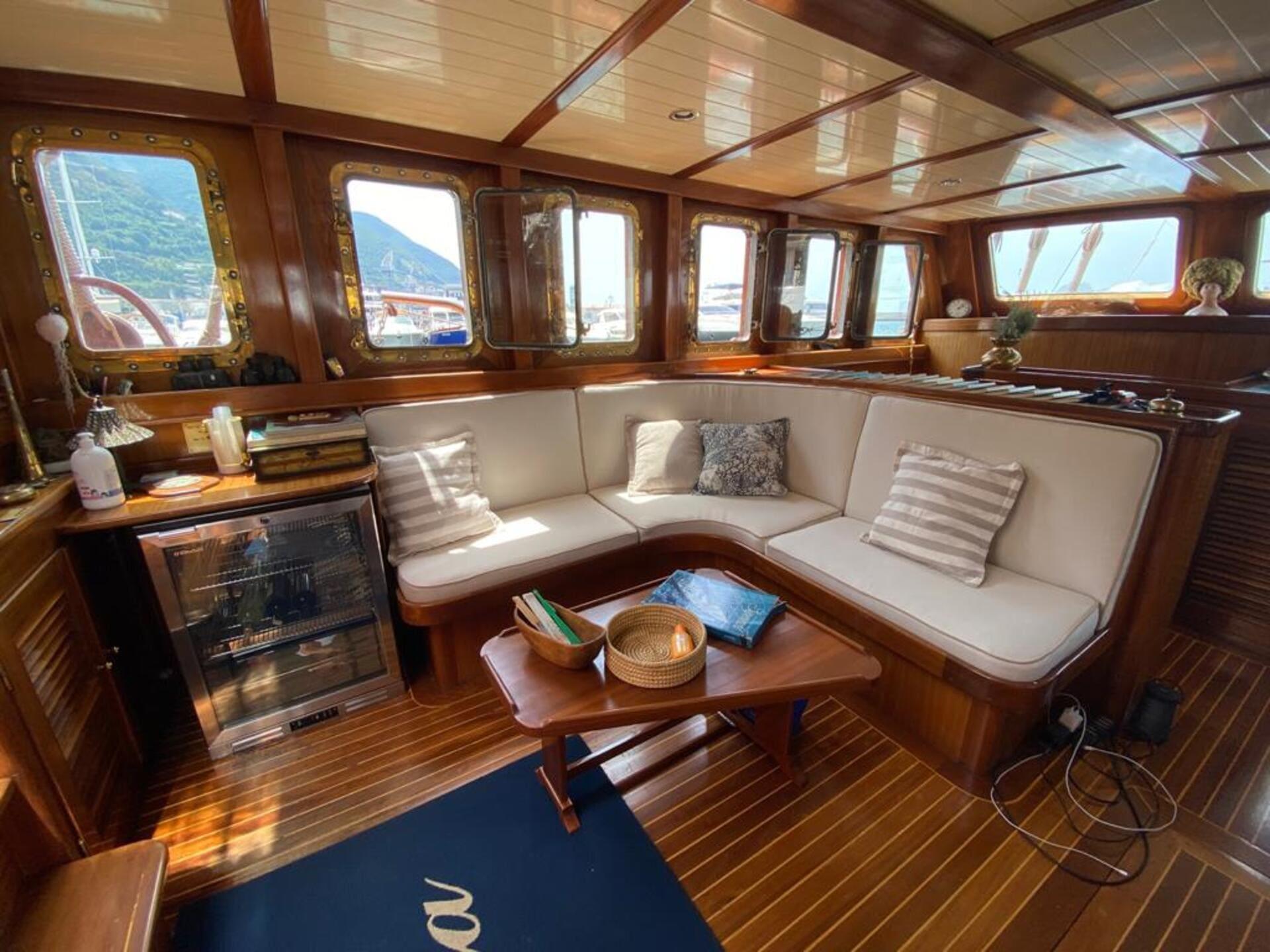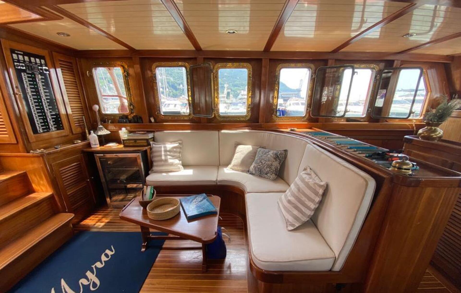 Inside, Myra’s interior reflects her classic heritage, with warm wood finishes and a relaxed, homely atmosphere. The raised deckhouse salon is filled with natural light through large windows, offering panoramic views of the surroundings.