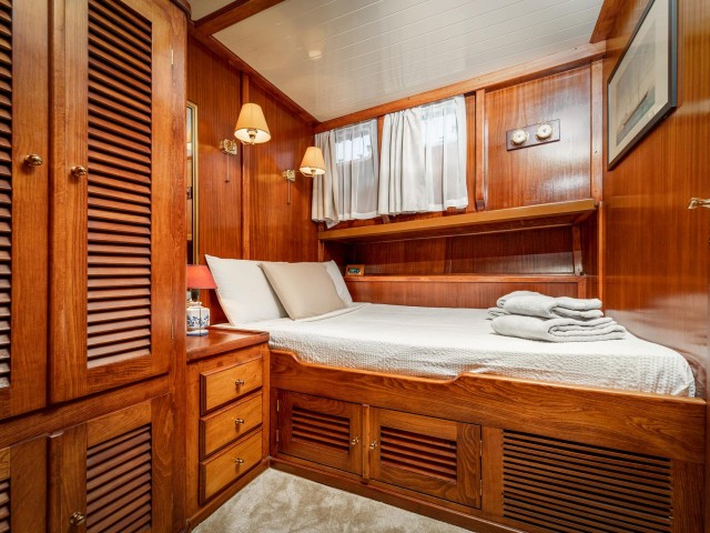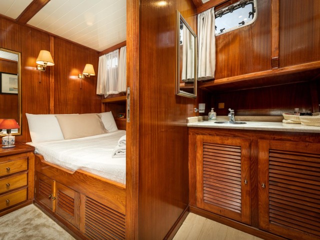 Myra accommodates up to 12 guests in six well-appointed cabins, all with private ensuite bathrooms. The layout is thoughtfully arranged, with two twin cabins located aft, each featuring four single beds. In the central section, two VIP cabins offer comfortable double beds, while forward, two additional double cabins provide a cosy and slightly more intimate setting.