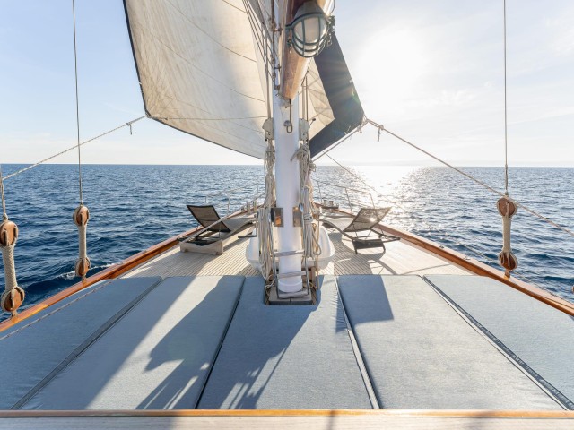 Life on board Myra is centred around her generous outdoor areas. The aft deck offers a shaded dining space beneath a permanent bimini, along with comfortable seating and sunbeds facing the sea. Forward, additional sunbathing areas provide the perfect place to relax under the sun or enjoy the breeze while sailing. Wide side decks and high railings ensure easy and safe movement around the yacht at all times.