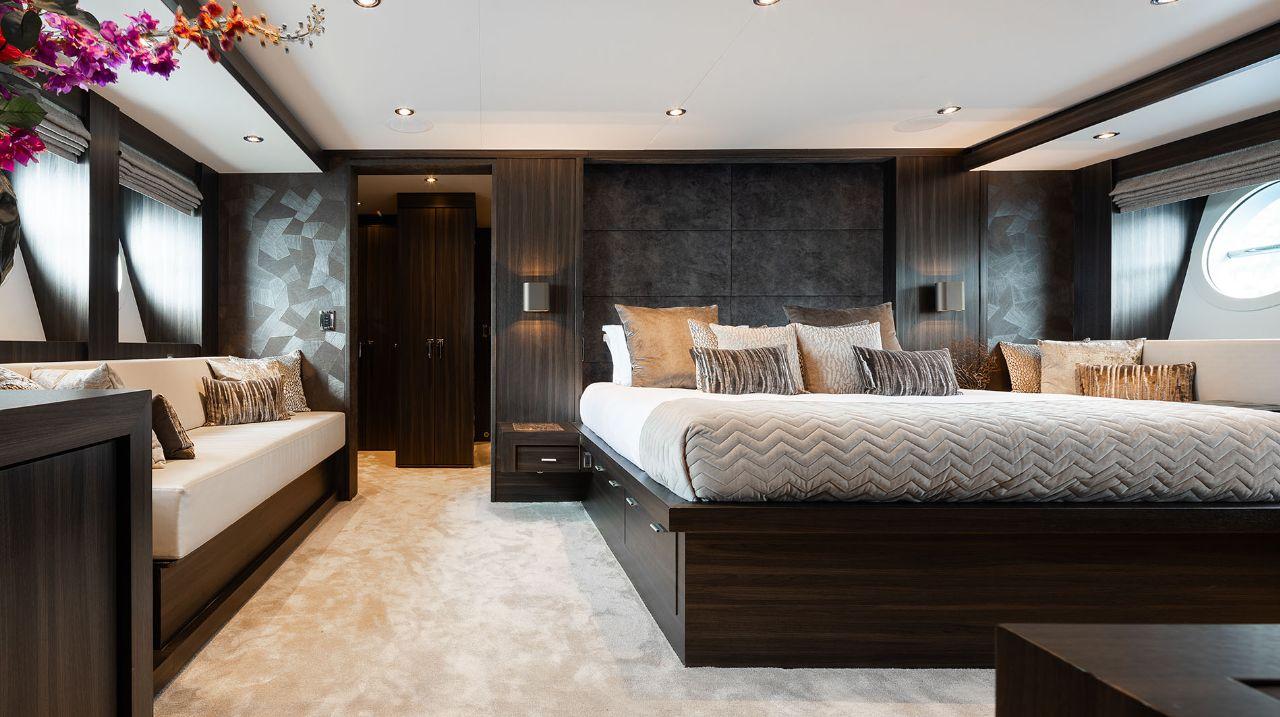 The 2022 refit brought a modern interior design, pairing dark woods with marble and velvet for a sophisticated yet cozy ambiance. The elegant main salon offers ample space for relaxation, while the exterior lounge and flybridge provide elevated views and a perfect setting for outdoor entertainment. The swim platform at the aft ensures easy access to the water, while underwater lights create a stunning atmosphere at night.