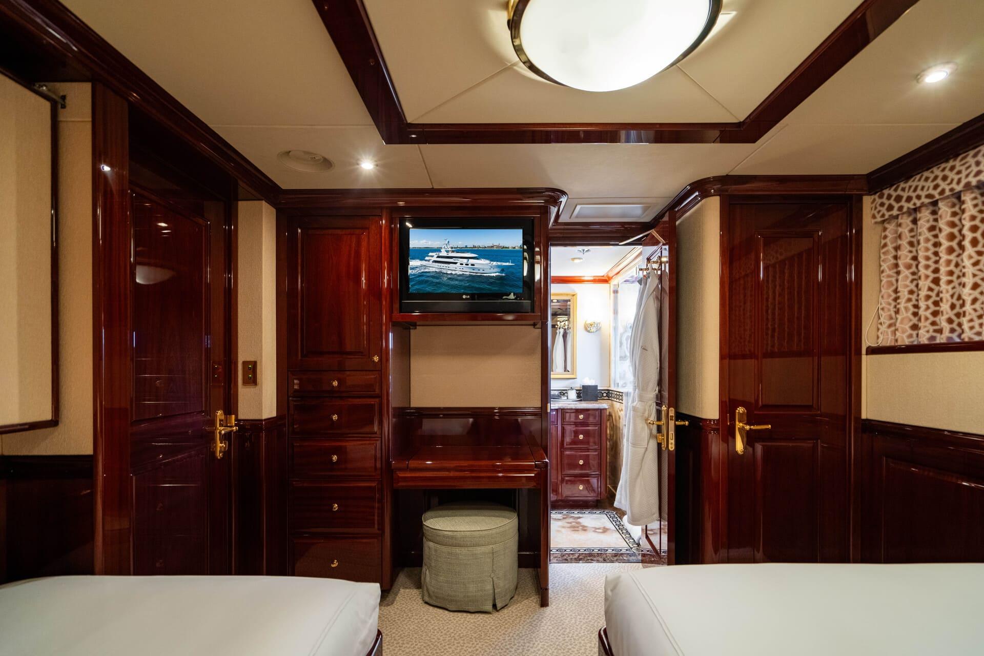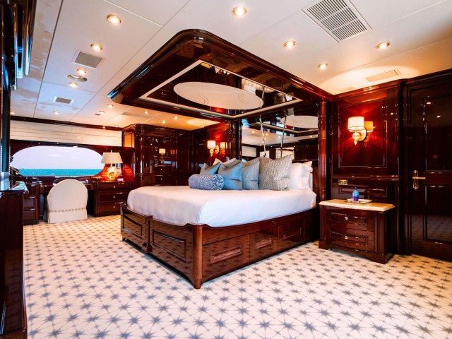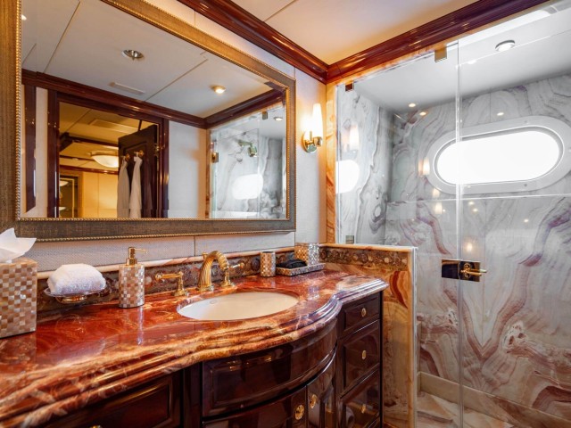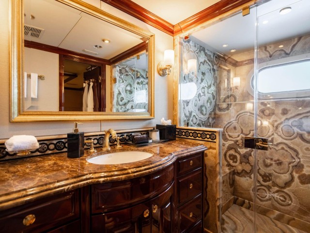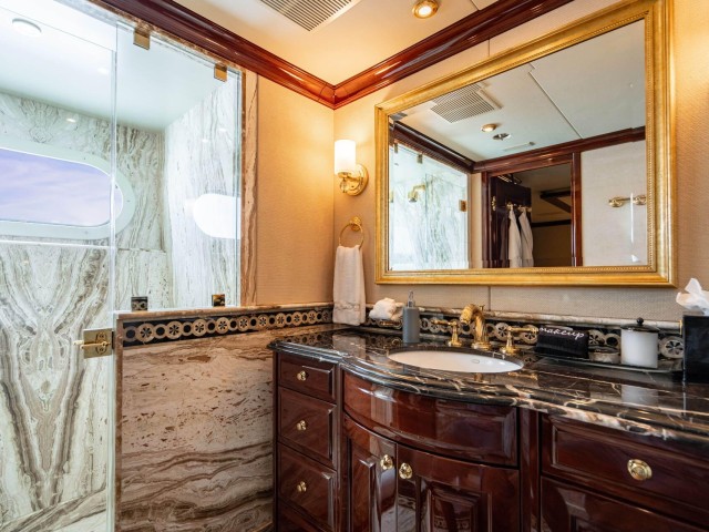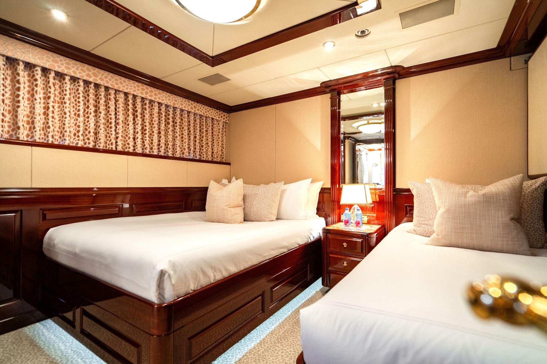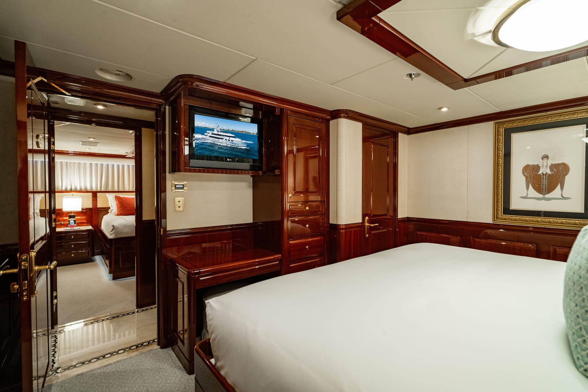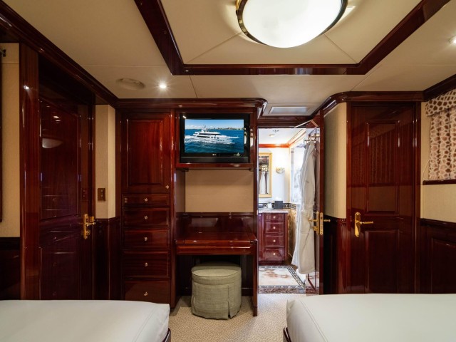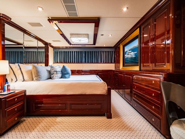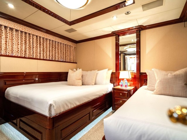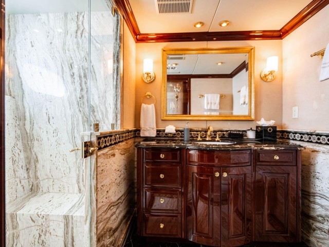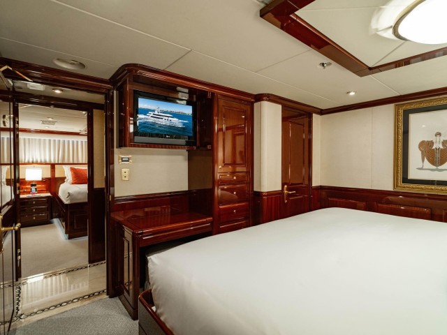 Lady Elaine’s six staterooms are designed as private retreats, each offering ensuite bathrooms, individual climate control, blackout drapes, and a full suite of modern conveniences. Guests enjoy Kaleidescape entertainment, Crestron controls, satellite television, and high-speed Wi-Fi, ensuring complete comfort day and night. Fine details such as robes, slippers, reading lights, and refined finishes create a welcoming atmosphere that feels both luxurious and relaxed.