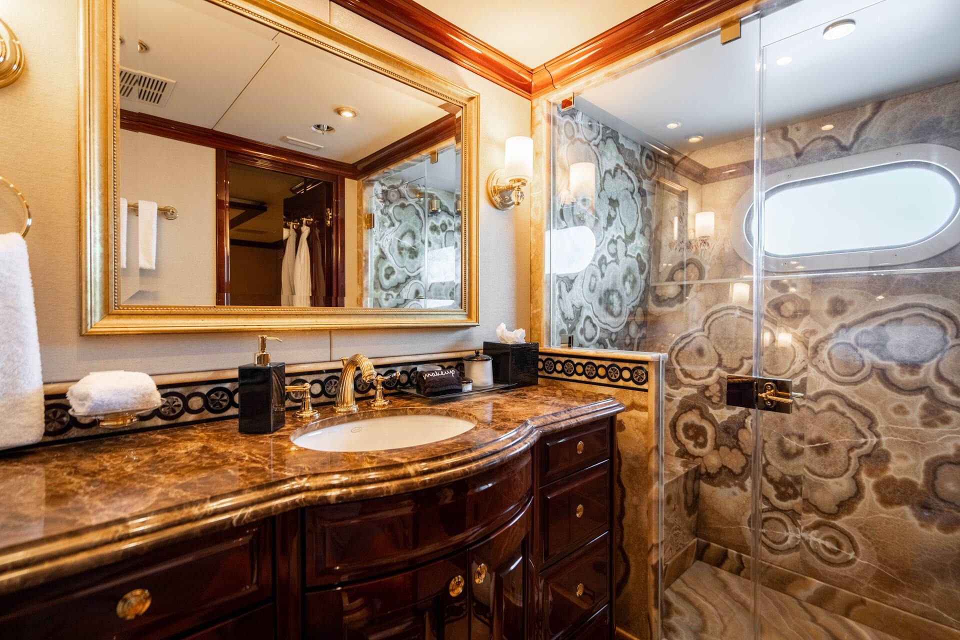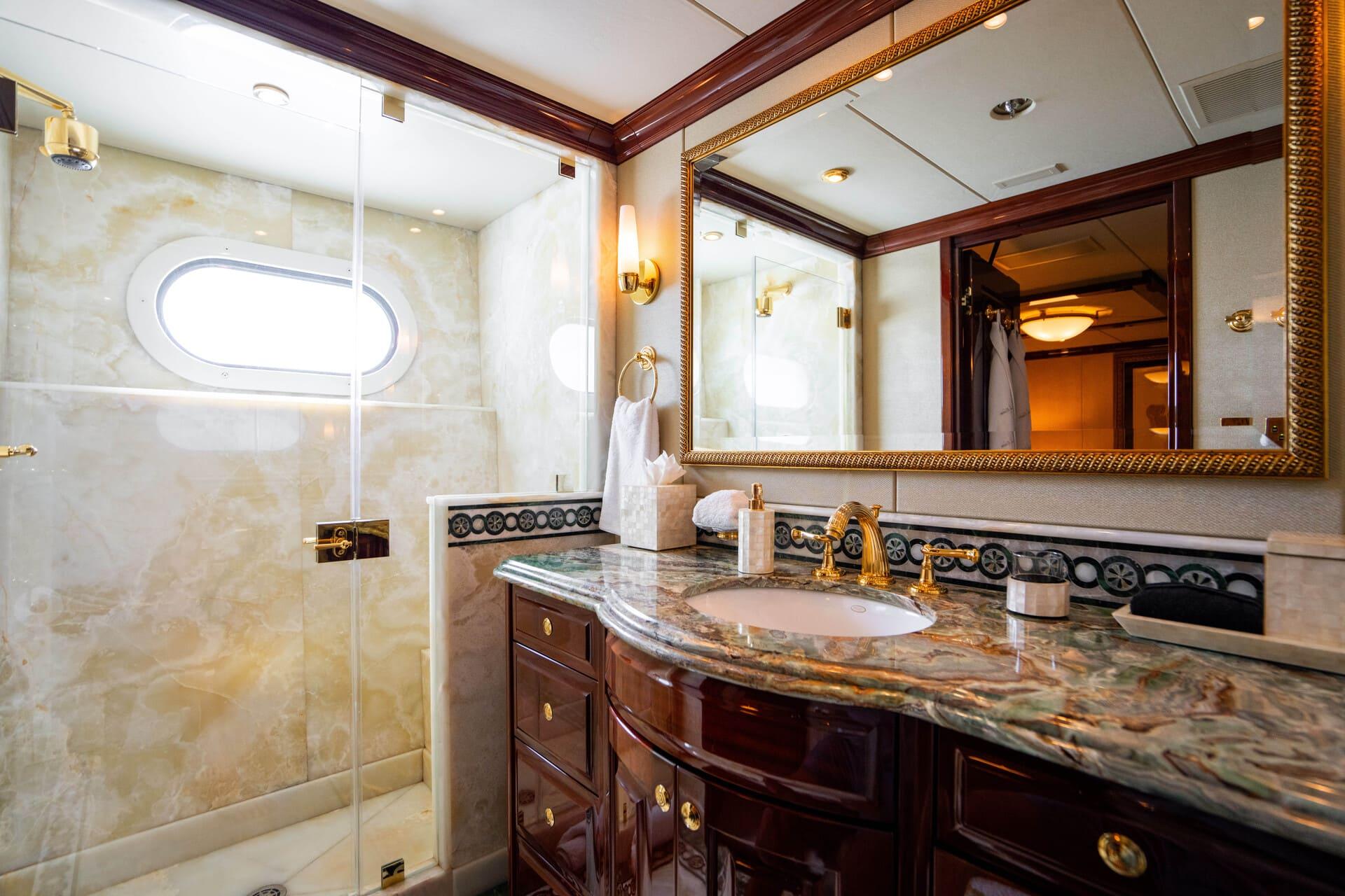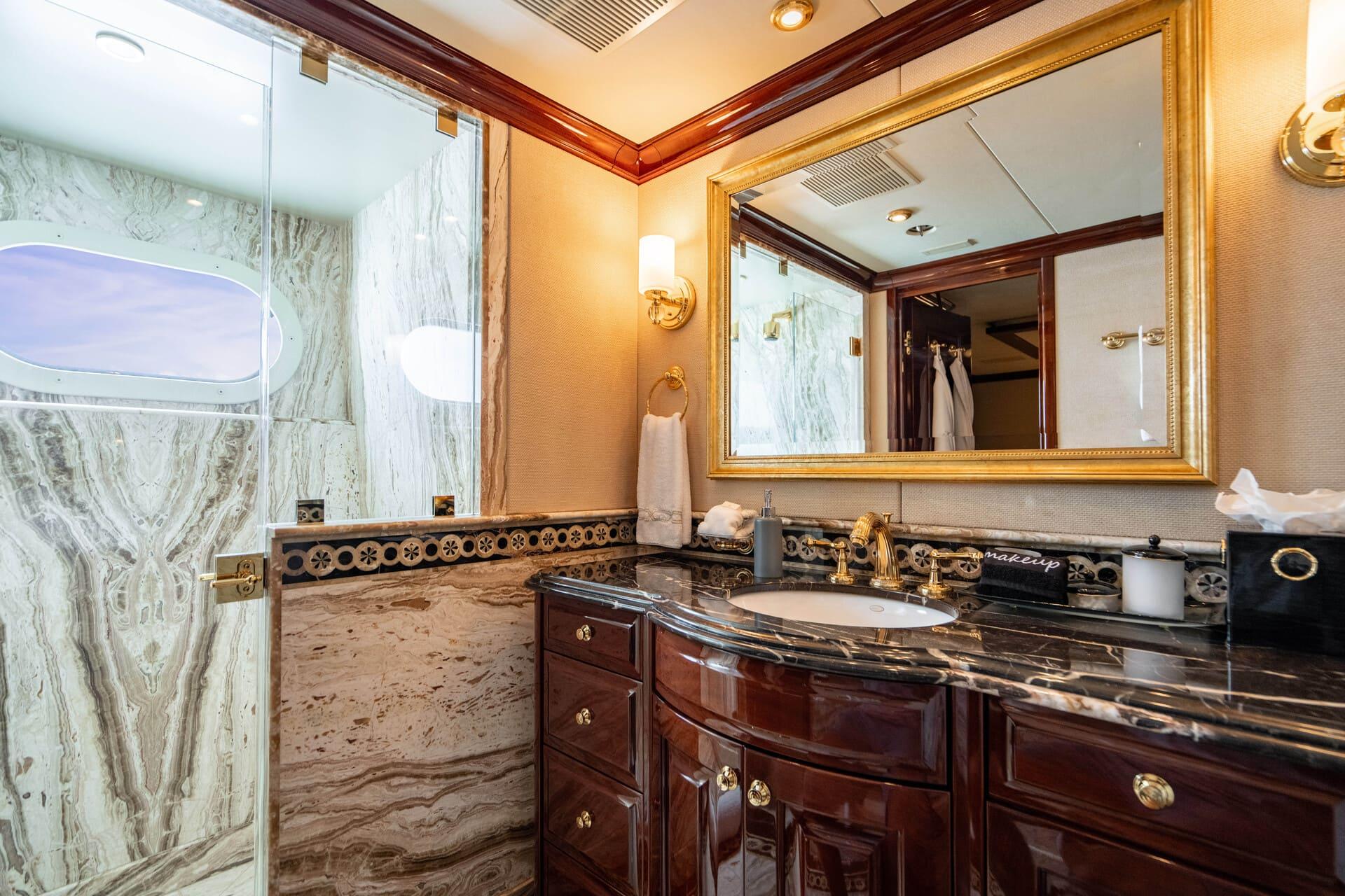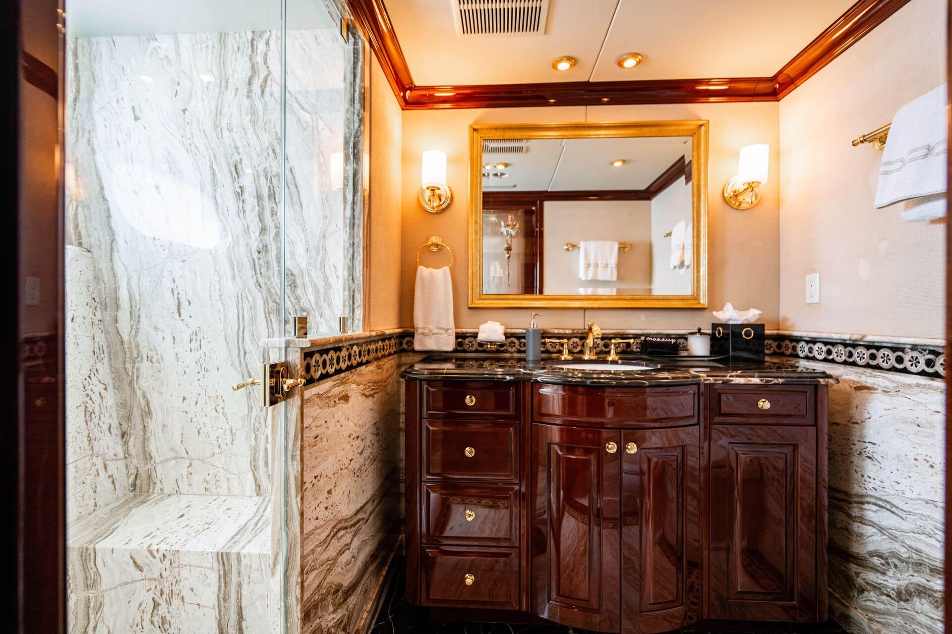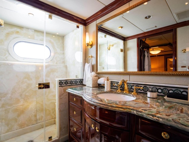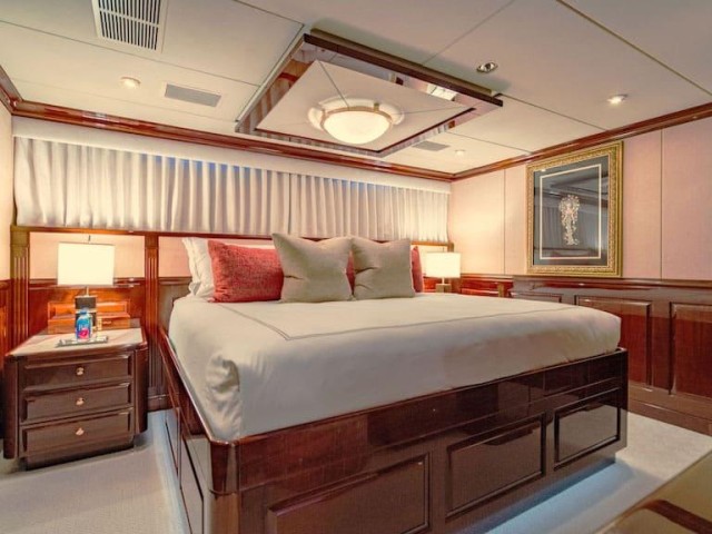 Lady Elaine’s six staterooms are designed as private retreats, each offering ensuite bathrooms, individual climate control, blackout drapes, and a full suite of modern conveniences. Guests enjoy Kaleidescape entertainment, Crestron controls, satellite television, and high-speed Wi-Fi, ensuring complete comfort day and night. Fine details such as robes, slippers, reading lights, and refined finishes create a welcoming atmosphere that feels both luxurious and relaxed.
