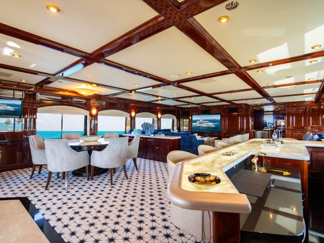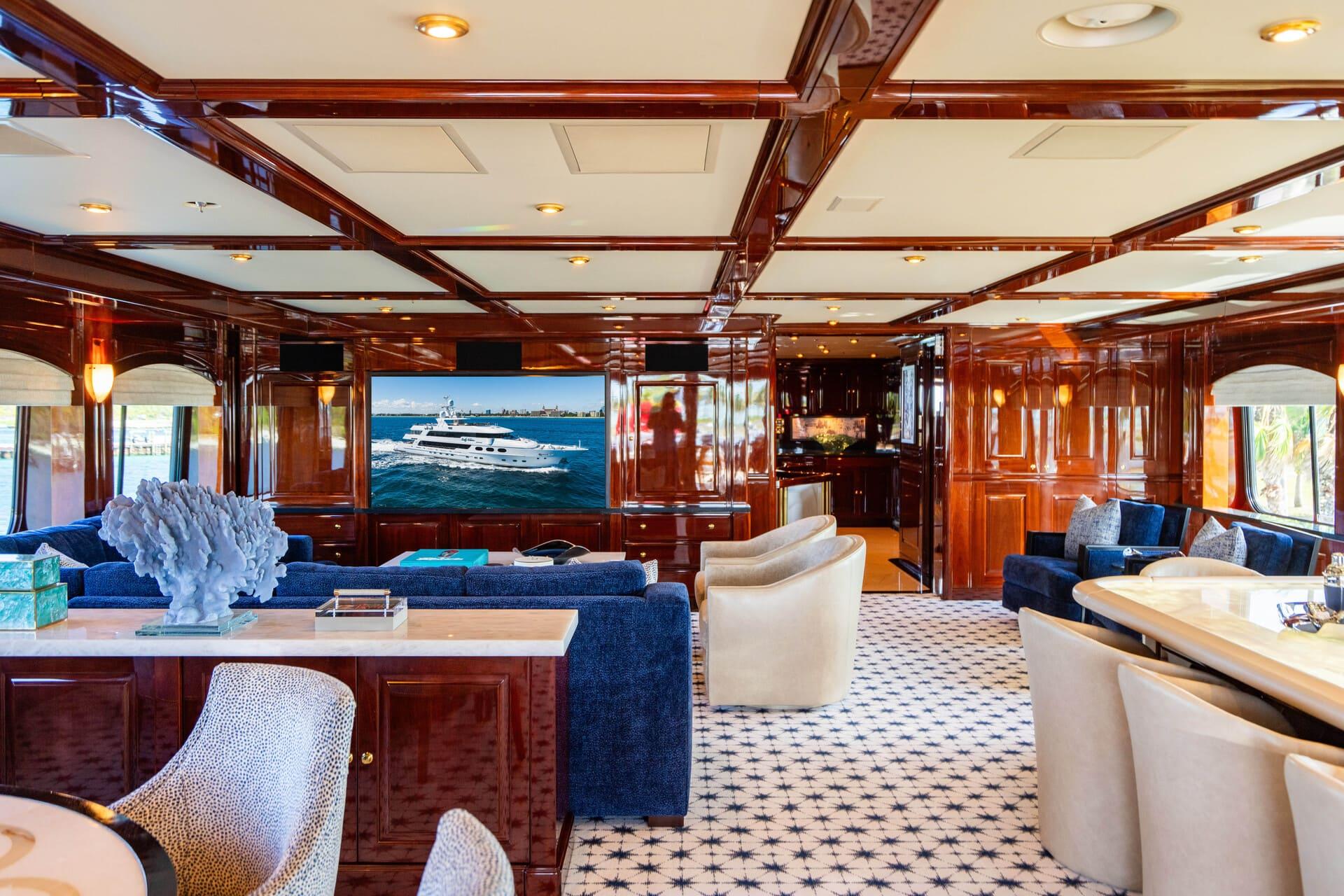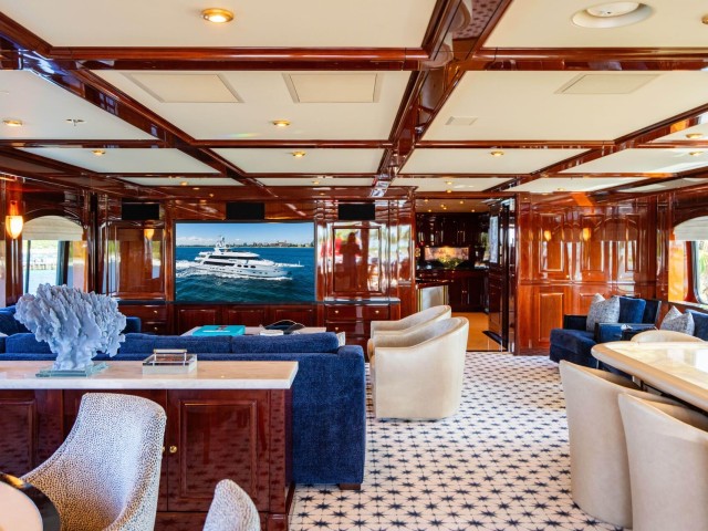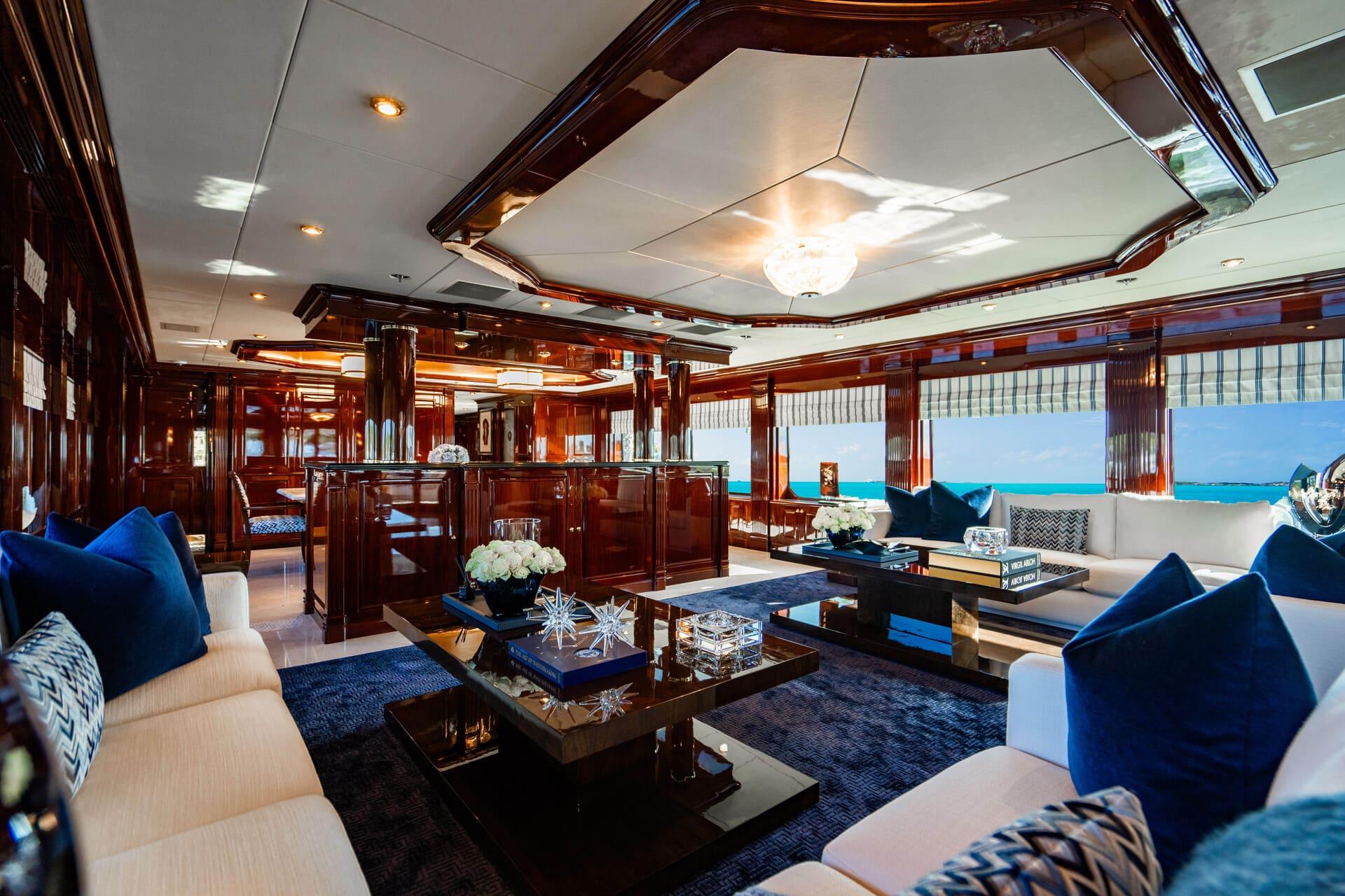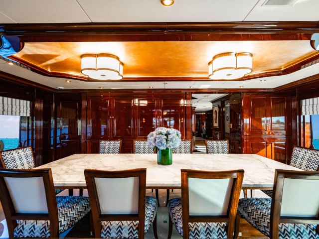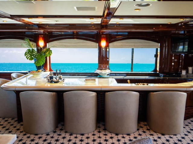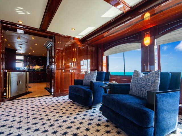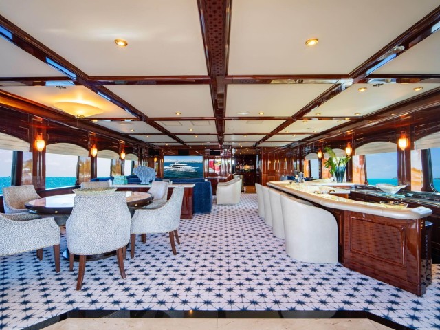 Life aboard Lady Elaine flows effortlessly from one space to the next. The main salon is opulent yet inviting, featuring generous lounge areas and a striking double-sided television that elegantly separates the salon from the formal dining room. This refined dining space welcomes twelve guests for unforgettable meals, framed by a graceful foyer that sets the tone upon arrival. Above, the skylounge offers a glamorous social setting with plush seating, panoramic views, and a stunning illuminated onyx bar that instantly becomes the heart of evening gatherings.